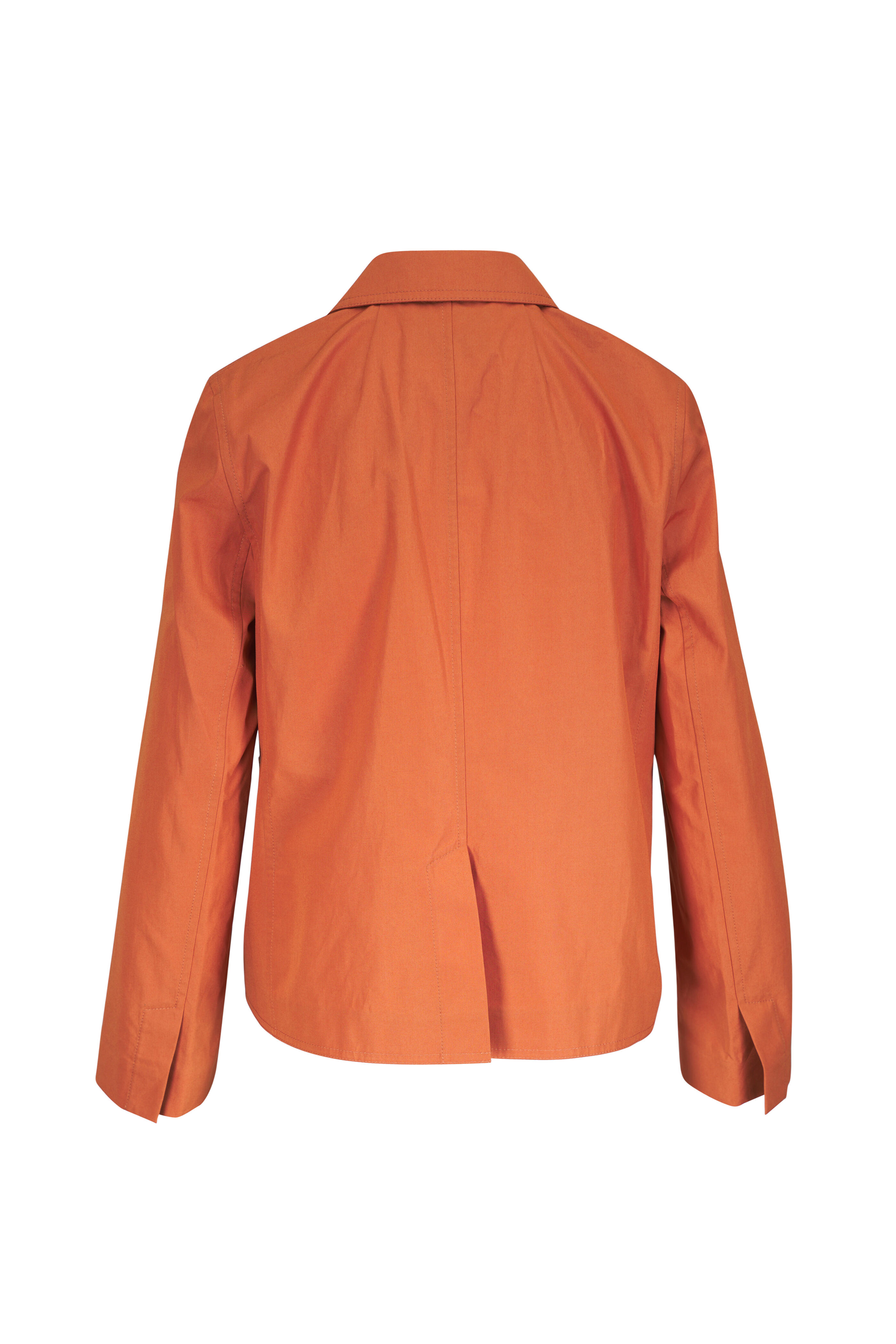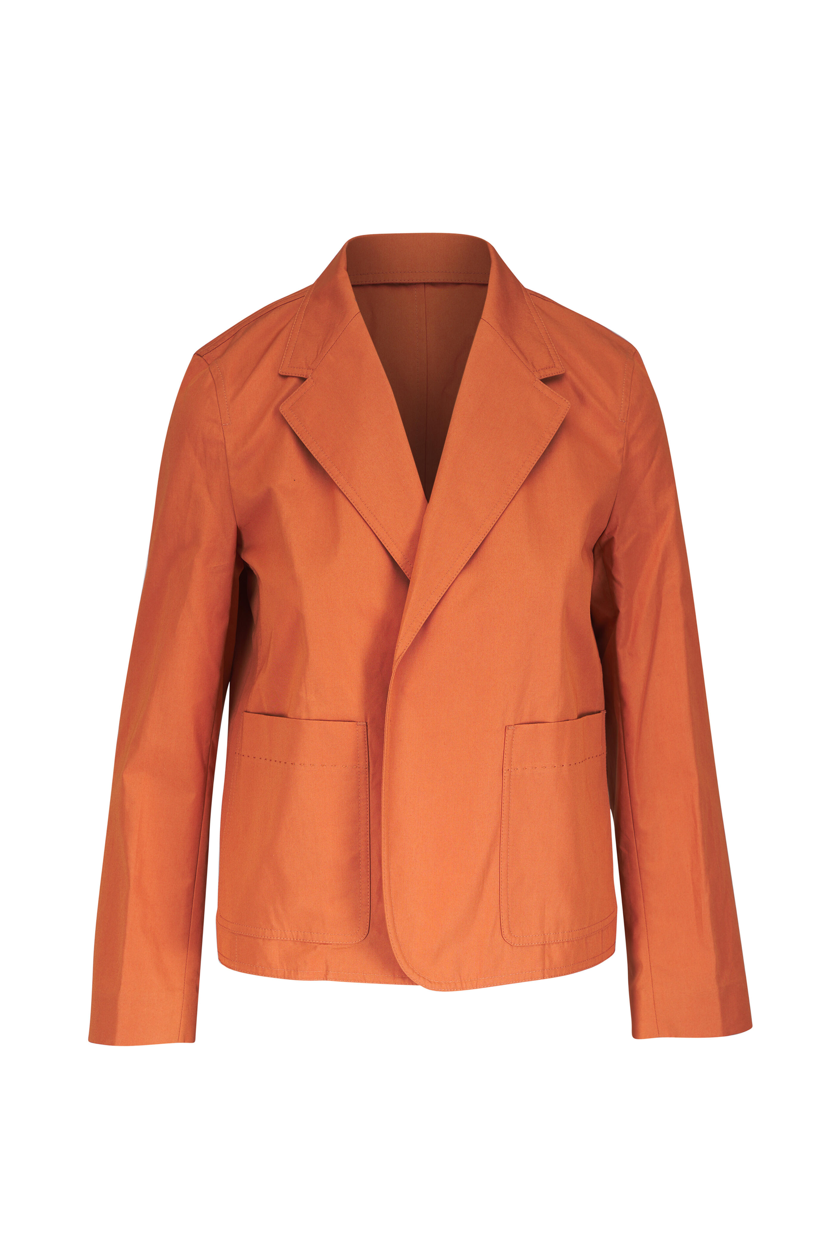 Spread collar. Open front. Lower patch pockets. Back vent. Imported. 100% cotton. Dry clean.