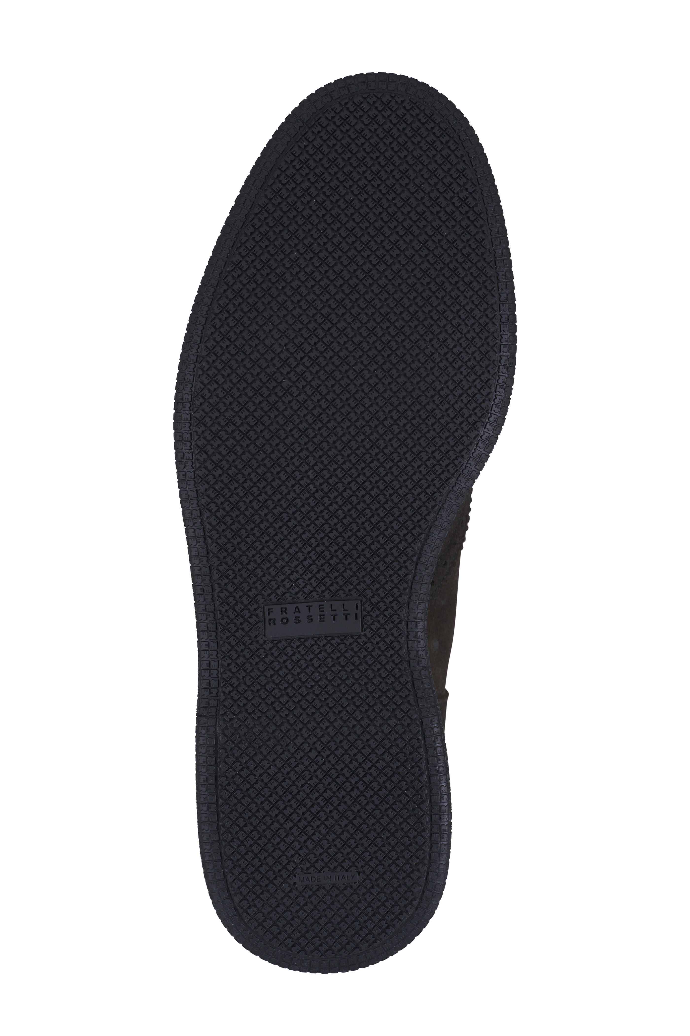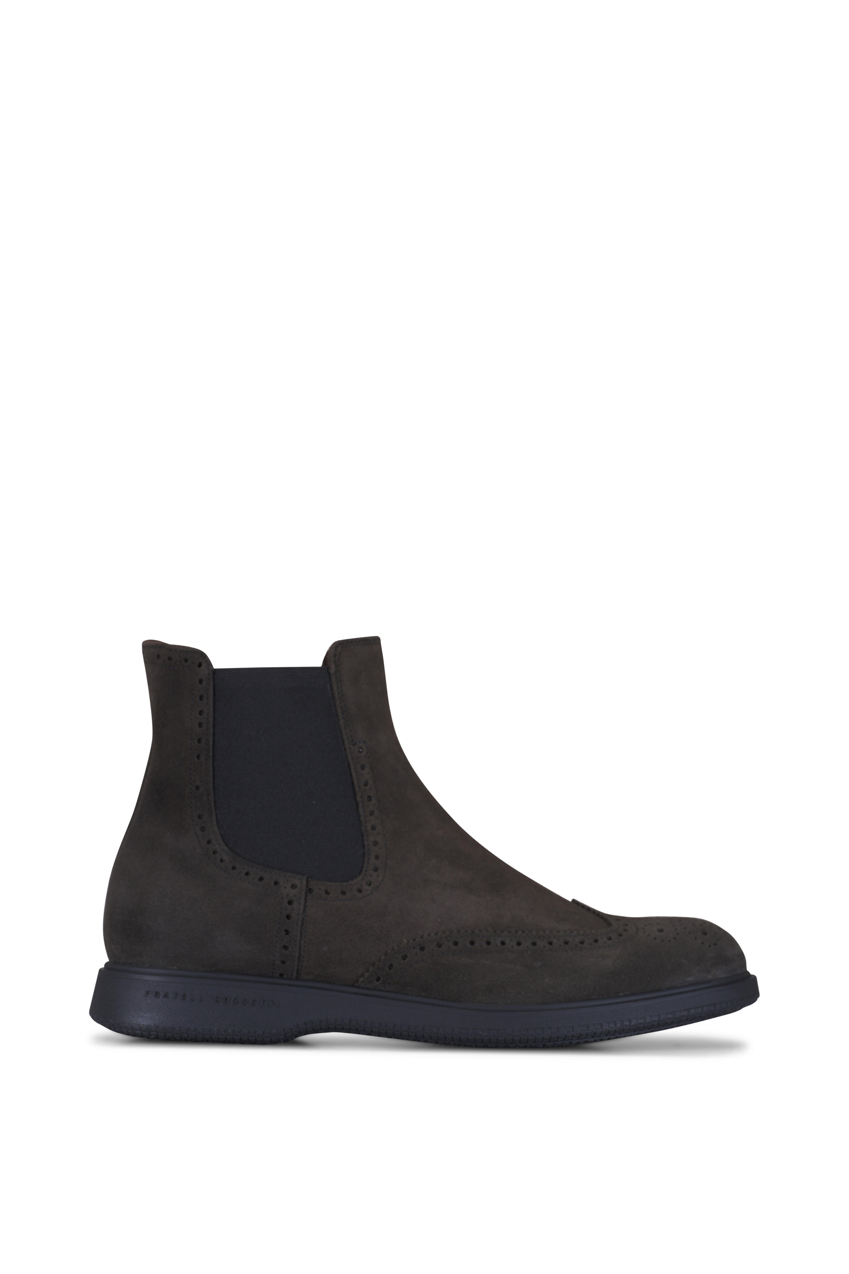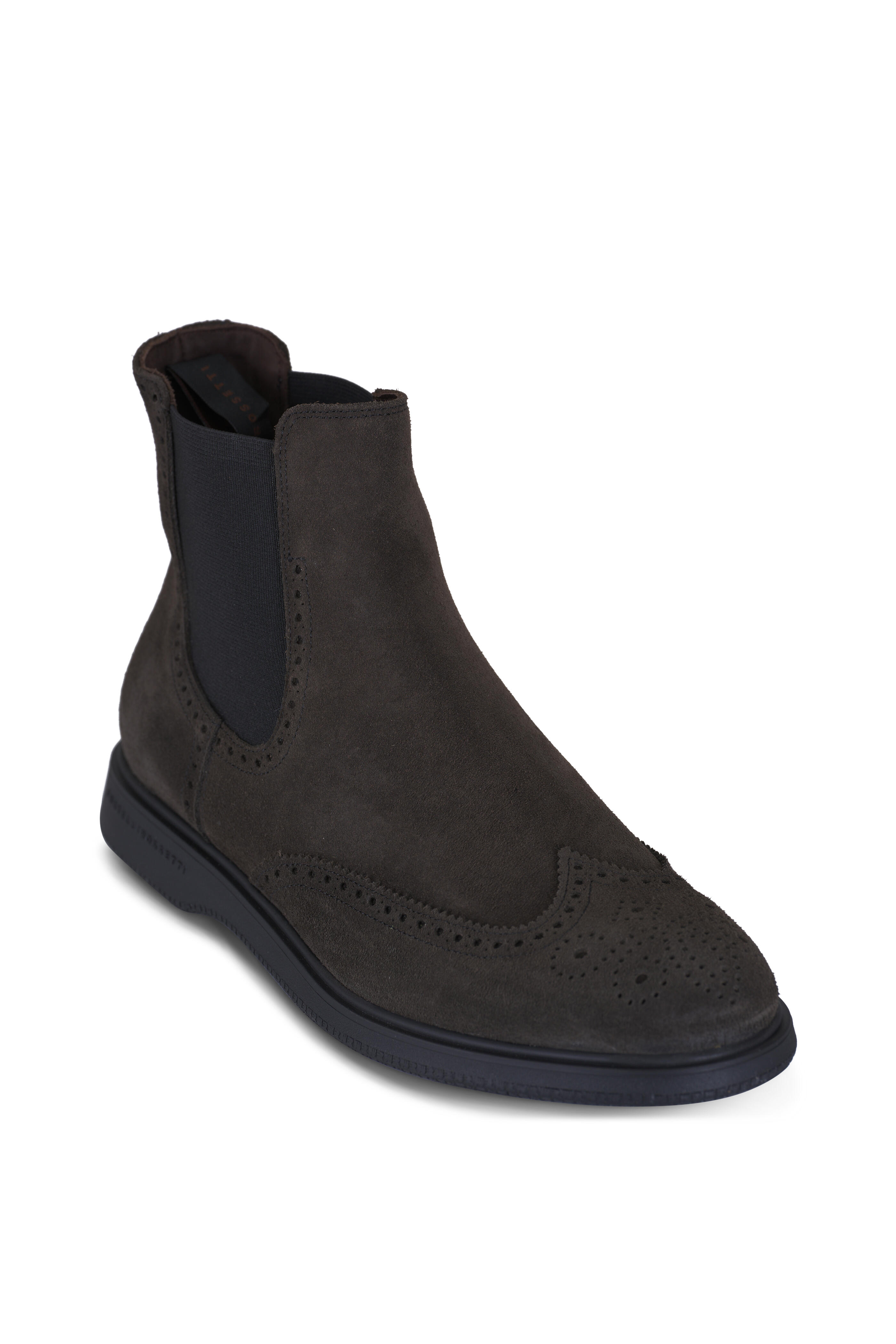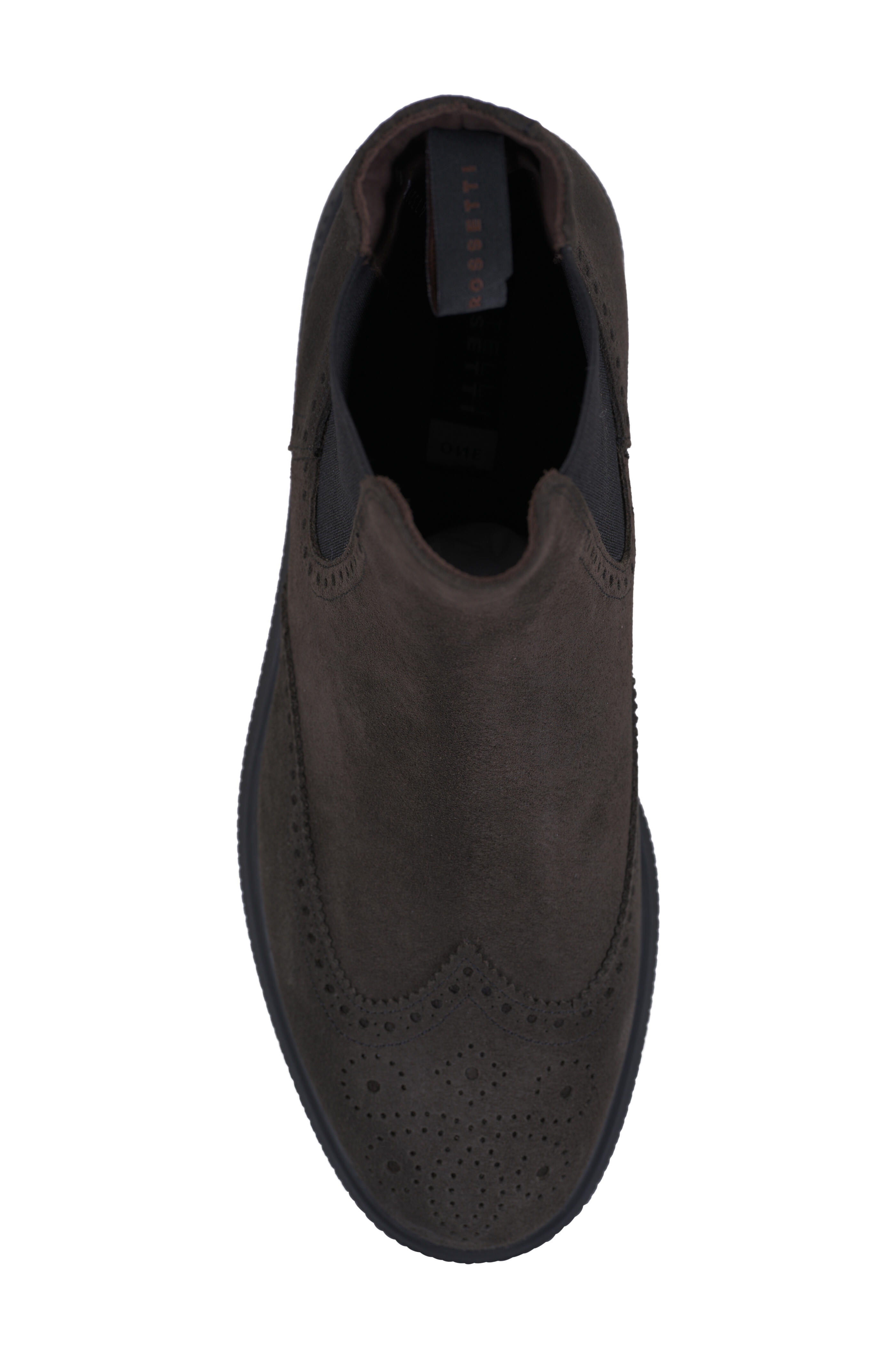 Suede upper. Almond toe. Slip on. Elastic gore panels. Back pull tab. Leather lining and insole. Rubber sole. Made in Italy.