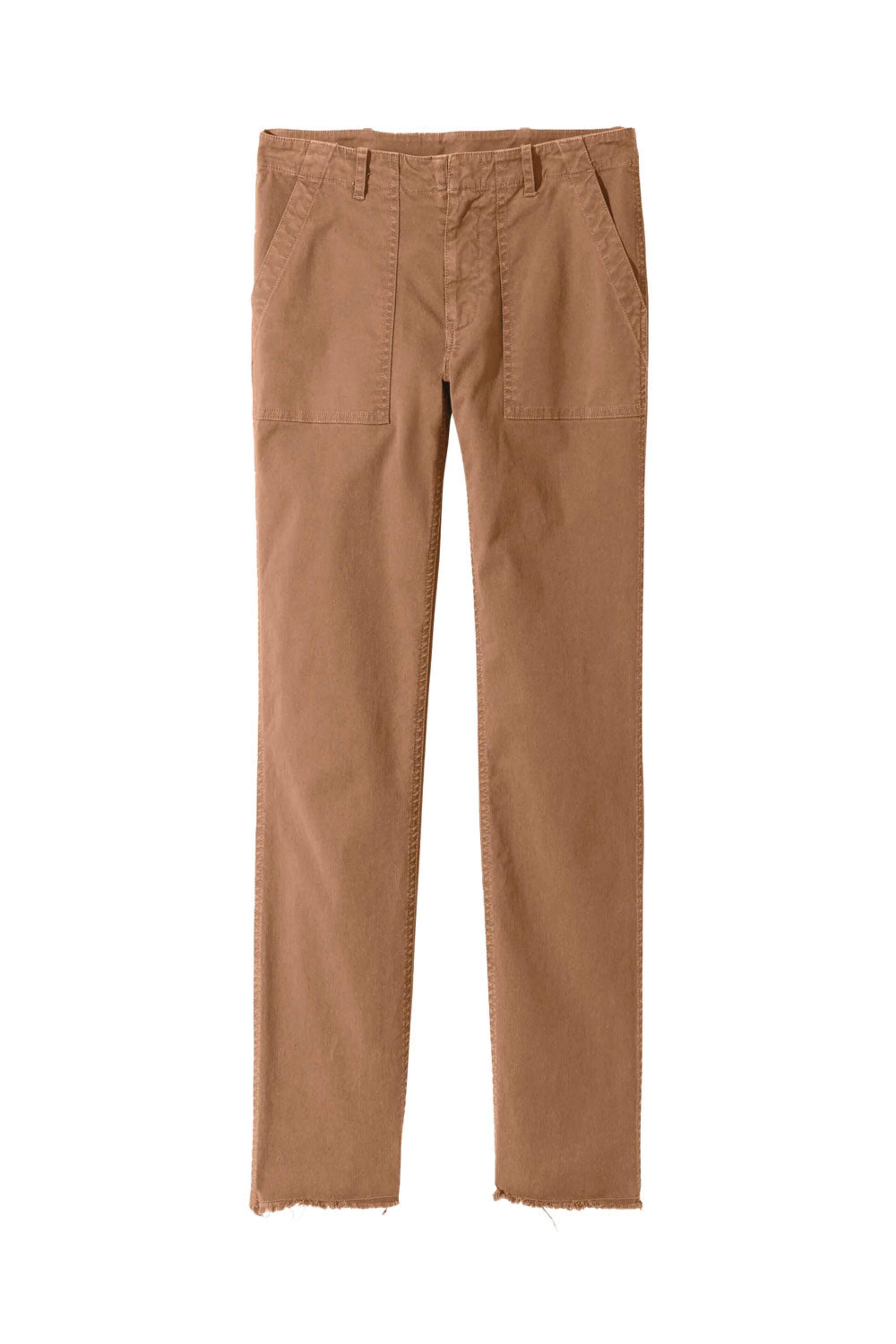 Nili Lotan Camel Jenna Pant. High rise. Concealed hook and eye closure. Zip fly. Front patch pockets. Back flap pockets. Full length; raw hem. Slim silhouette. 98% Cotton, 2% Elastane.