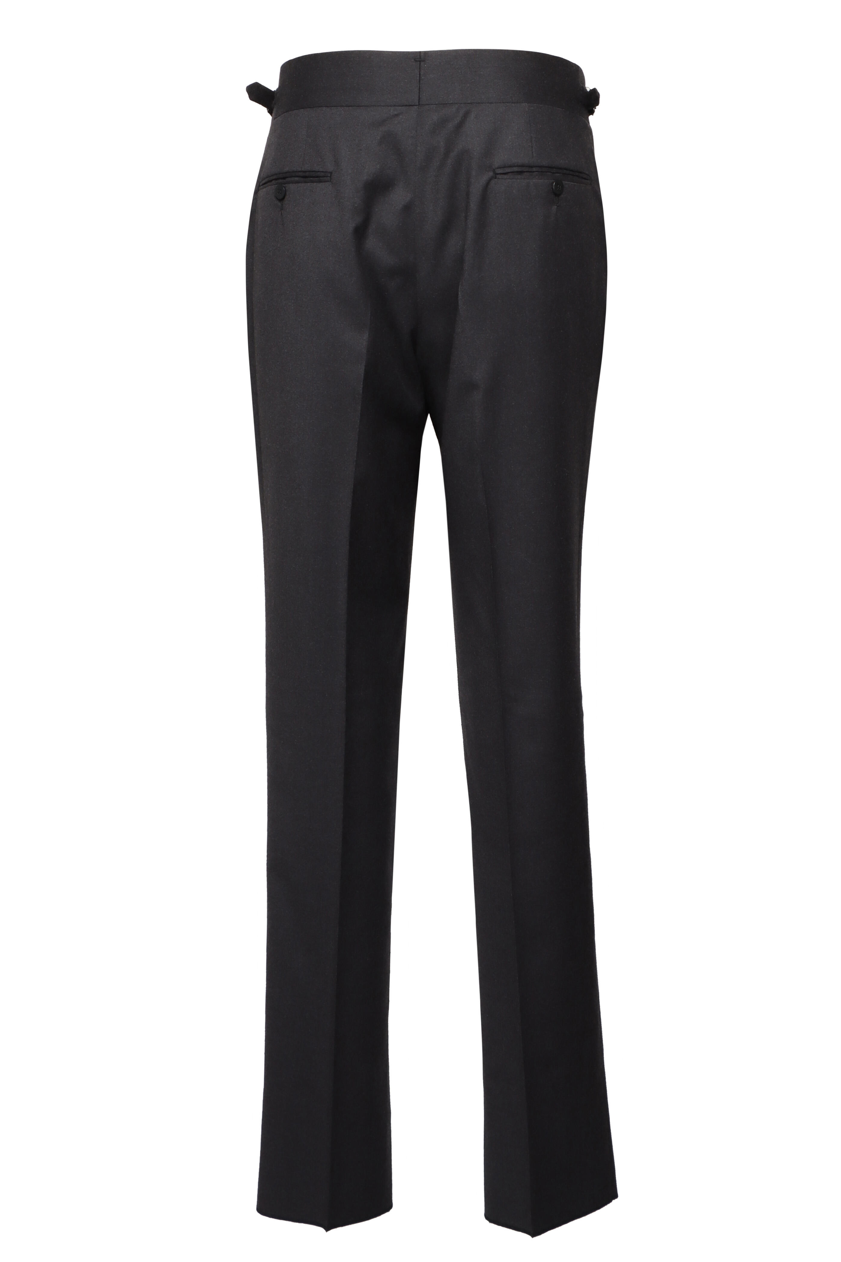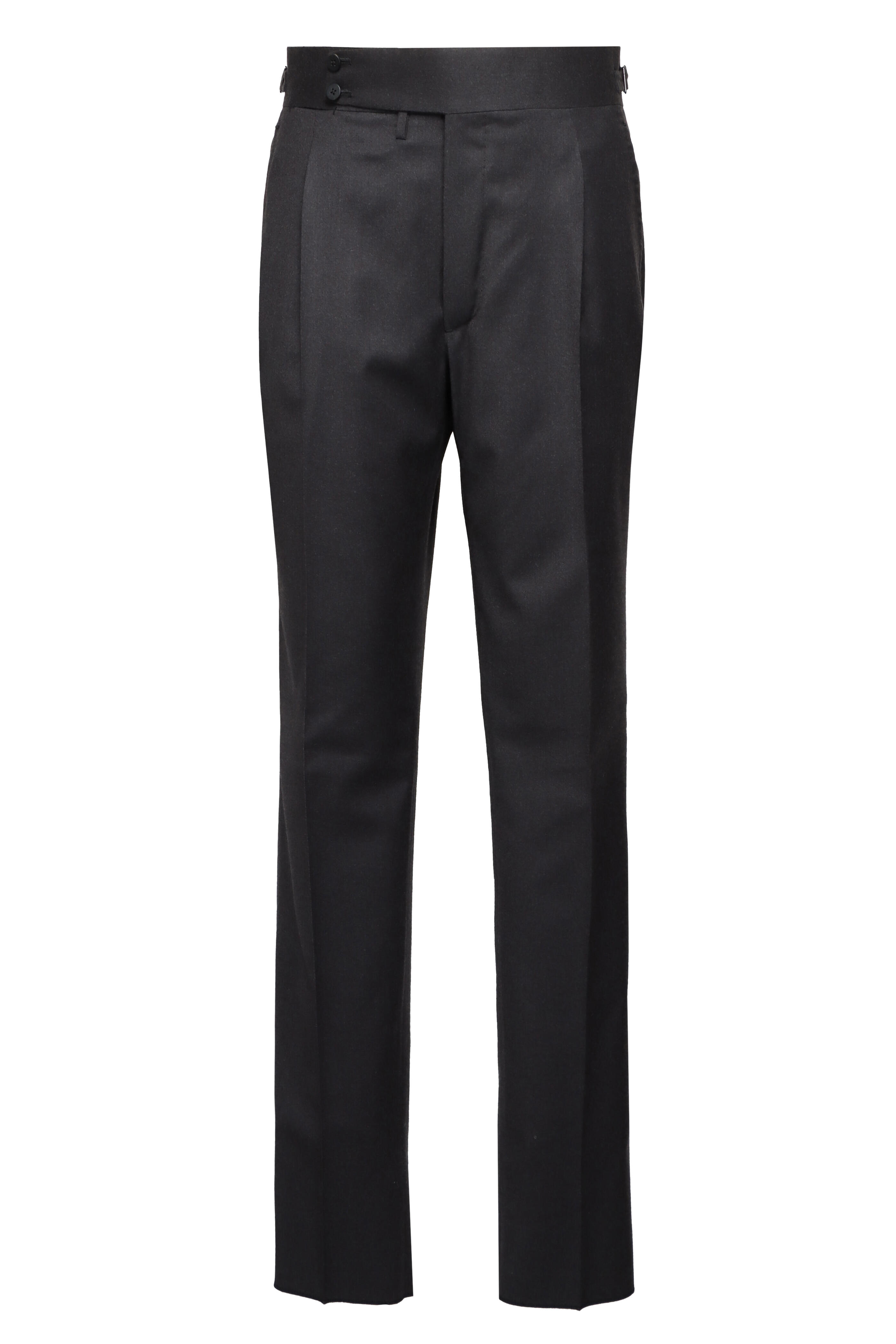 Zip fly with extended button tab. Banded waist; side adjusters. Front slash pockets; back buttoned-besom pockets; coin pocket. Unfinished hem. Made in Italy. 100% wool. Dry clean.