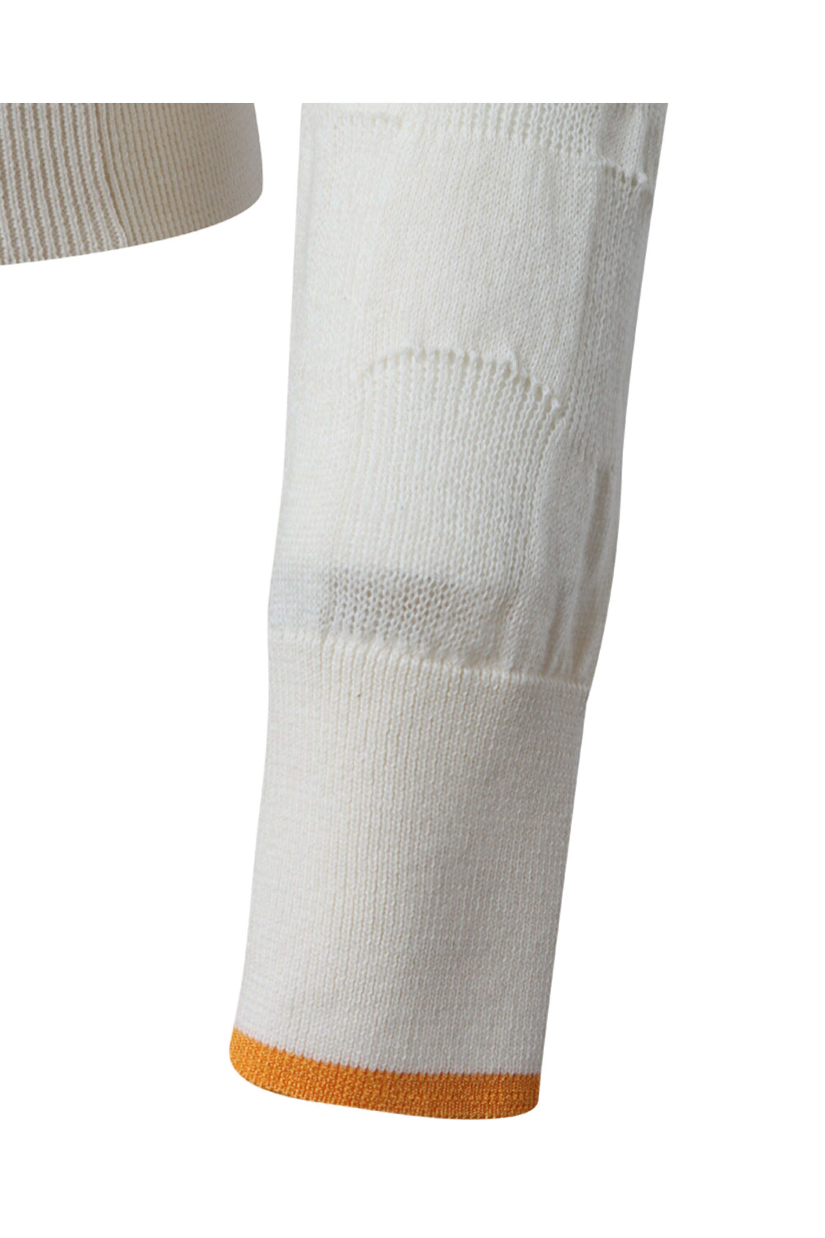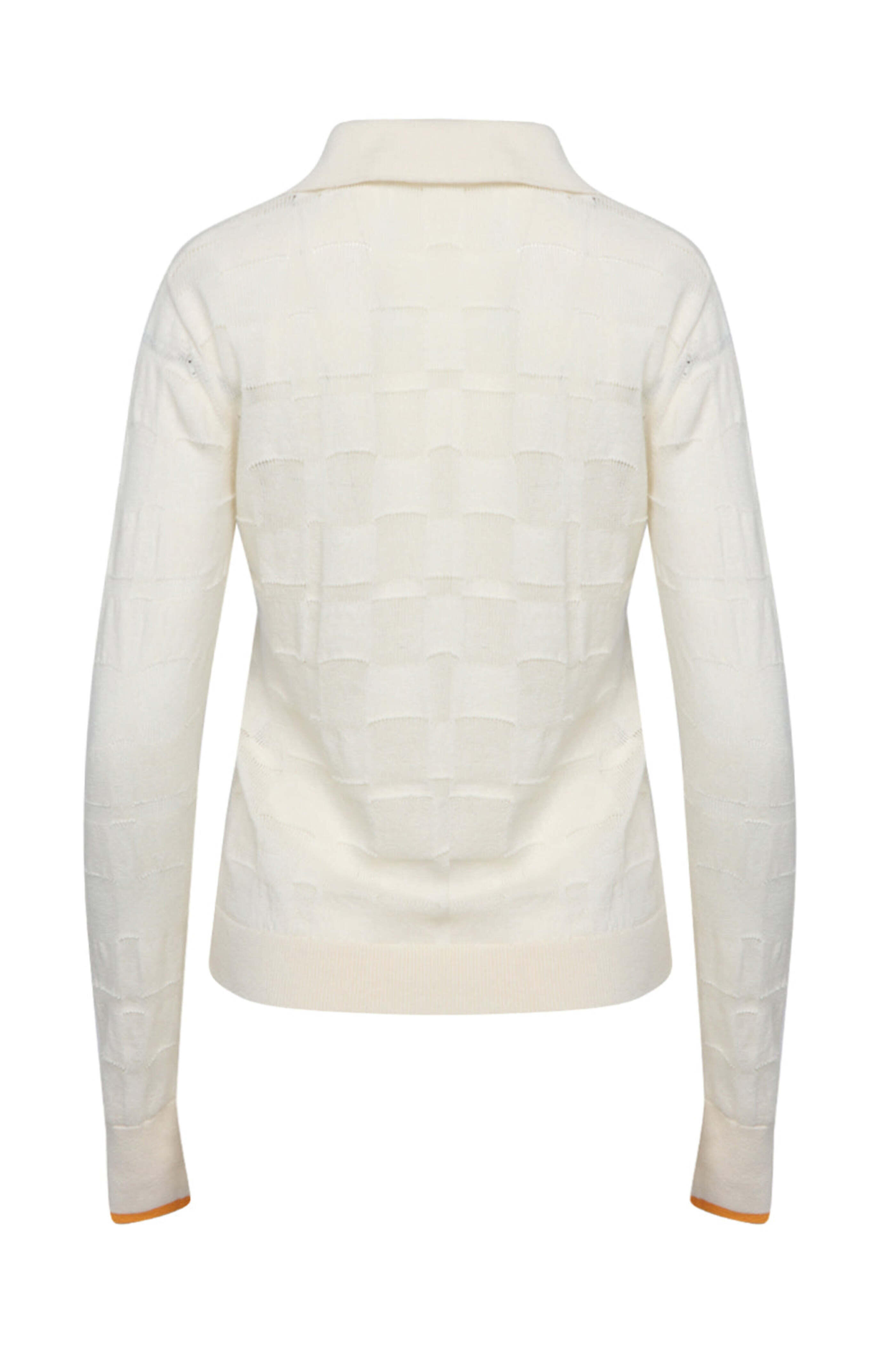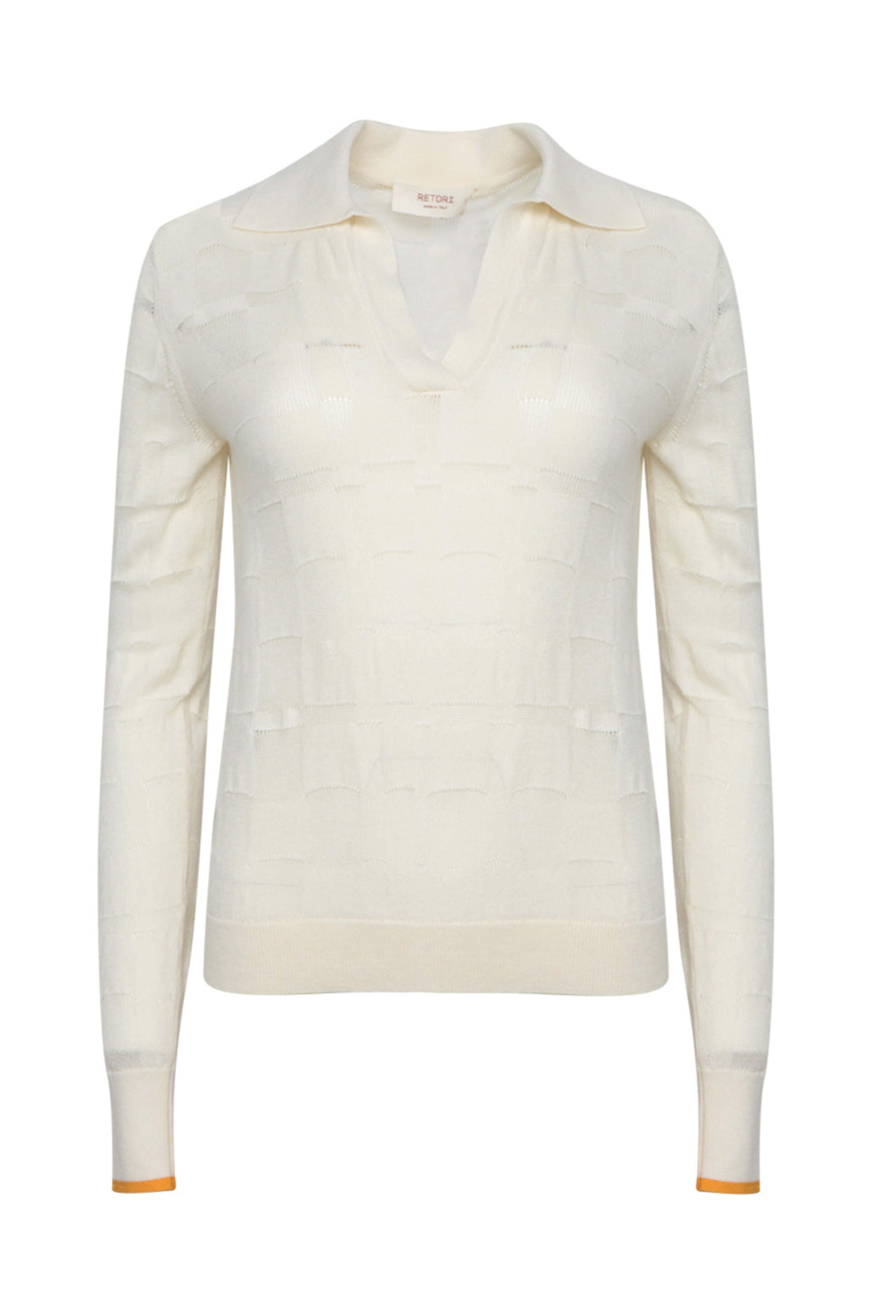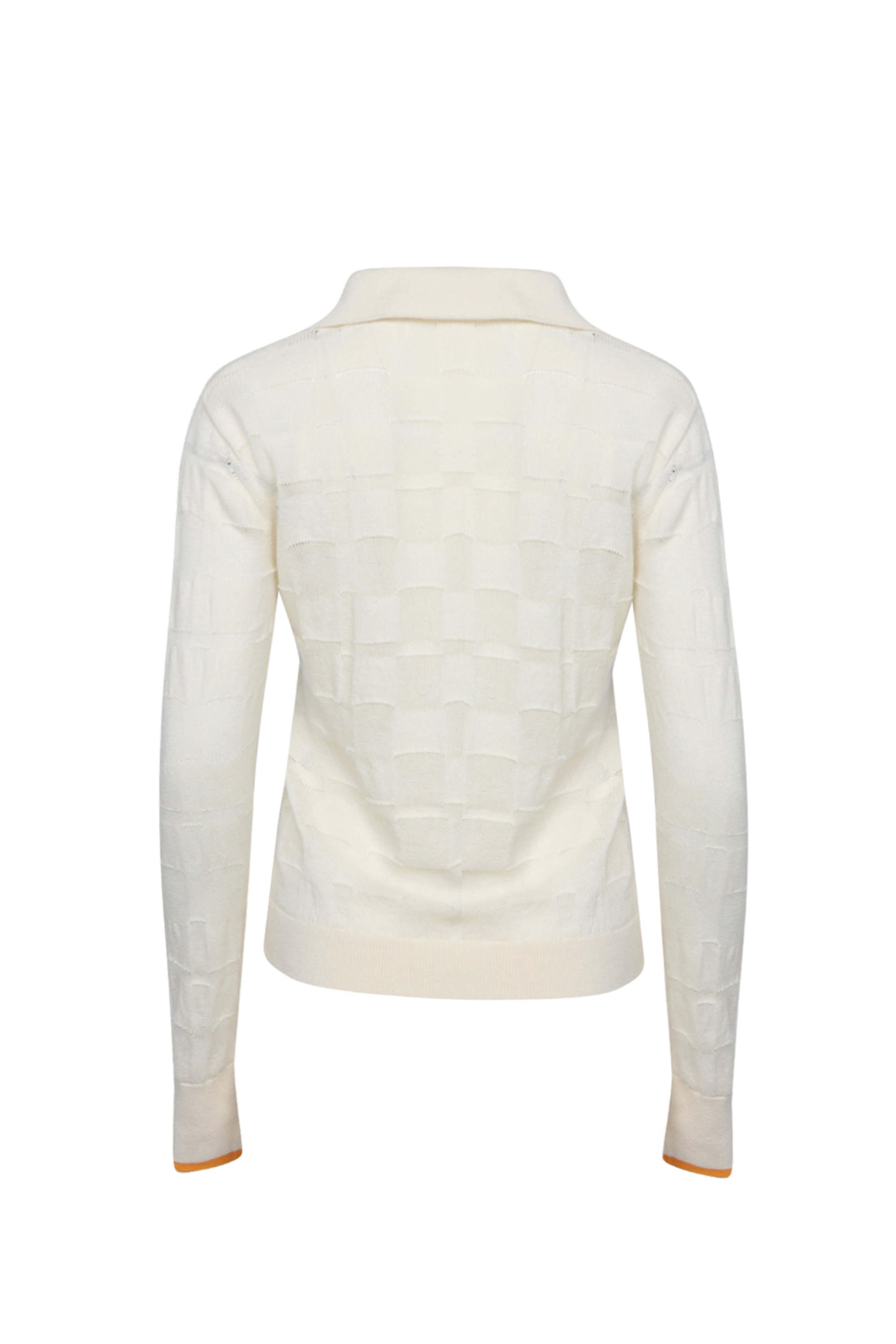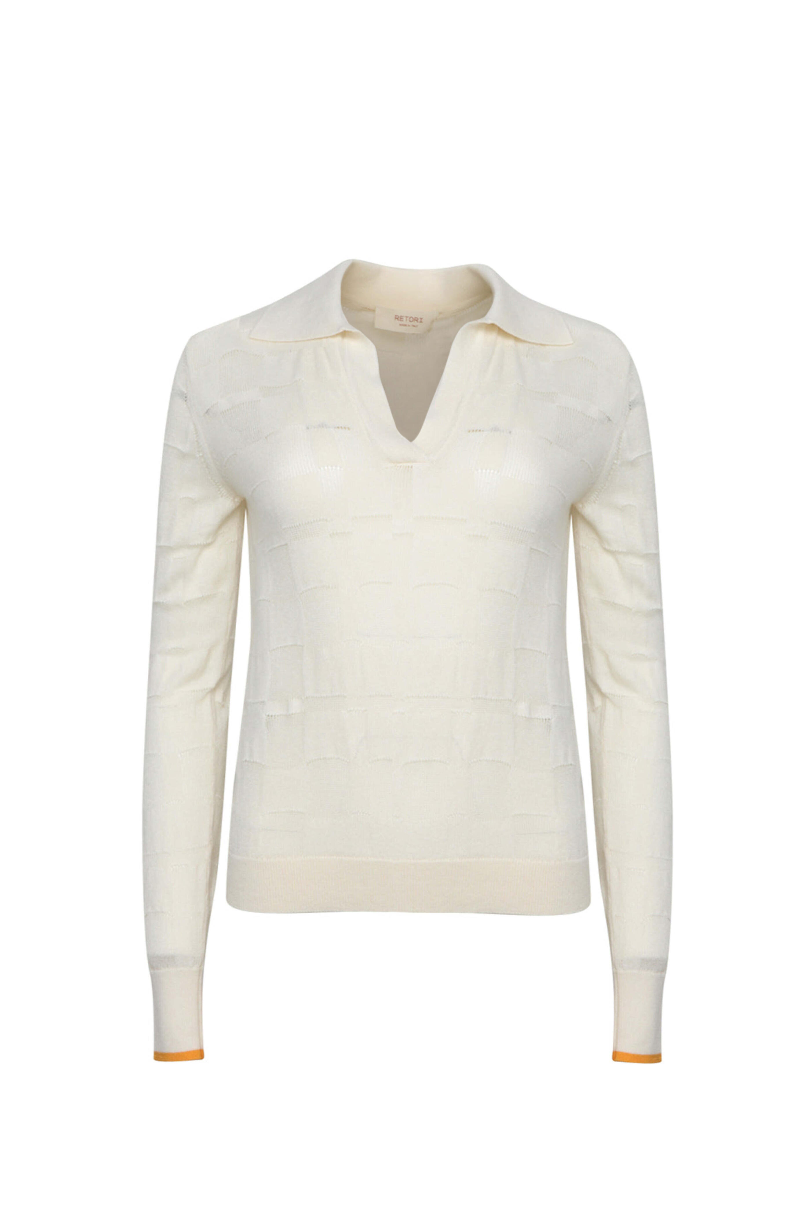Retori Butter Jacquard Damier Polo. Collar. V neck. Long sleeves. Relaxed fit. Ribbed neck, cuffs, and hem. Jacquard fabrication. 85% cotton, 15% cashmere outer 1, 100% viscose outer 2.