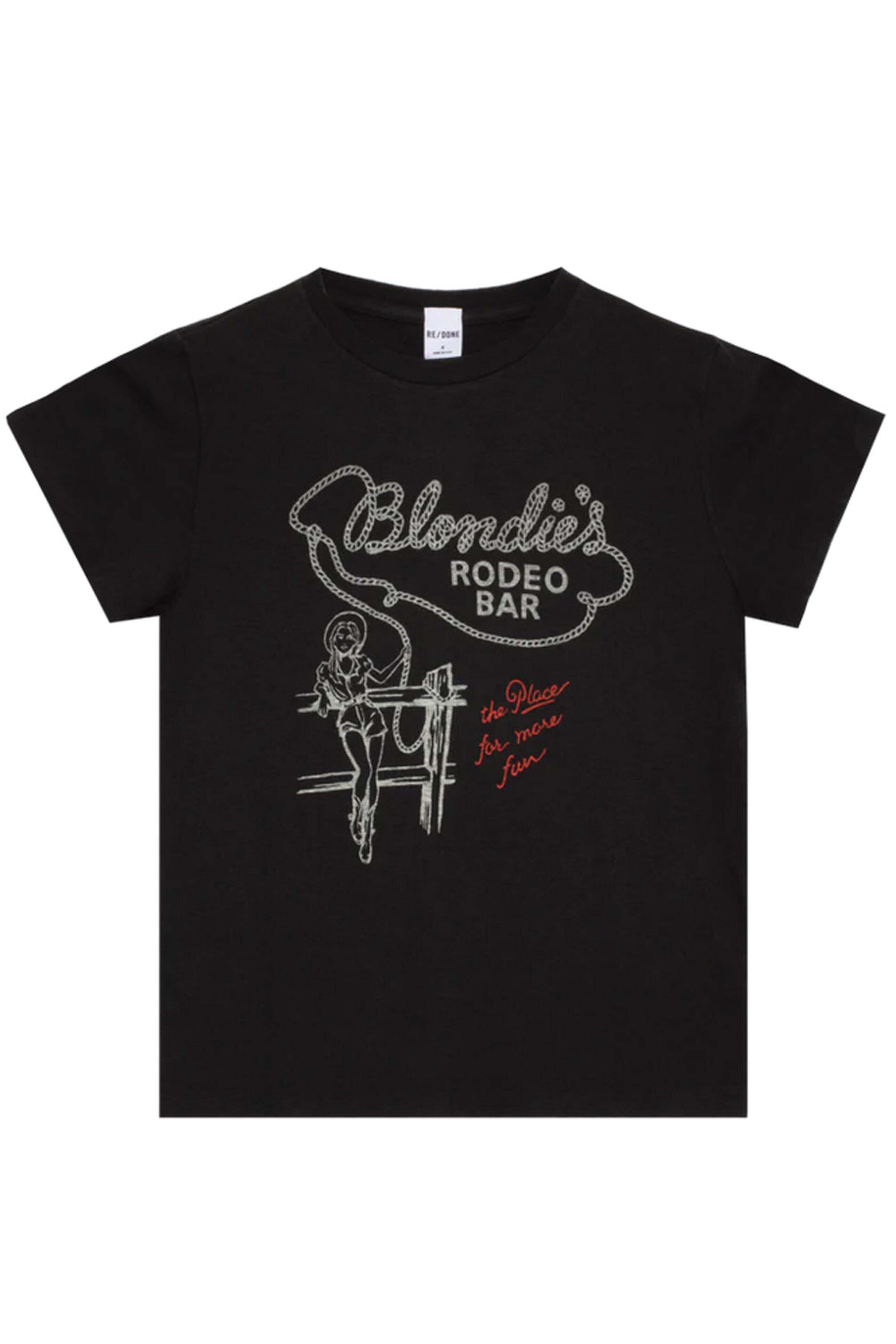 Crewneck. Short sleeves. Classic fit. Blondies Rodeo Bar graphic detail. Straight hem. RE/DONE Blondie Tee in Washed Black. 100% cotton.
