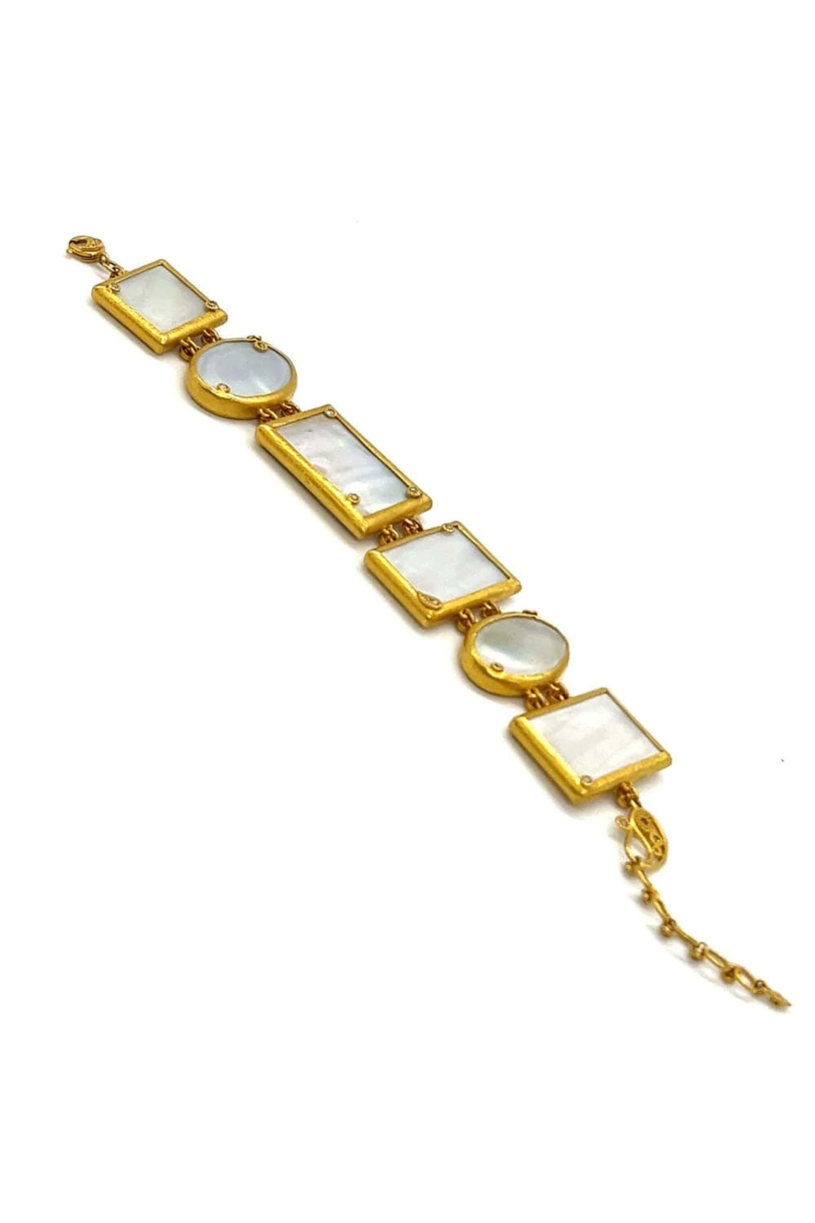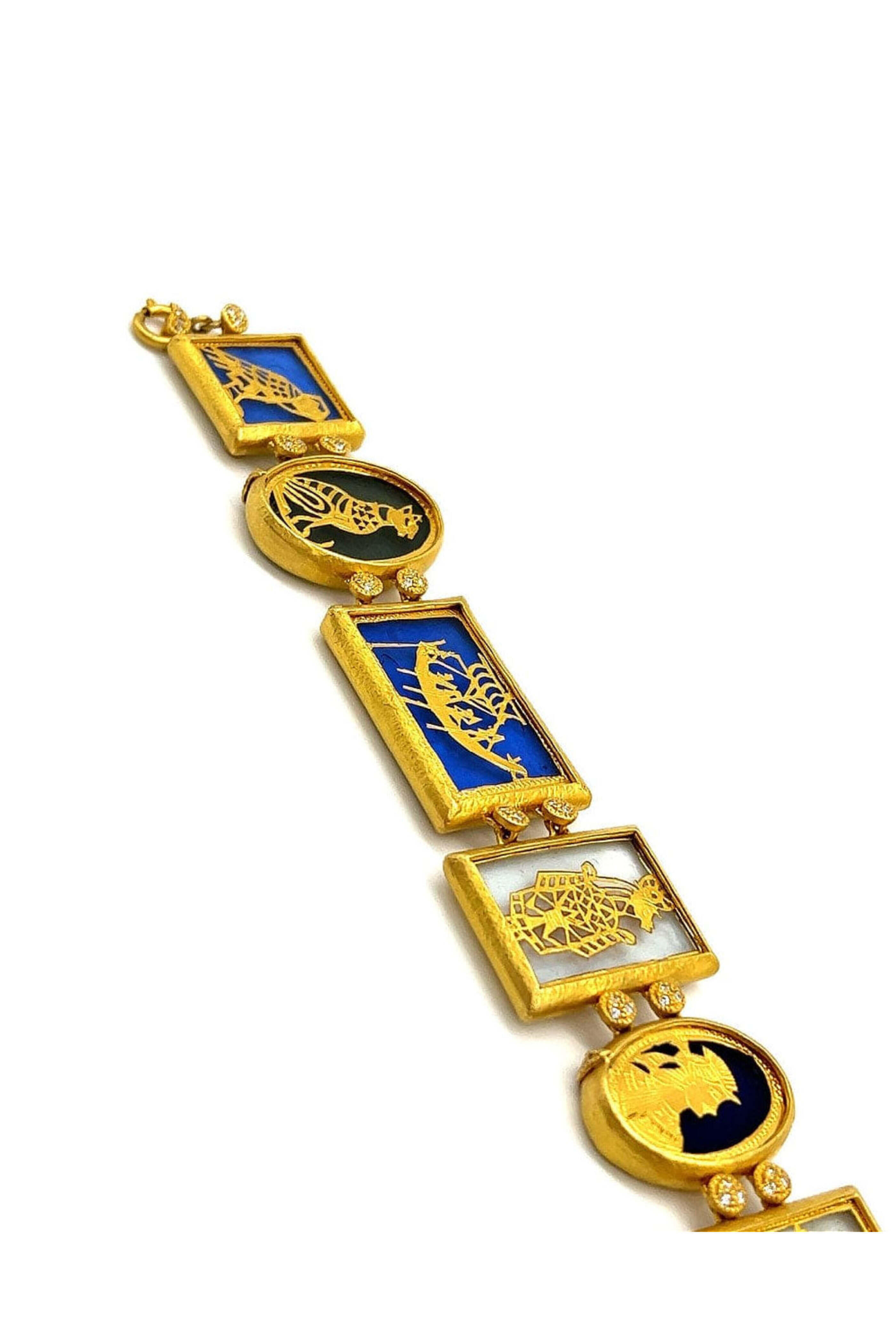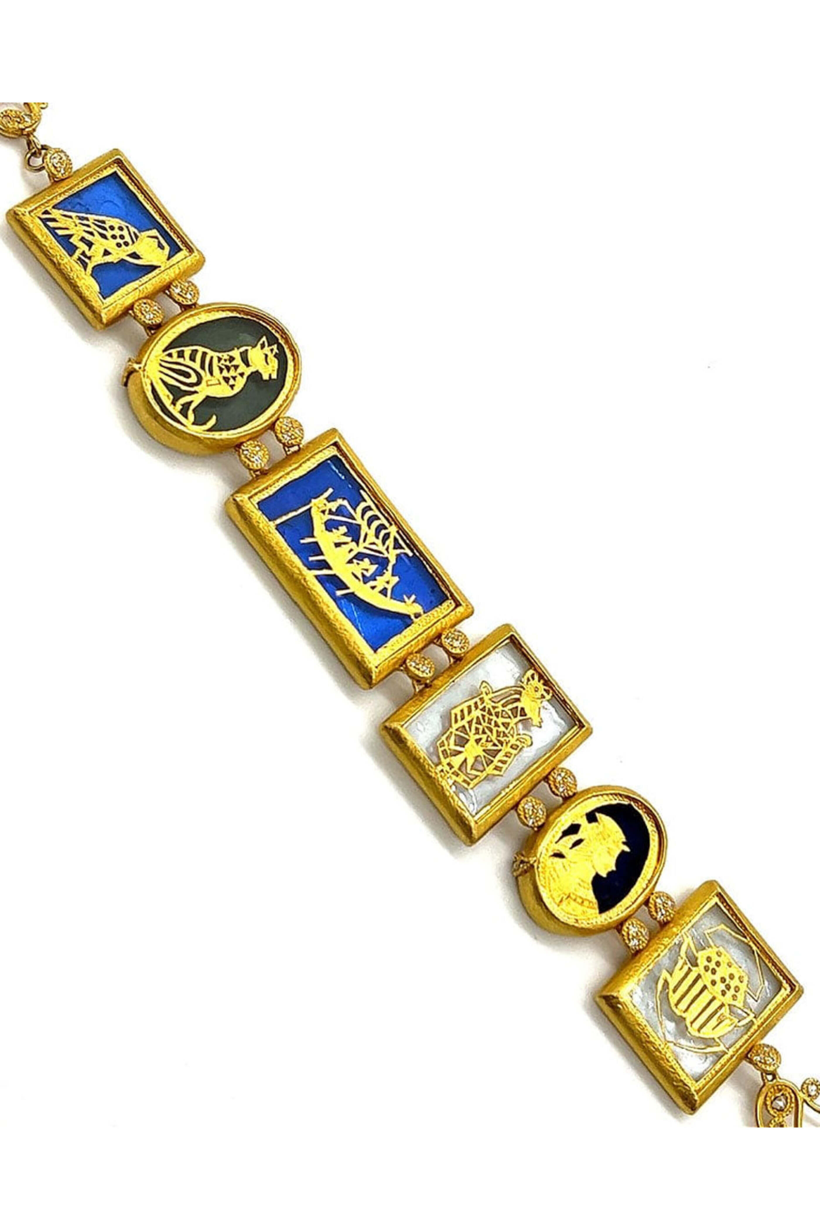 Coomi Thewa 6 Piece Filigree Bracelet. 20k yellow gold. Mother of pearl 42.21 total carat weight. Diamond 0.79 total carat weight. Thewa, an art that captures the culture, heritage, and tales of romance of India. 7 L with extension. Spring ring closure.