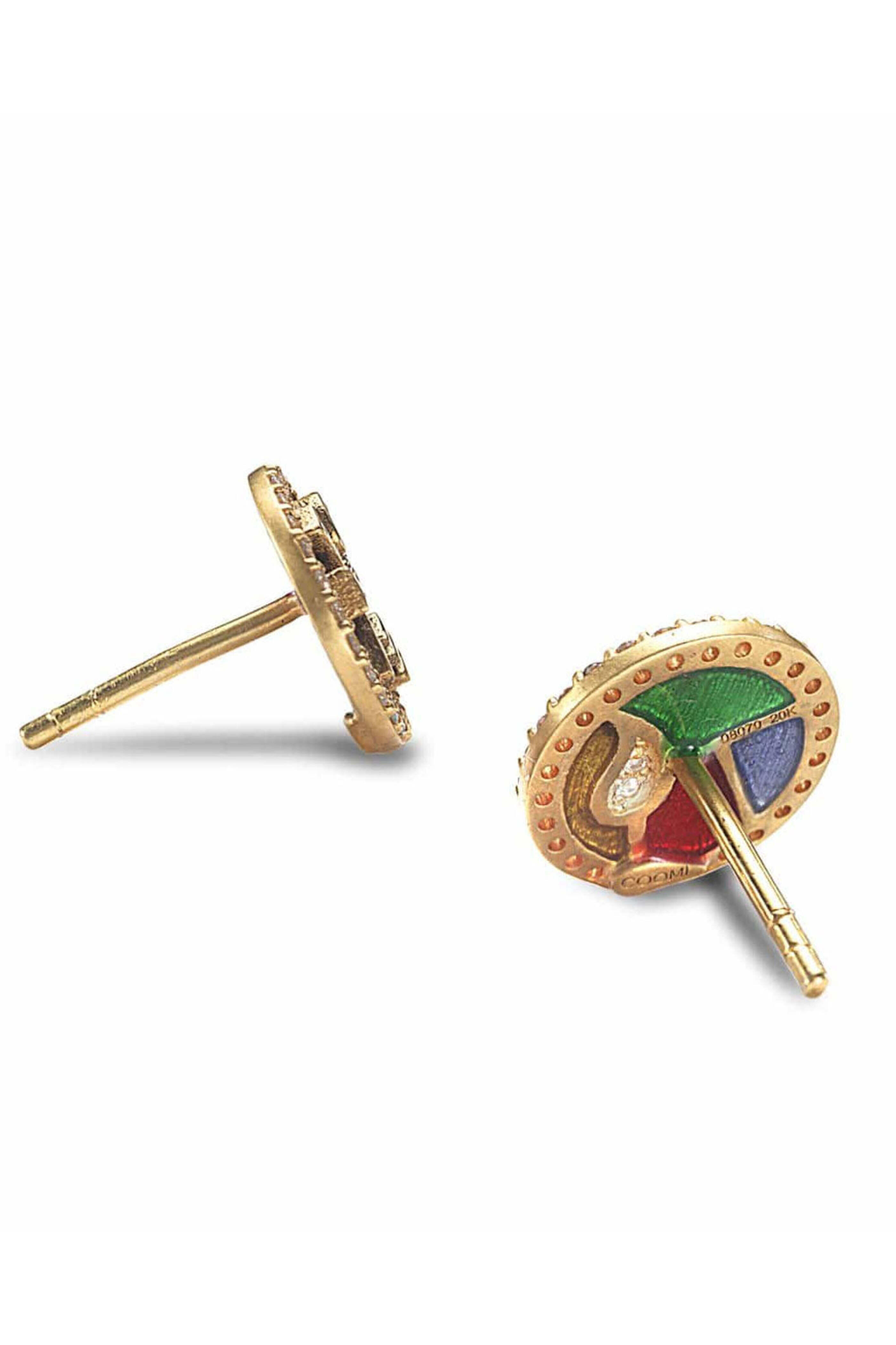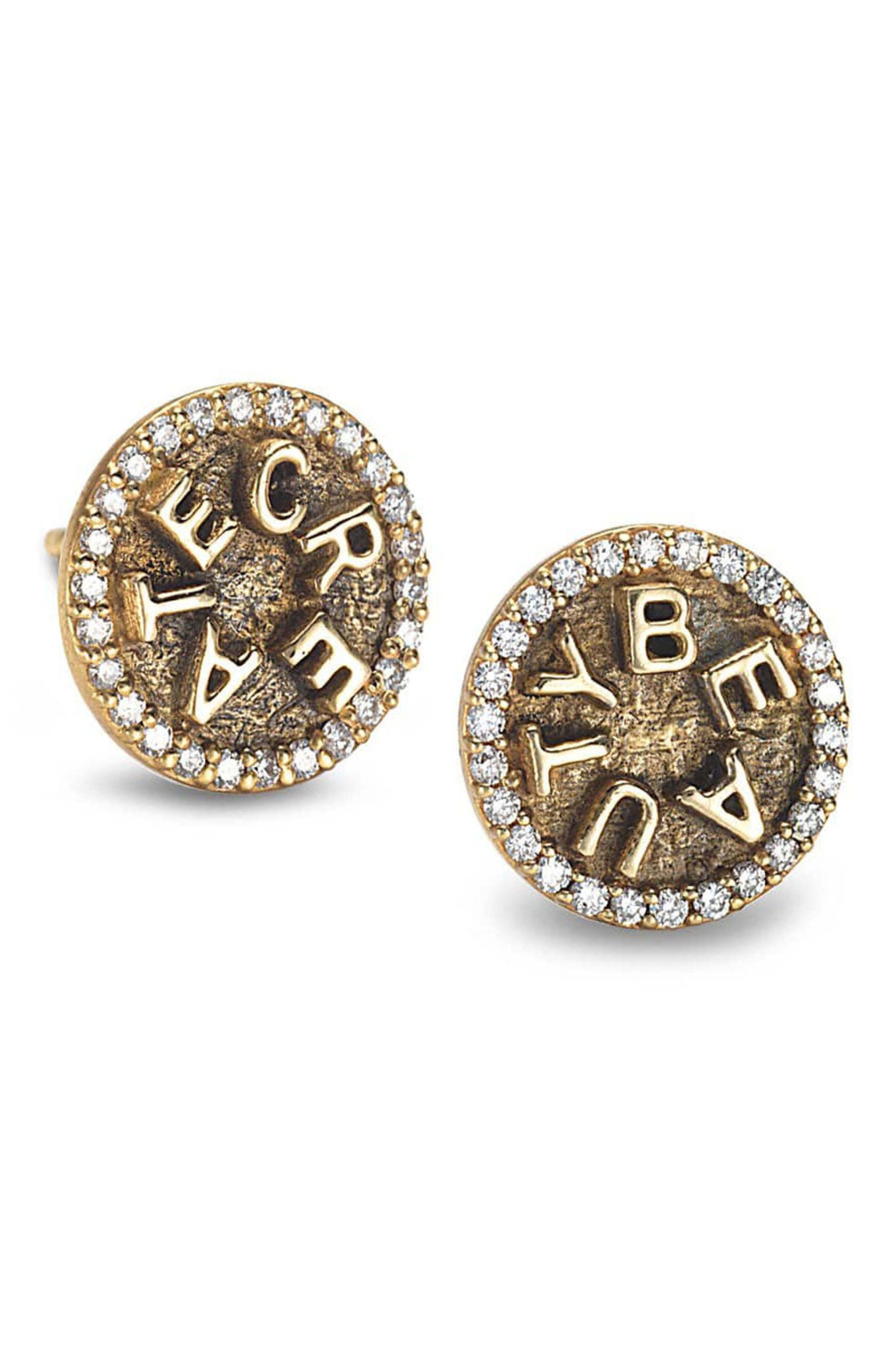 Coomi Sagrada Diamond Stud Earrings. 20k gold. Diamond 0.27 total carat weight. Stained glass inspired. Text reads Create and Beauty. Stud design. Post back closure.