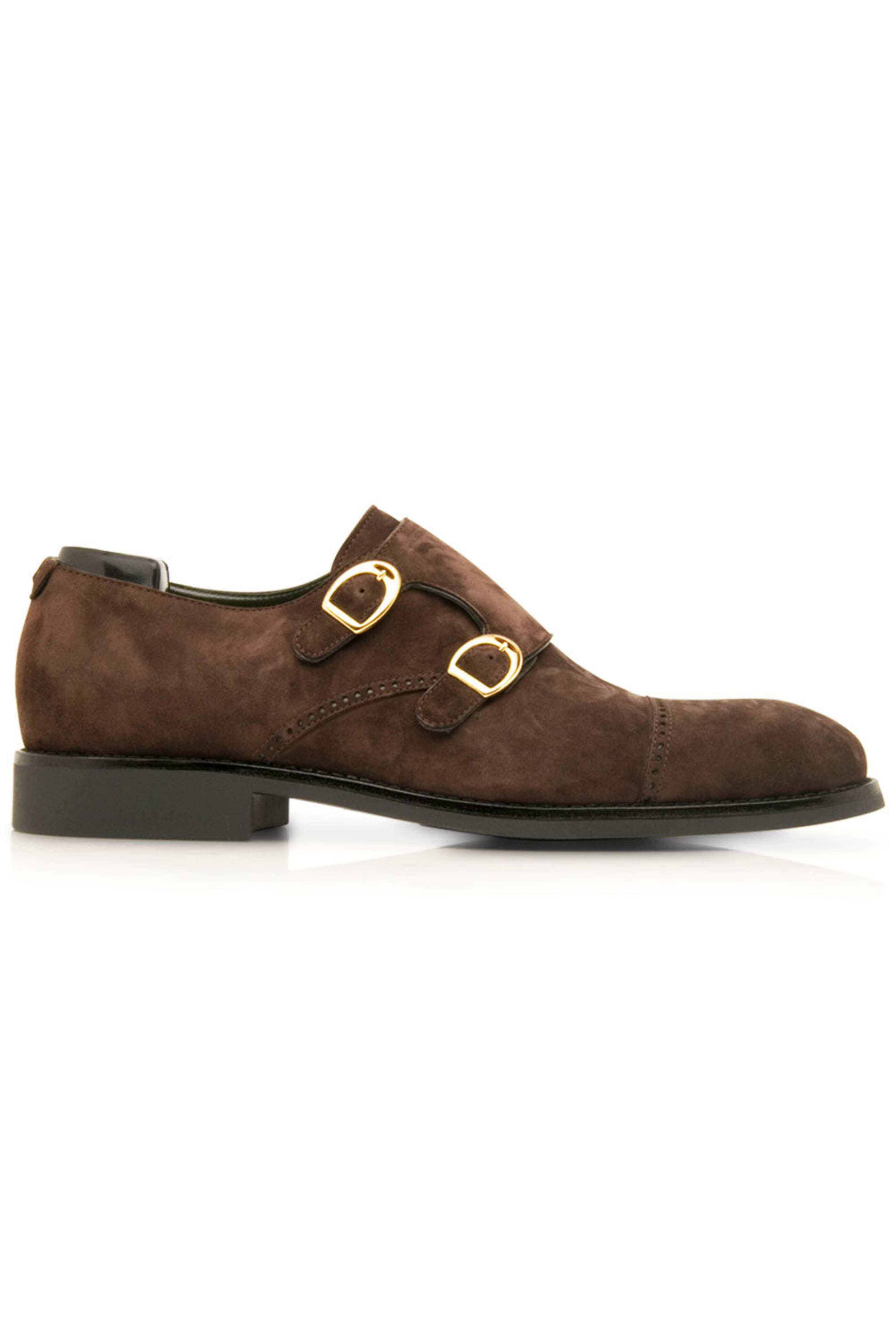 Artioli Suede Monkstrap in Dark Brown. Reinforced square toe. Cap toe. Double monk strap with buckle closure. Gold hardware. Tonal stitching. Suede upper. Leather lining. Rubber sole. Made in Italy.