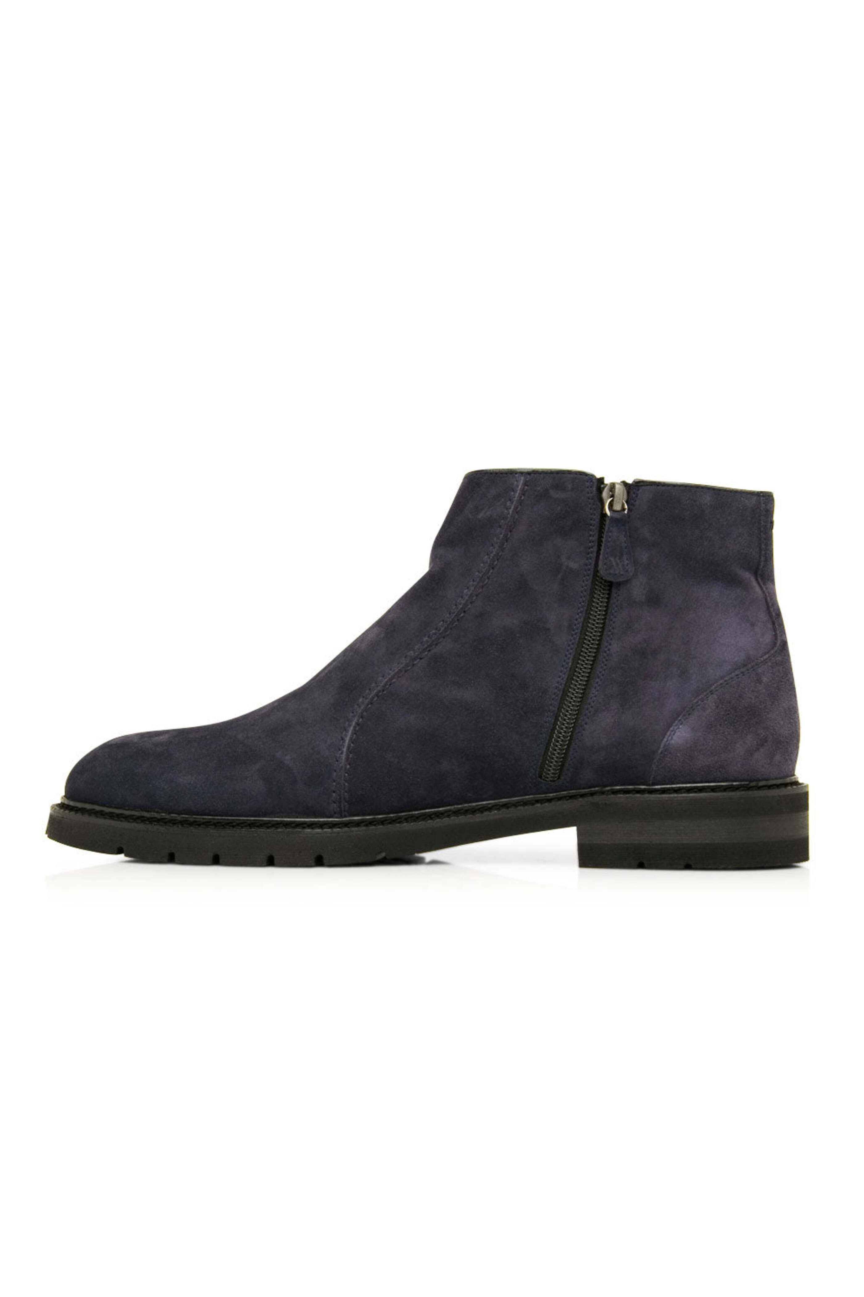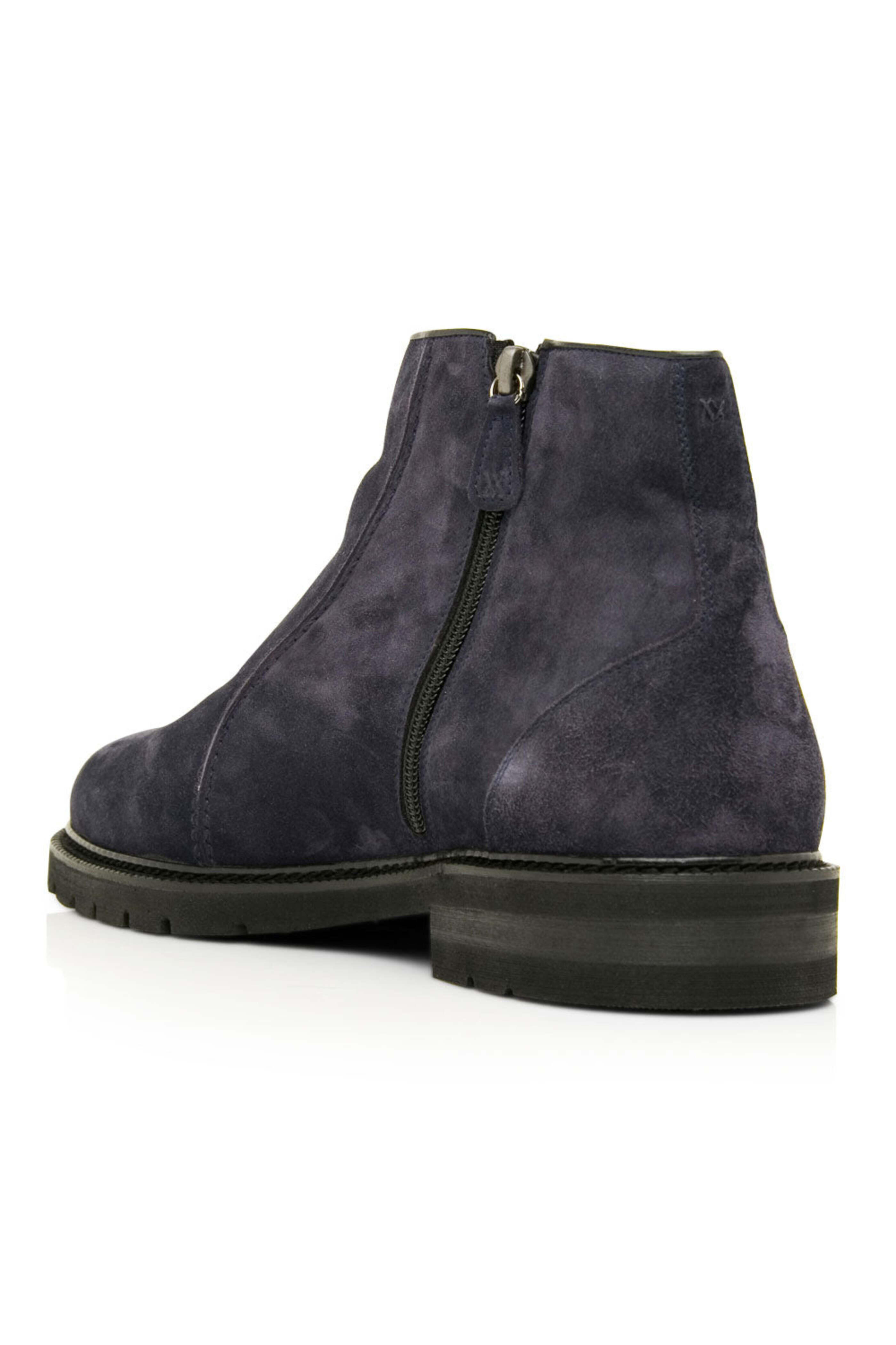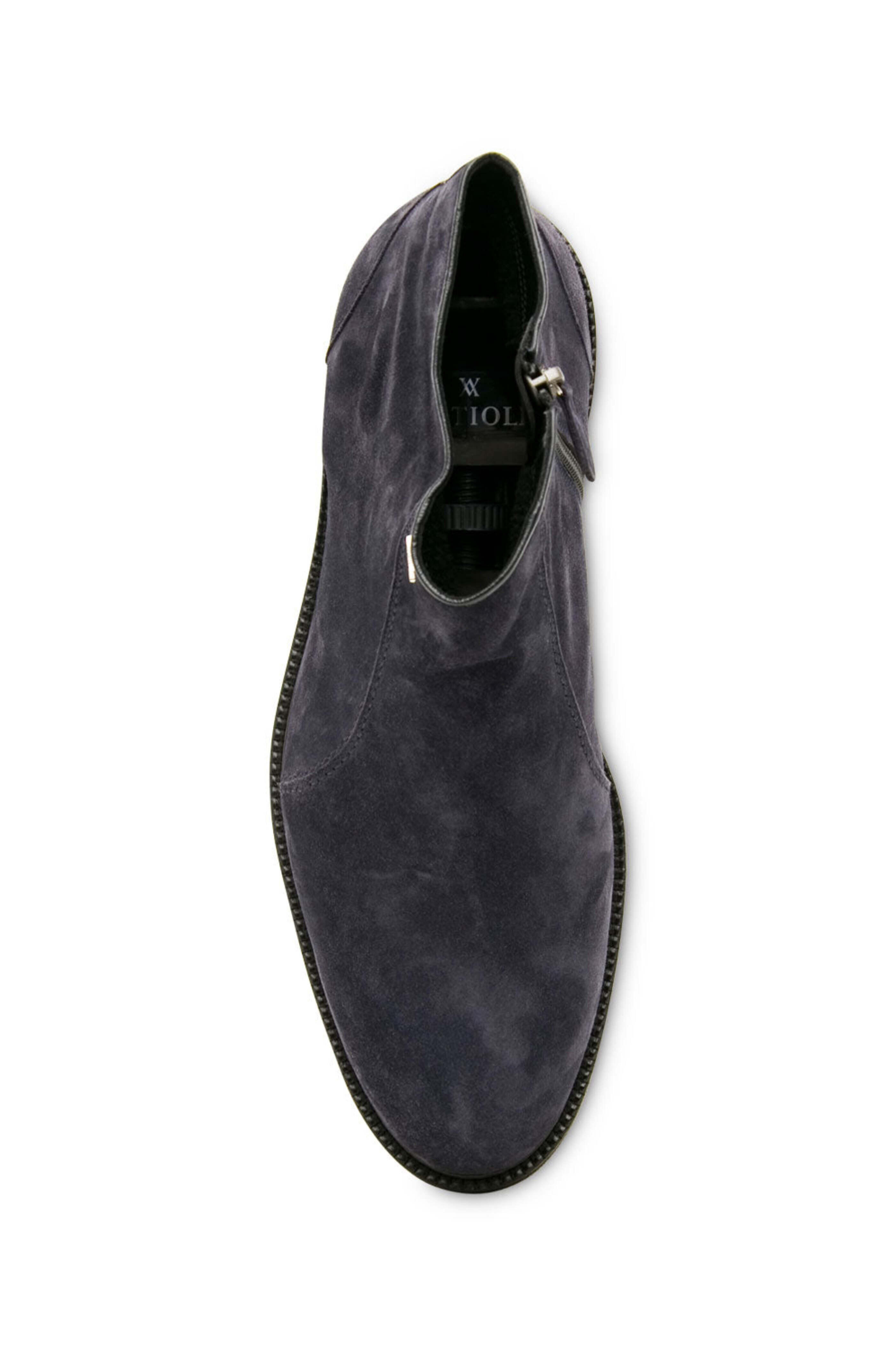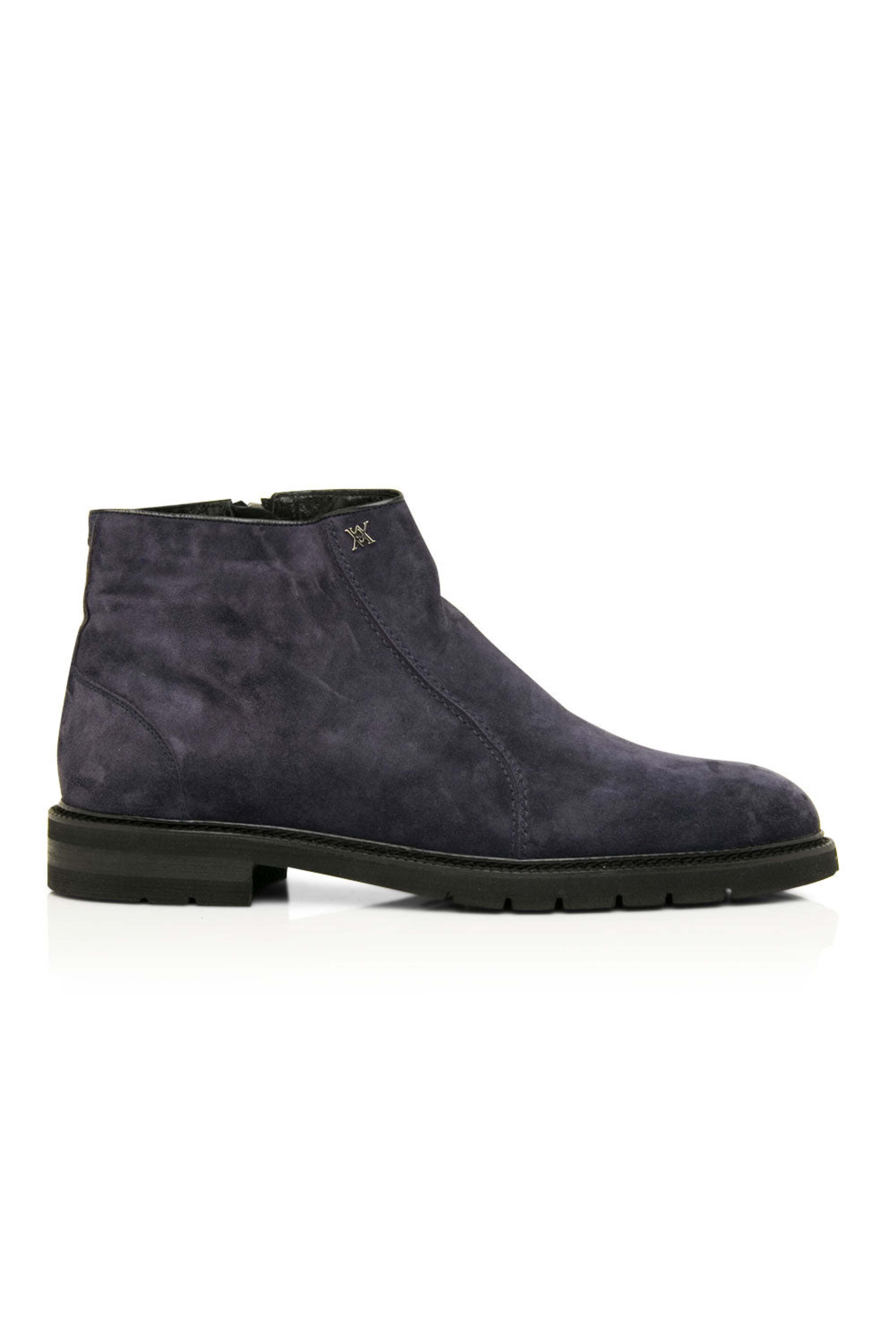 Artioli Suede Slip On Boot in Navy. Almond toe. Interior zip closure. Tonal stitching. Suede supper. Shearling and leather lining. Rubber lug sole. Shoe tree included. Made in Italy.