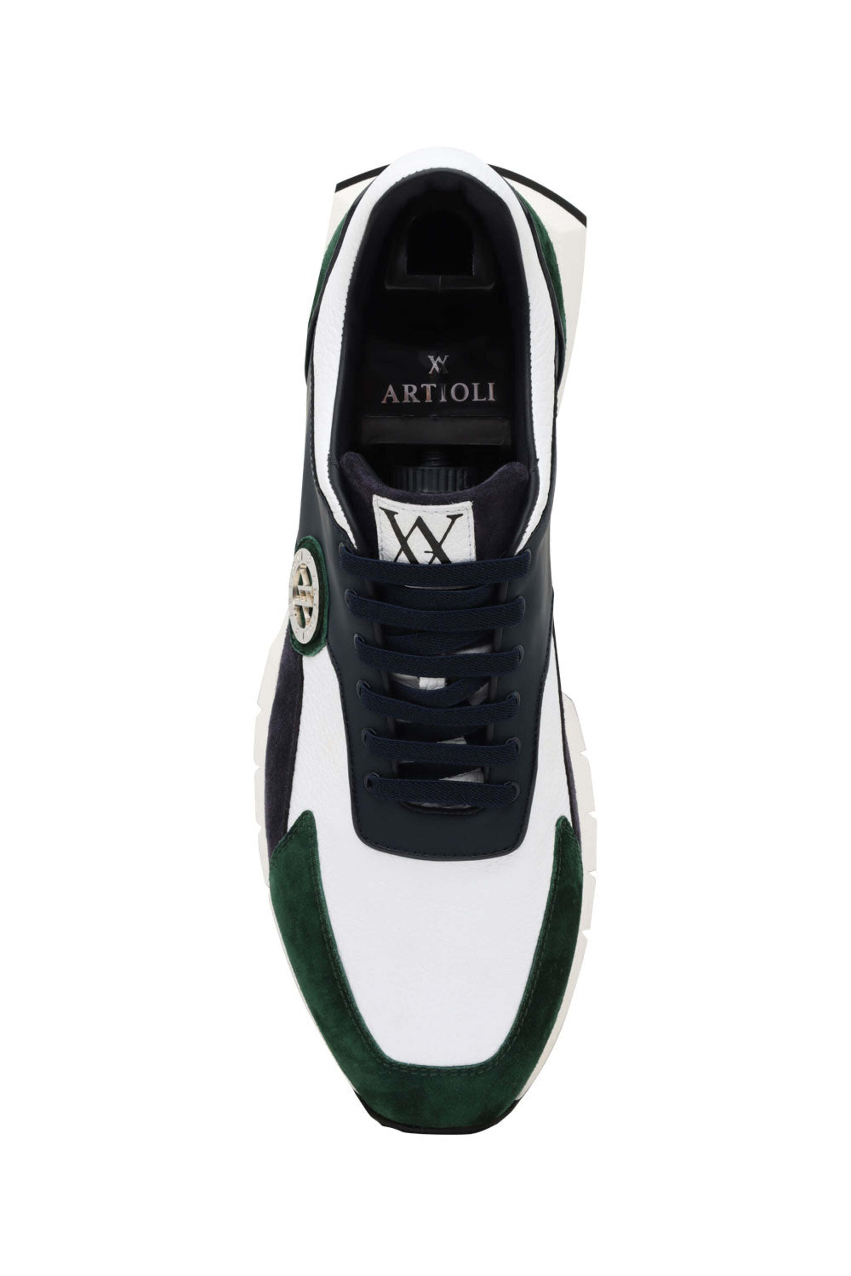 Artioli Leather and Suede Sneaker in Green and Blue. Round toe. Lace-up vamp. Suede paneling. Tonal stitching. Signature metallic Artioli logo. Leather and suede upper. Leather lining and insole. Two-tone rubber sole. Shoe tree included. Made in Italy.