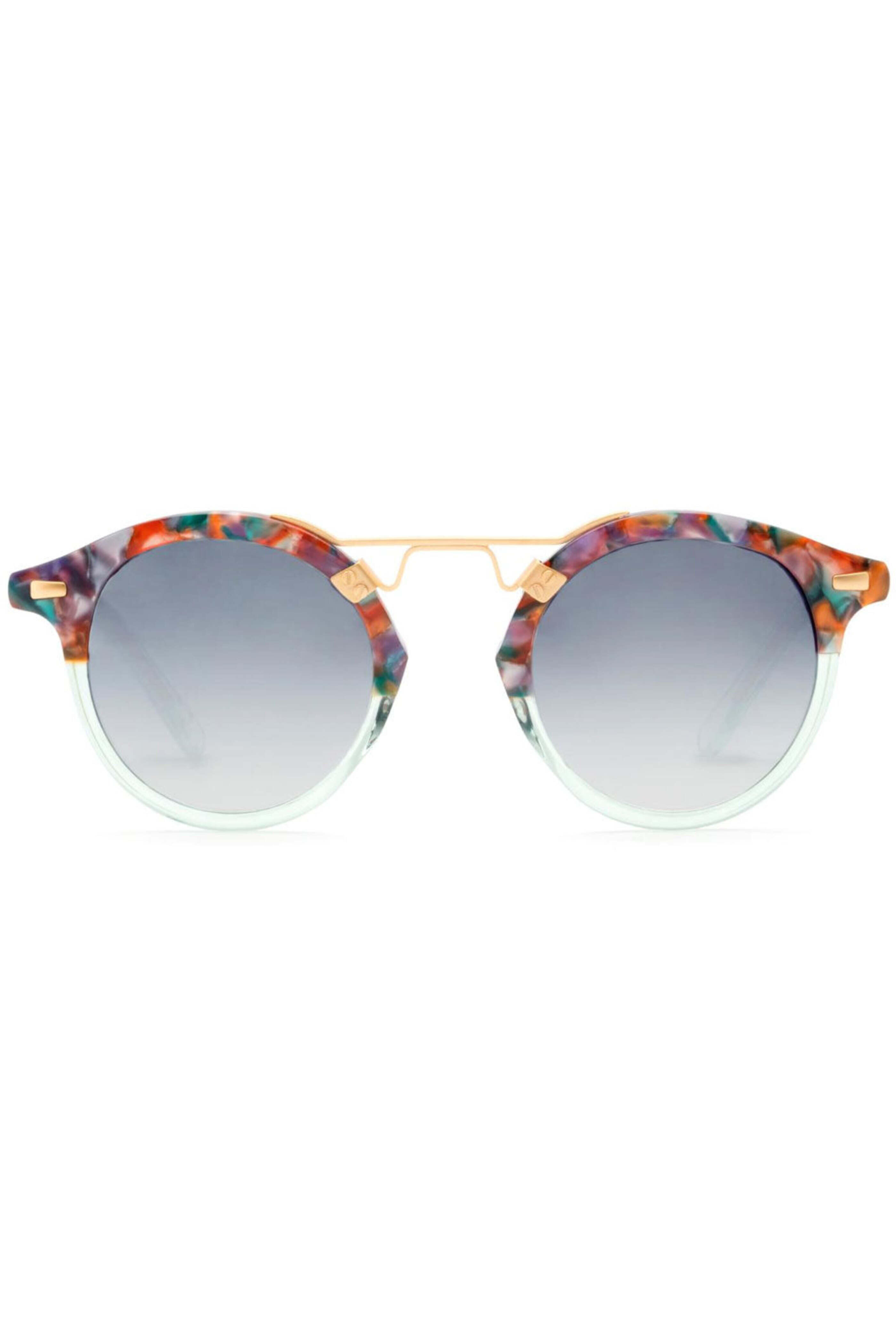 KREWE St. Louis Sunglasses in Confetti to Marine. Round silhouette. Silver gradient mirrored lens. 24K gold plated hardware. Handcrafted acetate frames. Size: 46-23-145. 100% UVA/UVB protection.