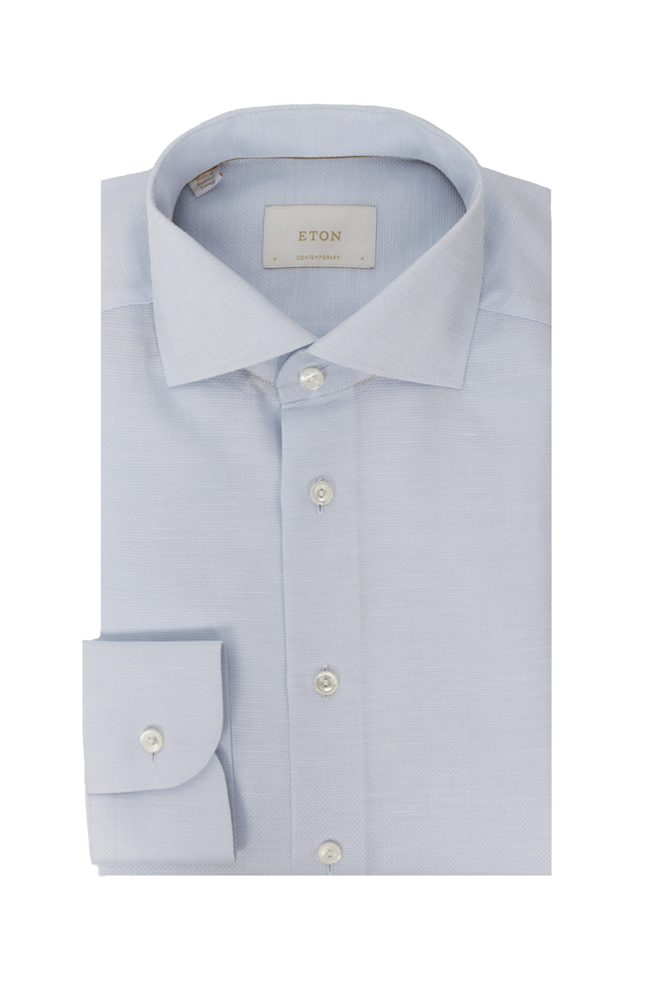 Eton Light Blue Semi Solid Dress Shirt. Spread collar. Button down front closure. Long sleeves. Barrel mitered cuffs. Made in Italy . 75% cotton, 25% linen.