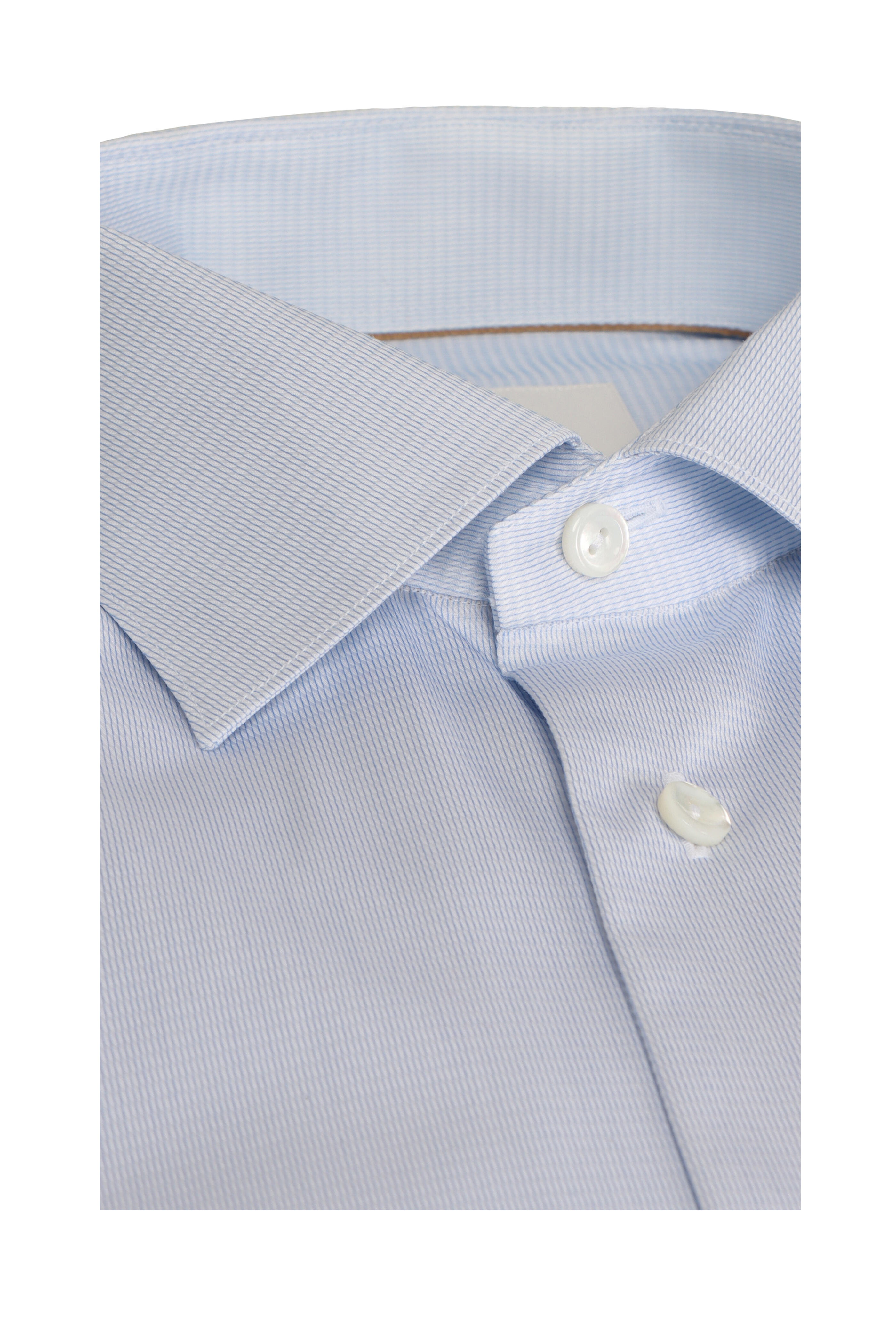 Spread collar. French front button placket. Single button mitered cuffs. Imported. 100% cotton. Machine wash.