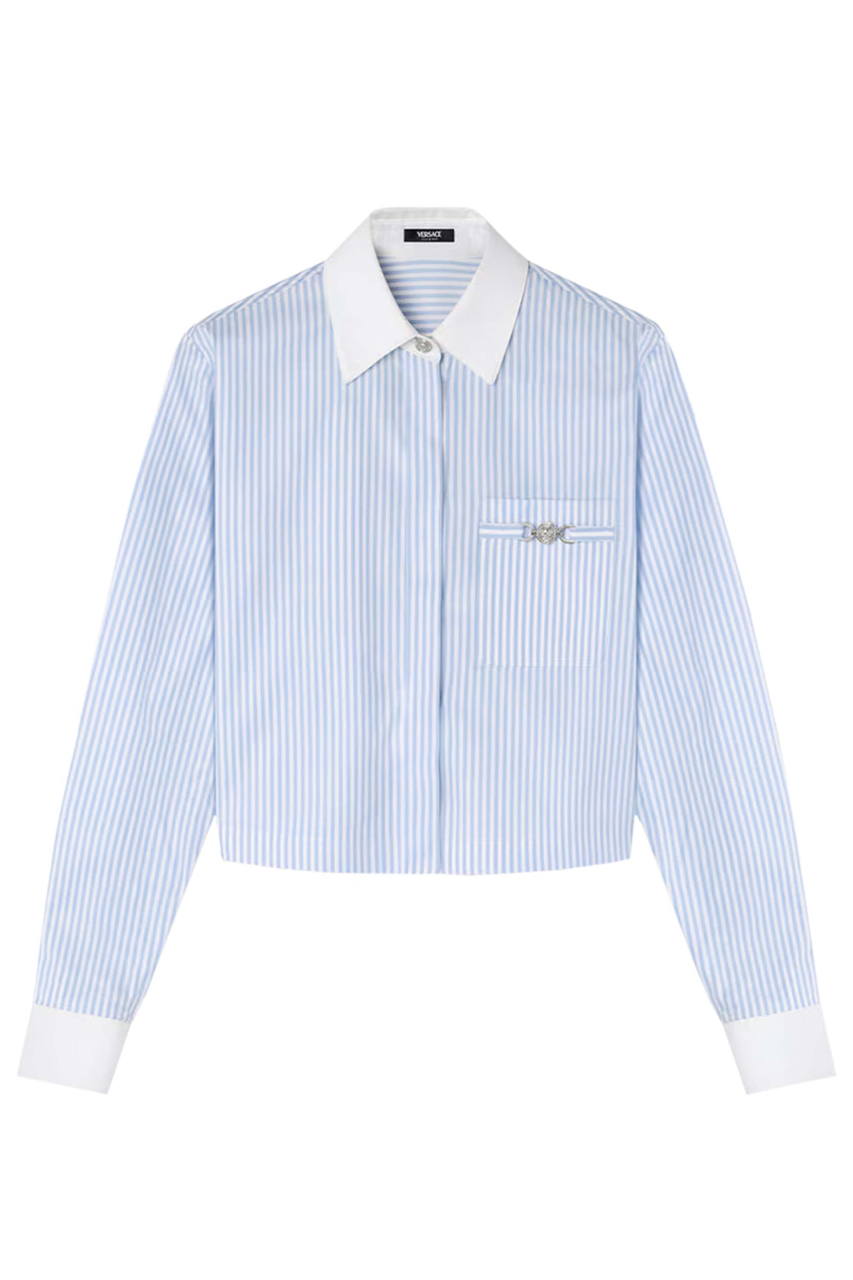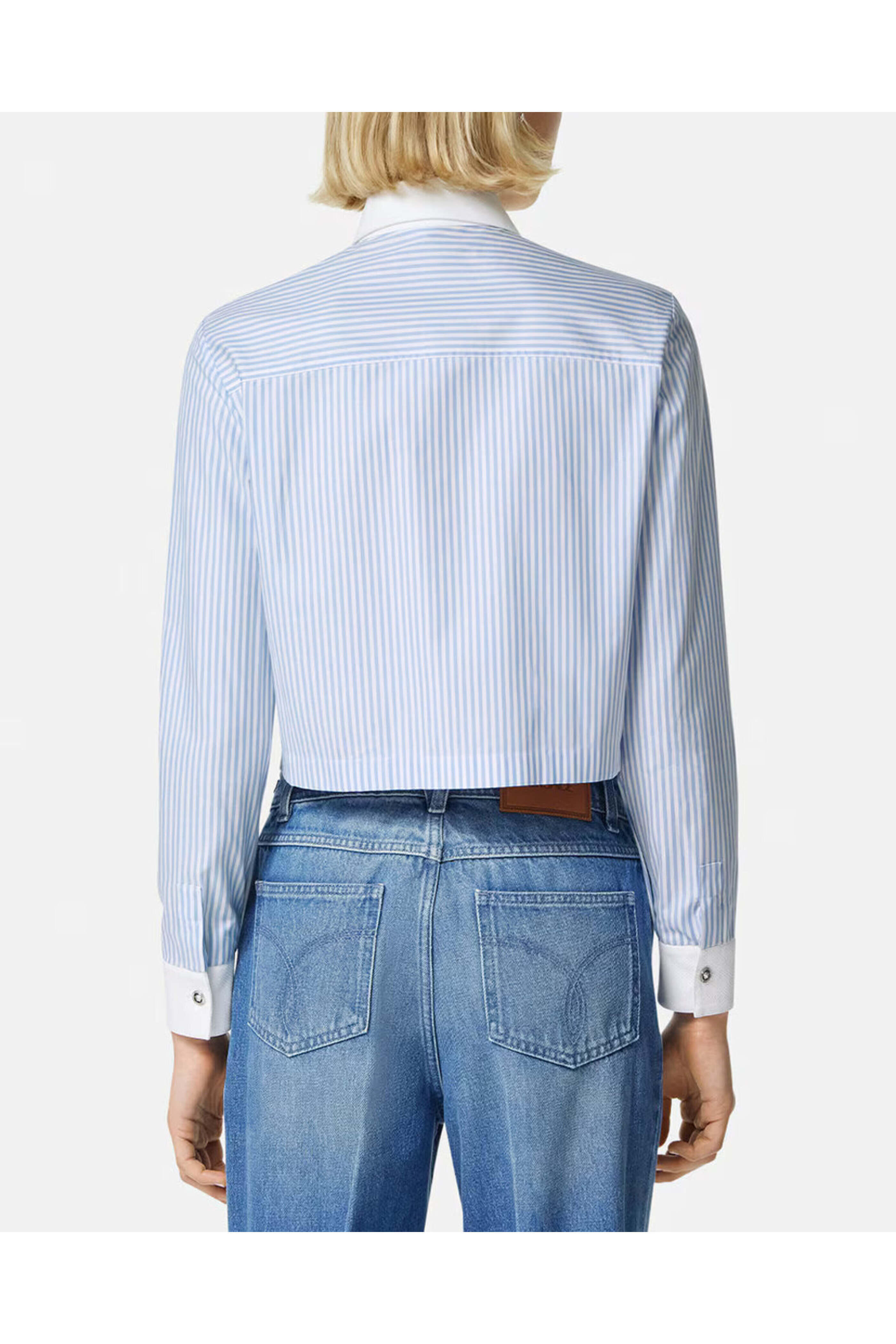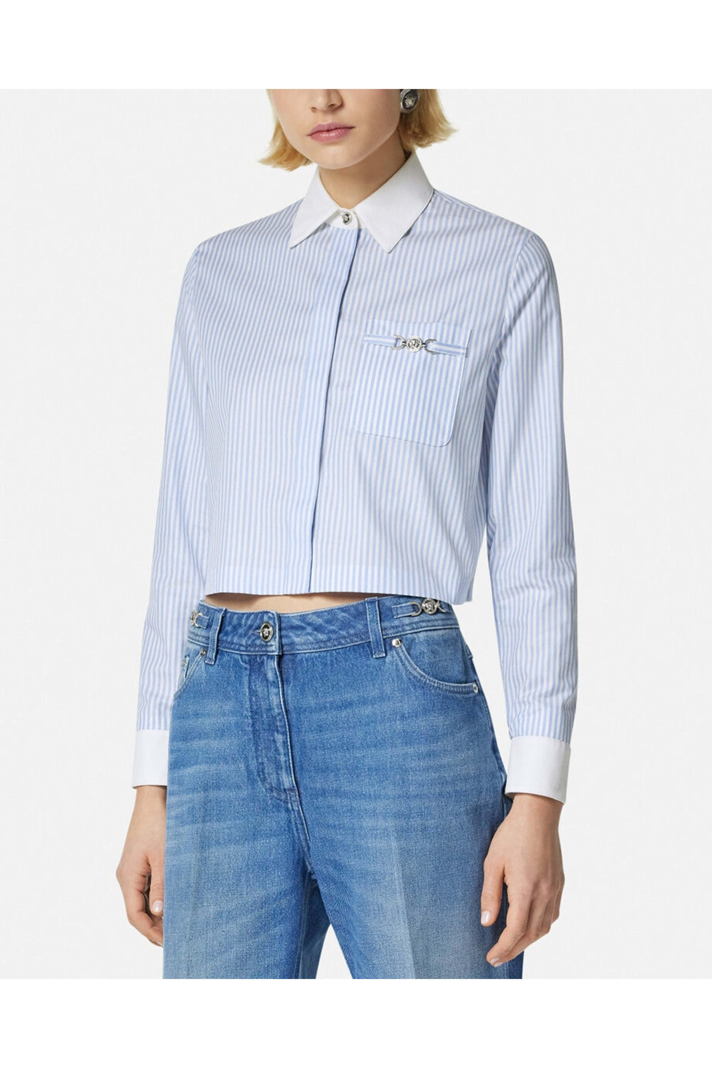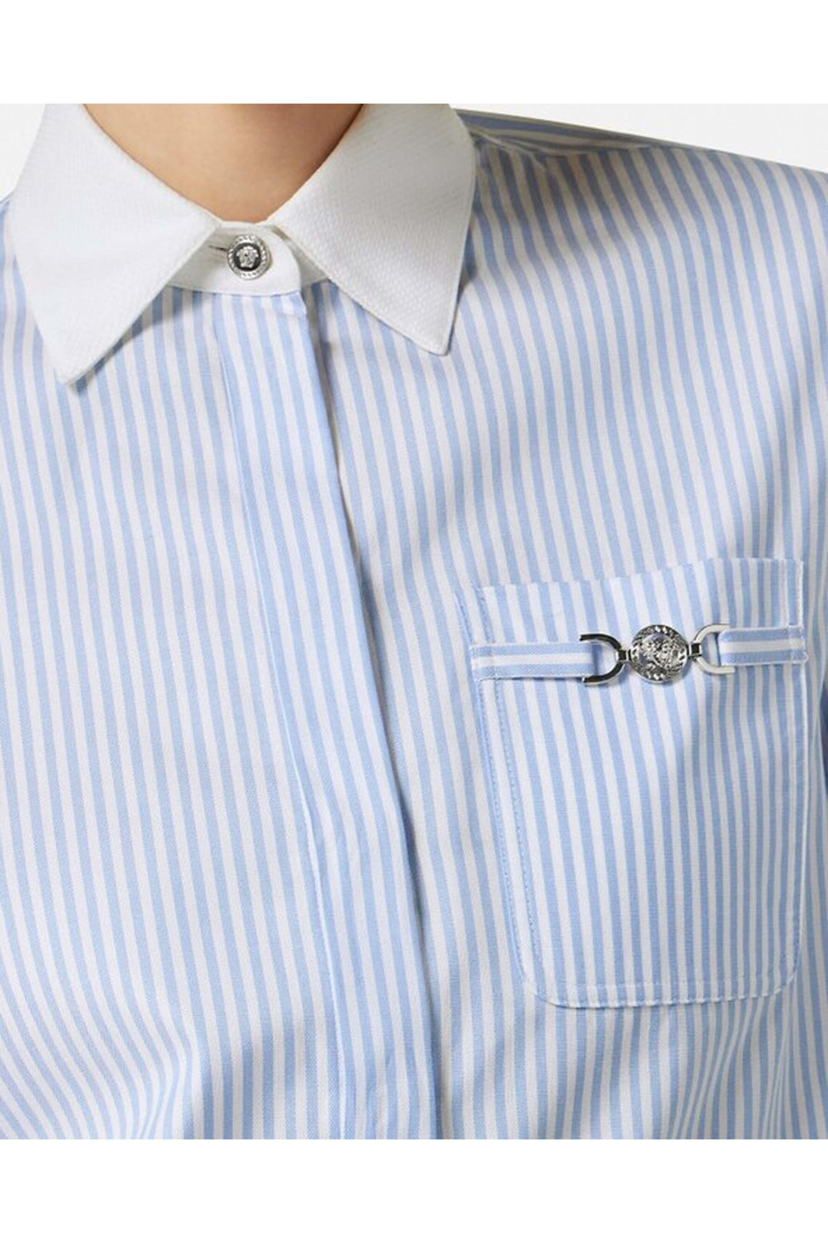 Versace Pastel Blue and White Oxford Stripe Shirt. Collar. Long sleeves; button cuffs. Concealed button down front closure. Single chest patch pocket. Silver tone statement button/ buckle detail. Boxy fit. Cropped length. 100% cotton.