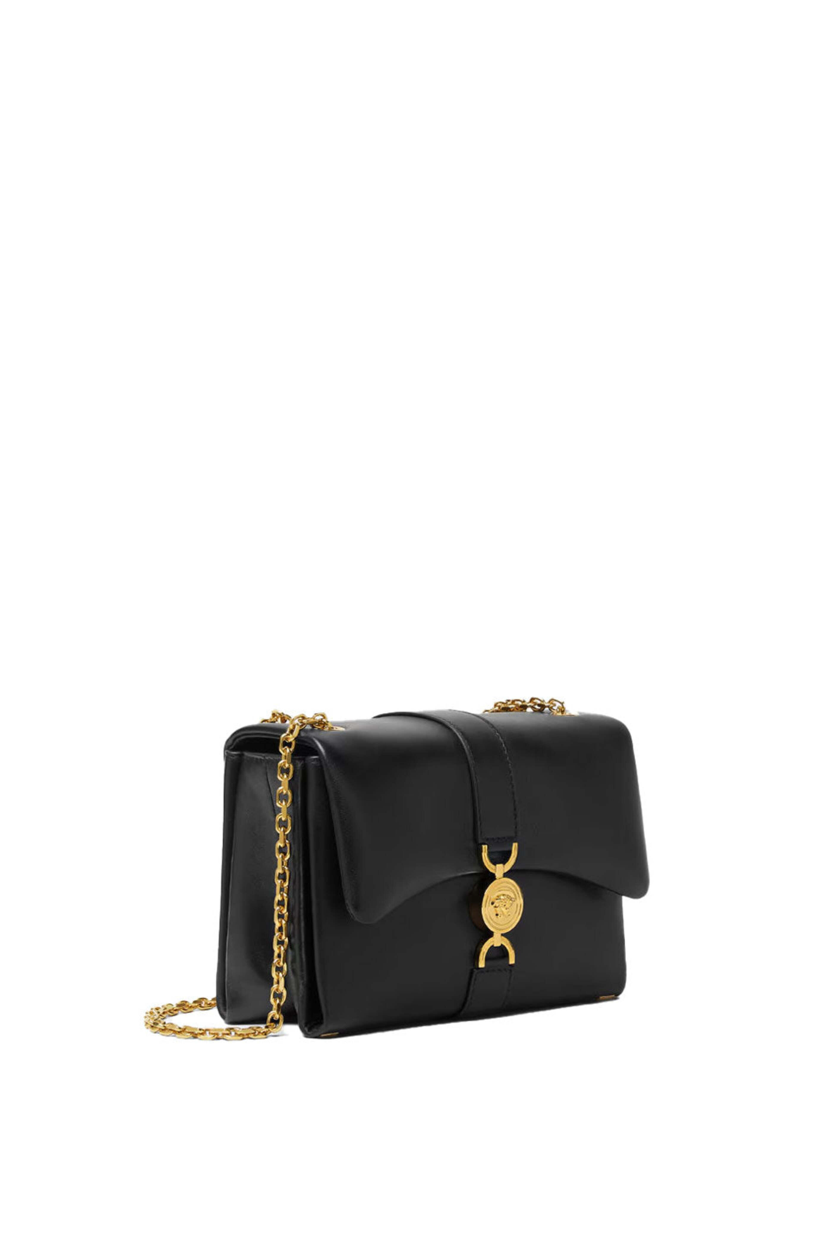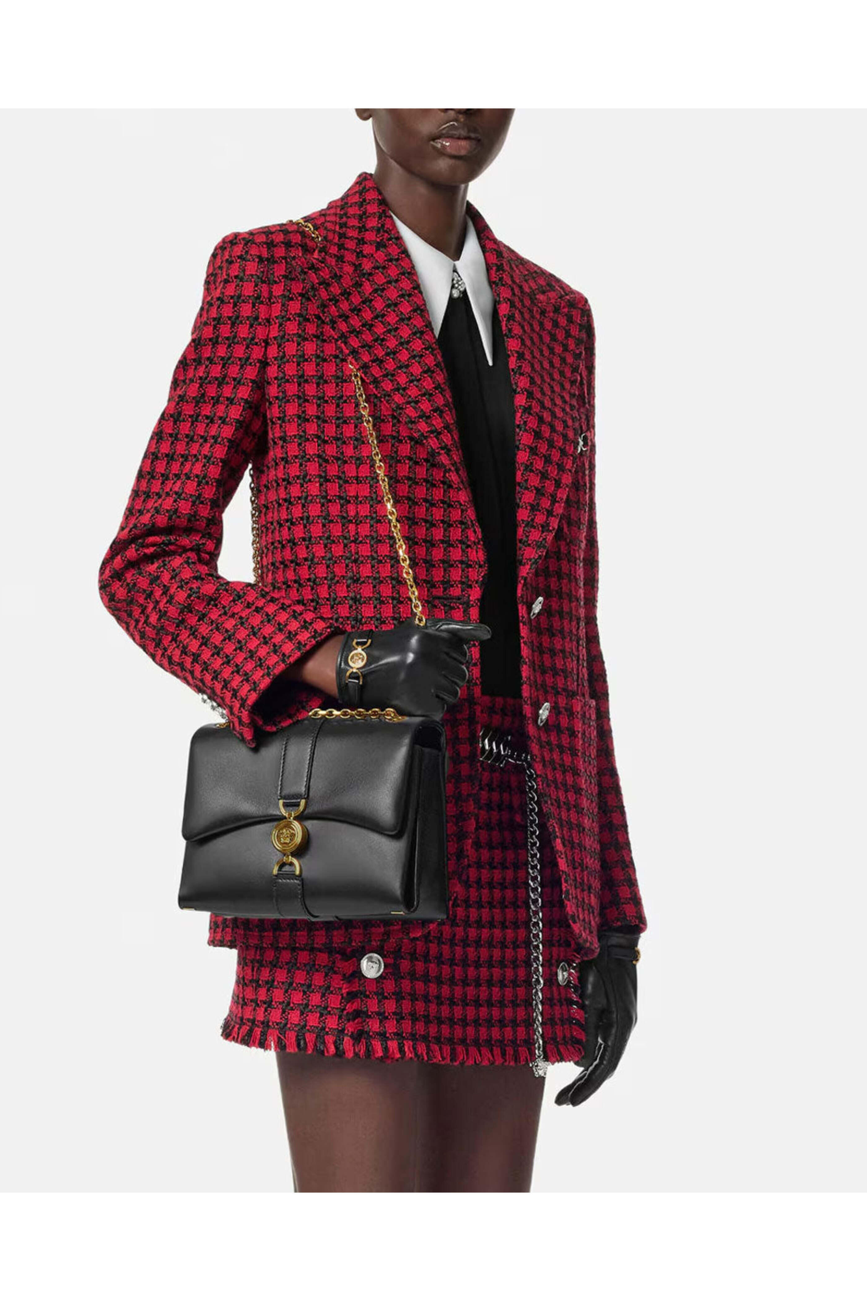 Lambskin outer and lining. Fold over flap. Magnetic interlocking closure. Adjustable chain shoulder straps. Interior slip compartments. Medusa 95 hardware. Made in Italy. 3.5 W x 6.5 H x 8.7 L. 10.8 20.1 strap drop.