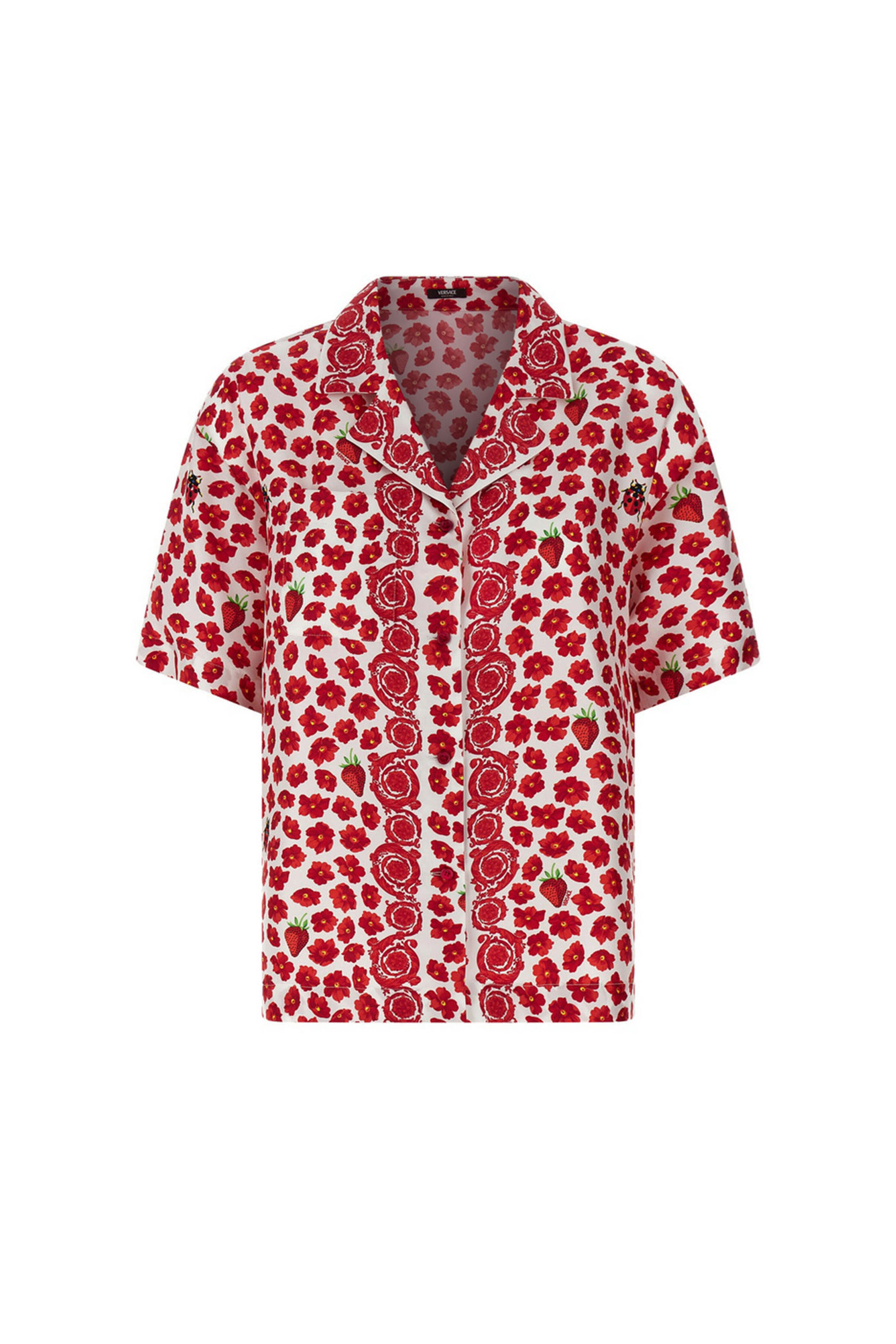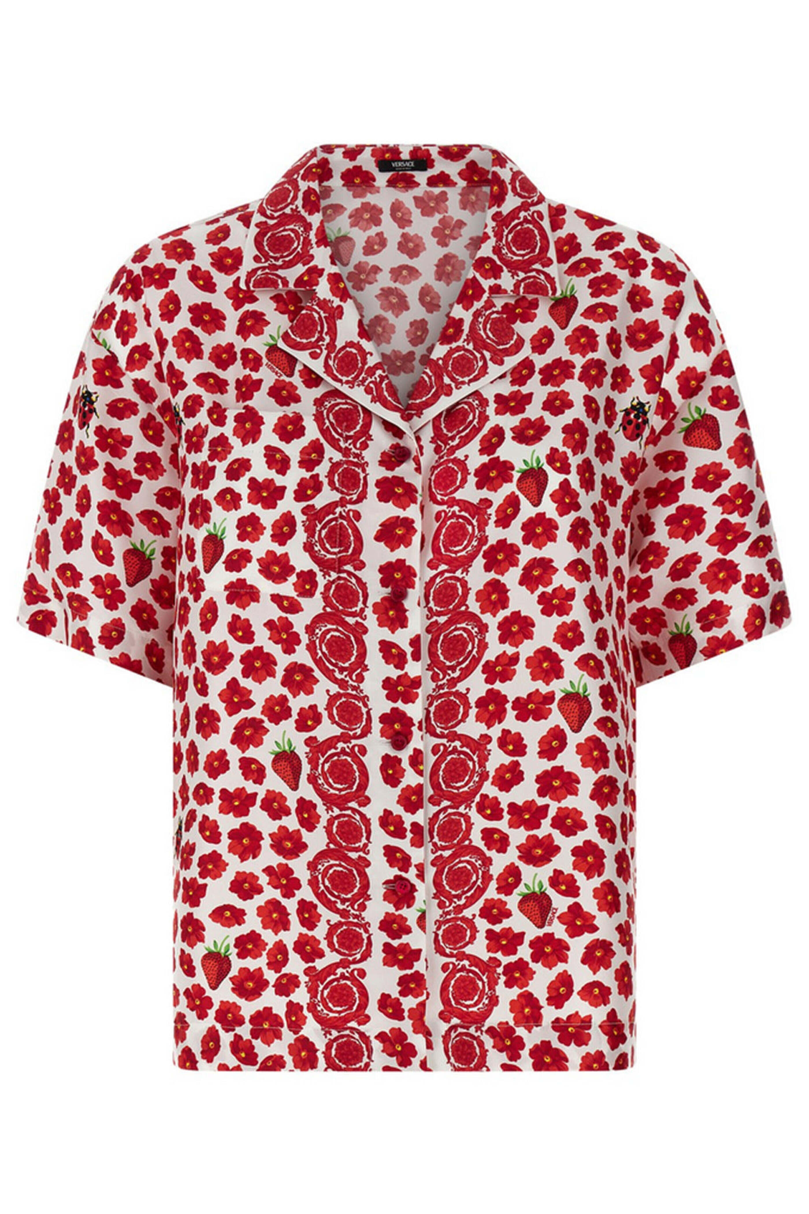 Versace White and Red Strawberry Garden Shirt. Notch collar. Short sleeves. Button down front closure. Single chest patch pocket. Boxy fit. Straight hem. Made in Italy. 100% silk.