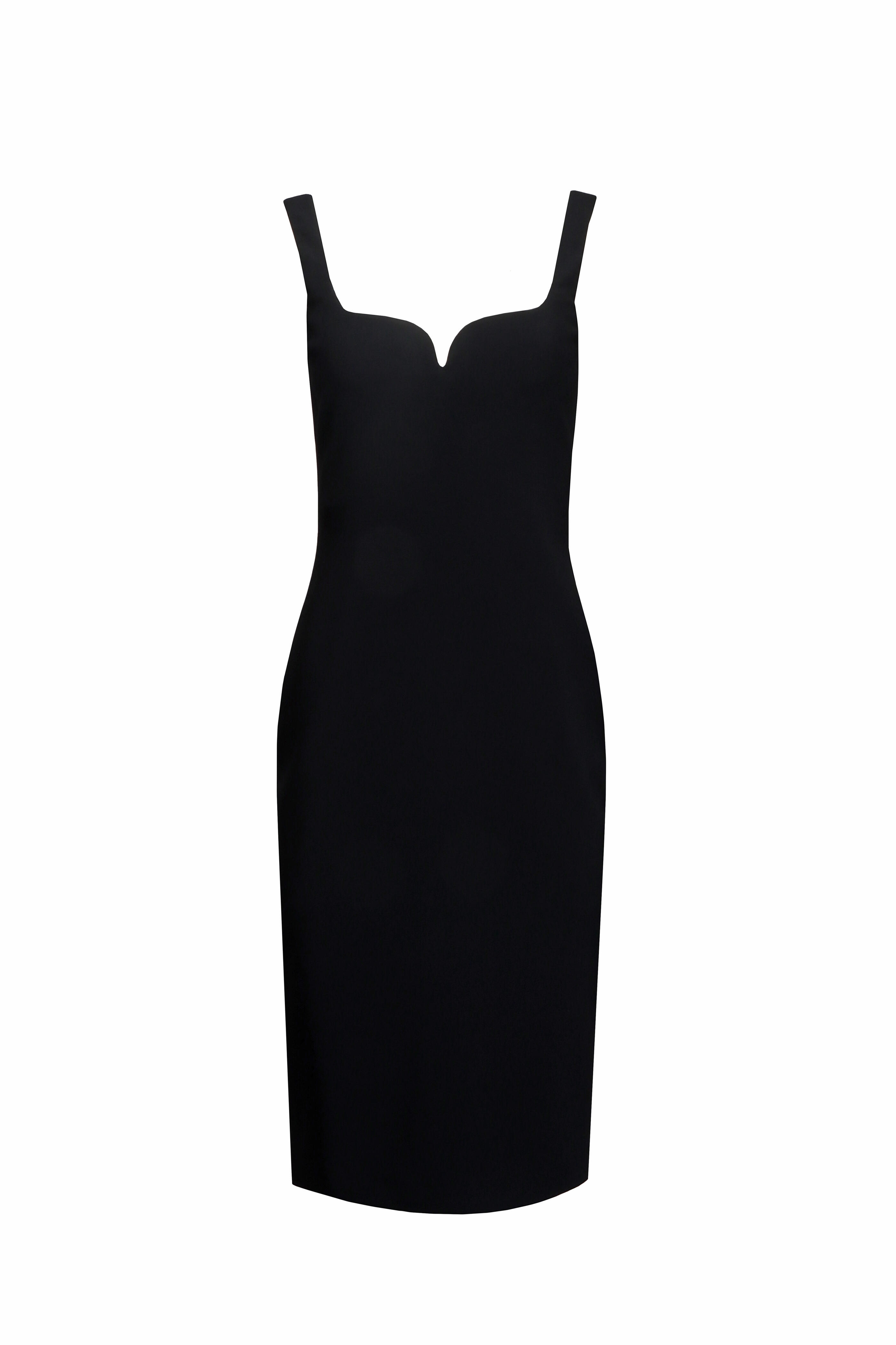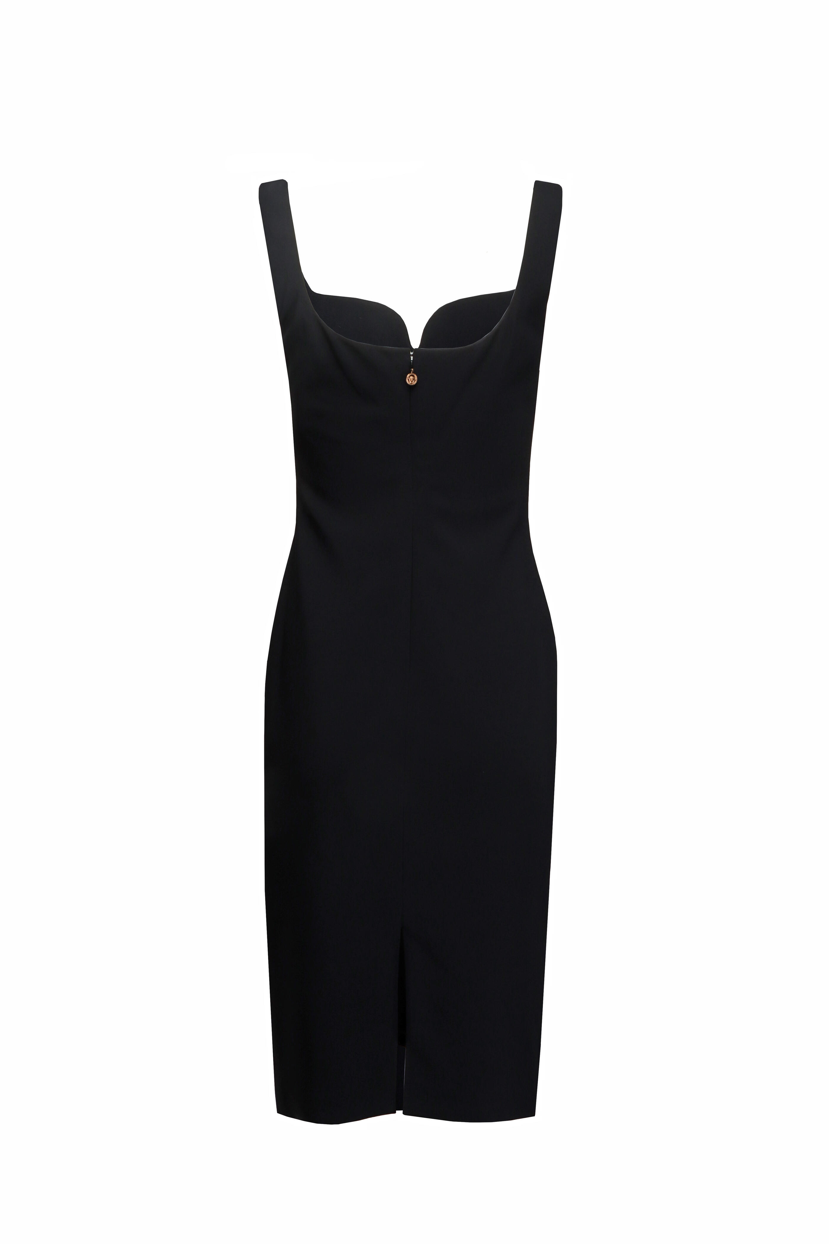 Sweetheart neckline. Scoop back. Sleeveless. Concealed back zip closure; gold tone logo zipper. Slim silhouette. Back hem vent. Made in Italy. Knee length. 95% viscose, 5% elastane outer, 71% acetate, 26% silk, 3% elastane lining 1, 75% acetate, 25% silk lining 2. Dry clean.