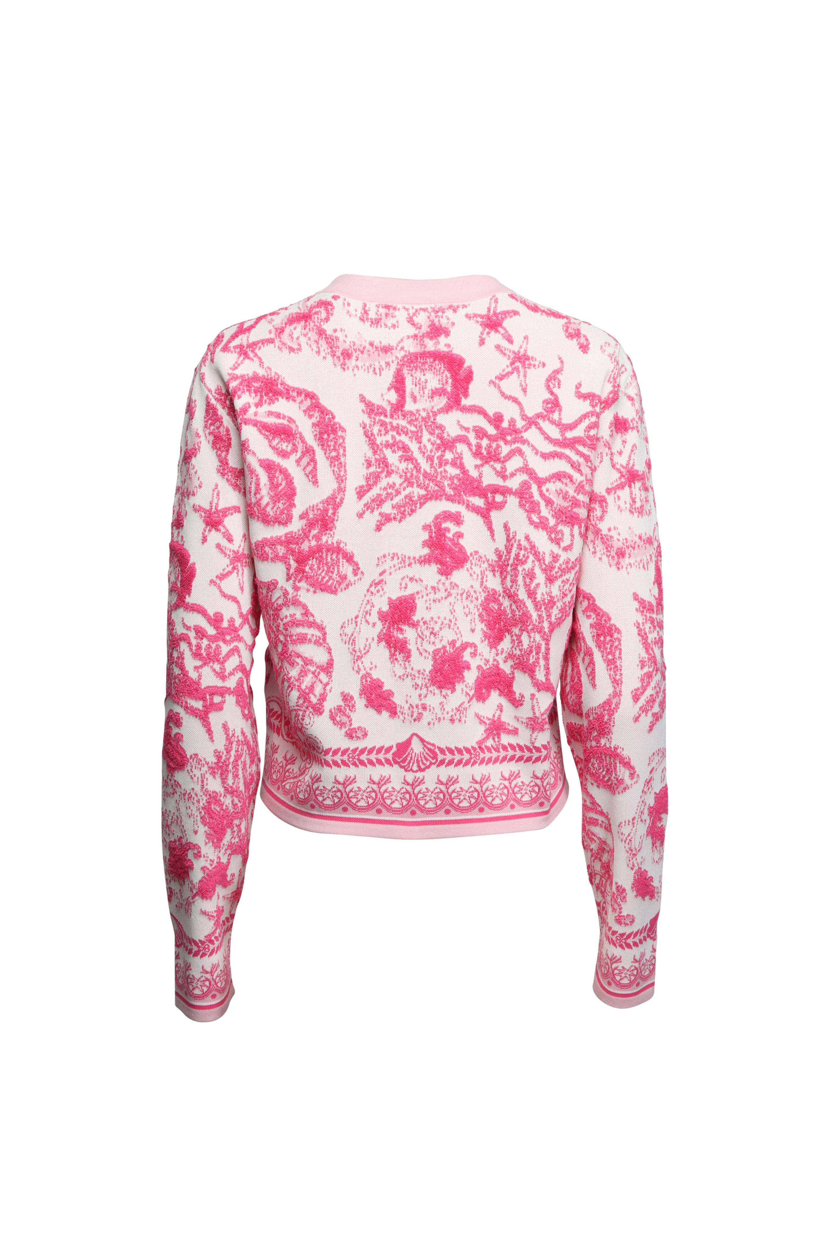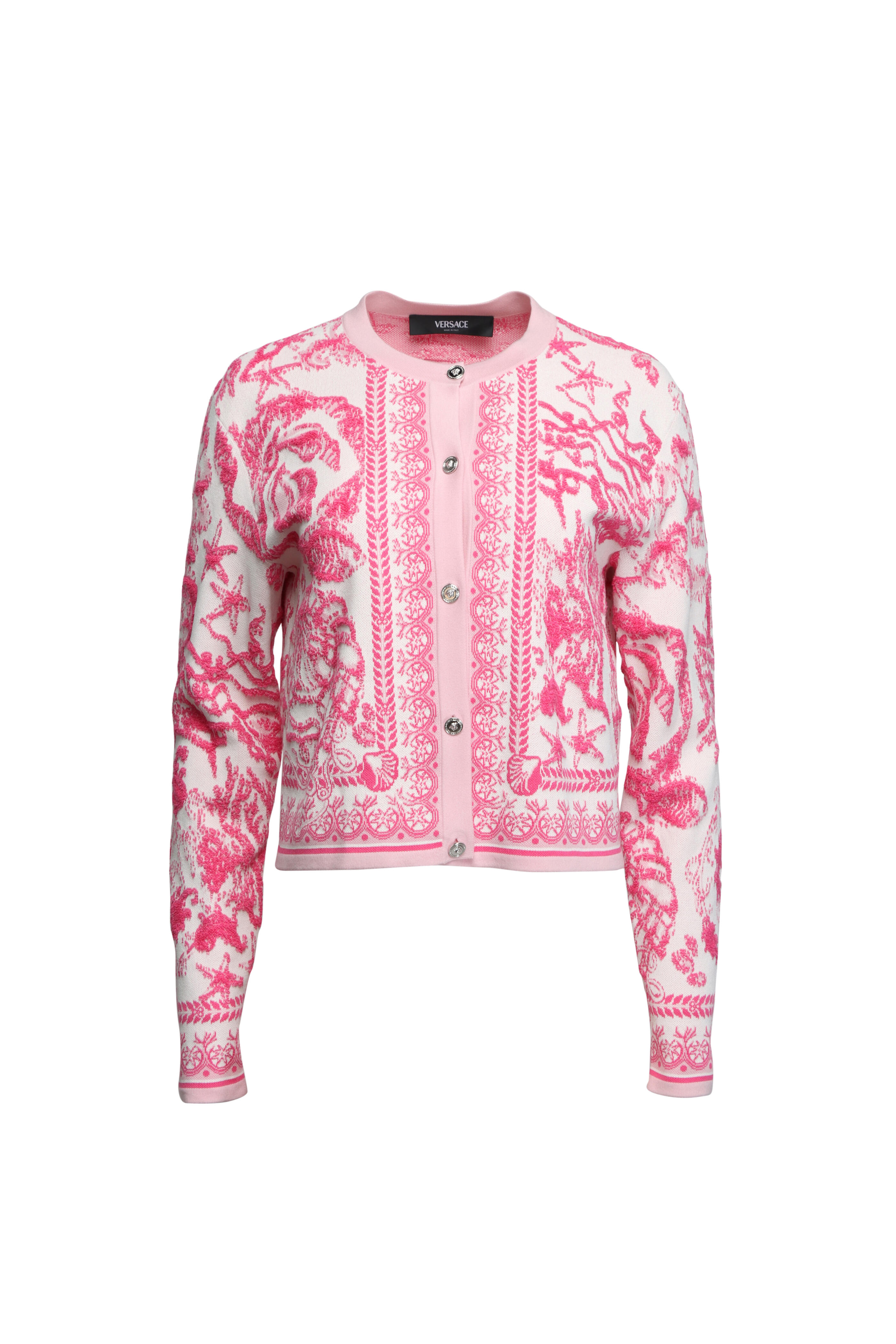 Round neck. Long sleeves. Button down front closure. Silver tone Medusa logo hardware. Classic fit. Rib trim detail. Made in Italy. Shoulders 15.4” (US 4). Sleeve 32.2” (US 4). Bust 34.3” (US 4). Hip 36.6” (US 4). 68% cotton, 26% viscose, 6% polyester. Dry clean.