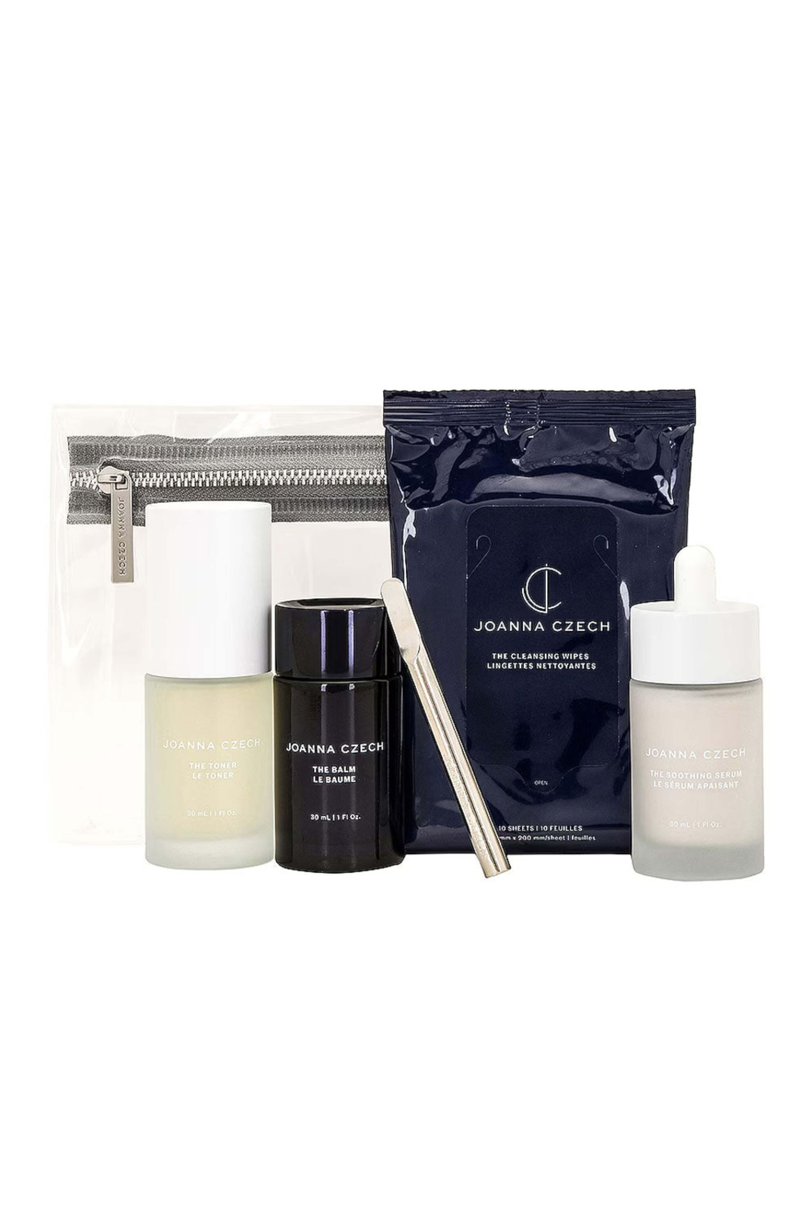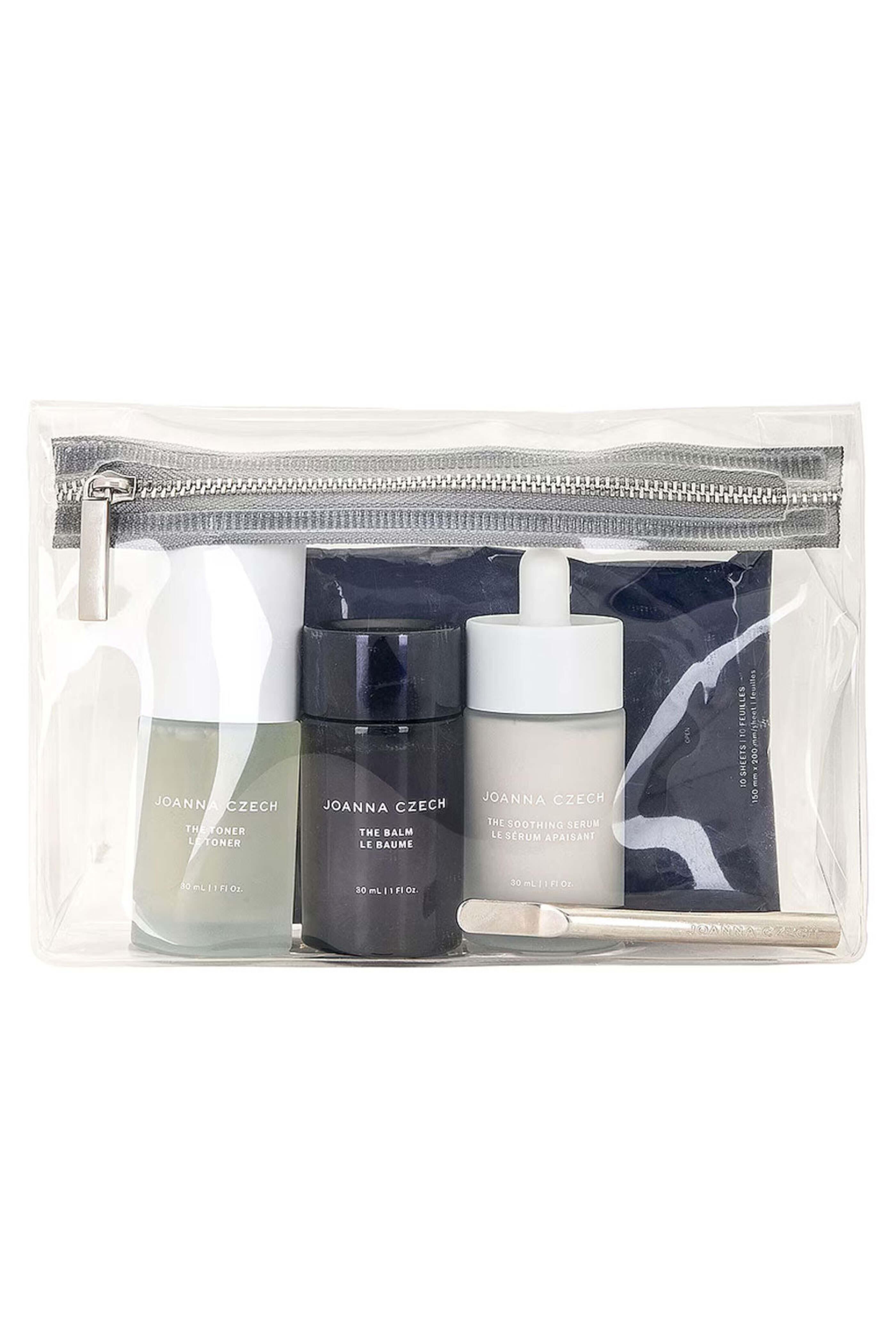 Joanna Czech Skincare The Soothing Kit. Kit includes: The Toner, The Soothing Serum, The Balm, The Cleansing Wipes, The Pouch Pocket. The Soothing Kit comes in a clear zipper pouch . Use it to organize products and devices in your handbag or beach bag. It is so helpful when getting through airport security that Joanna refers to it as ?Heathrow Friendly?.. Cruelty free. The Toner (30mL), The Soothing Serum (30mL), The Balm (30mL), The Cleansing Wipes (10 wipes). The Toner: To apply, spray into the palms or close your eyes and spray directly on the face. Use a firm press and release motion to enhance absorption of the product. Should be used day and night after cleansing. Follow with your serum.. The Soothing Serum: Activate 3-4 drops between your palms and apply on to your face, neck and dcollet using a firm press and release motion to ensure the penetration of the product. Use after The Toner, day or night.. The Cream: Gently spread The Cream into the face, neck and dcollet and then use a firm press and release motion. Use day or night, alone or combined with your serums. The Cleansing Wipes: Use the wipe to gently remove make-up from face, eyes, and neck.