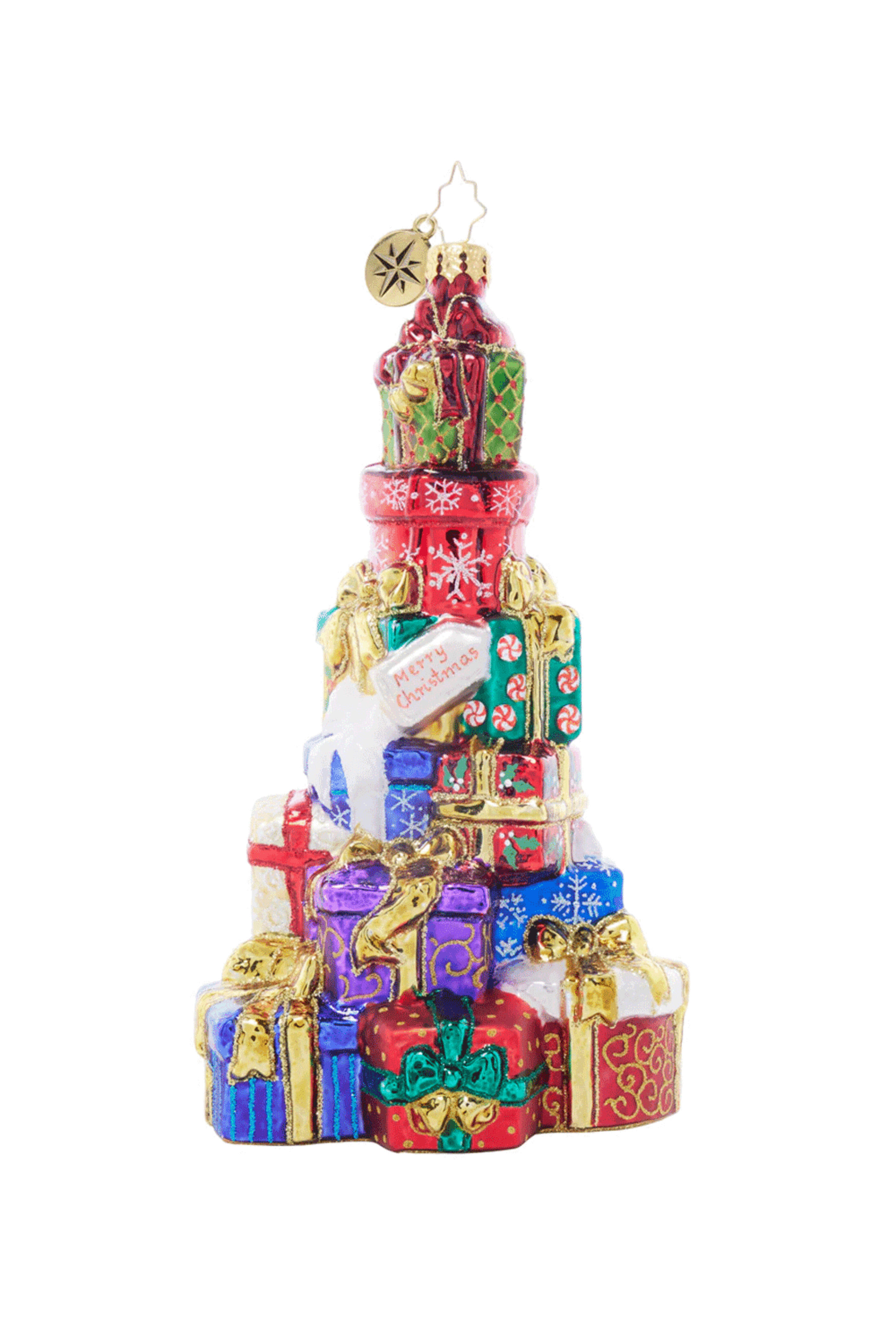Christopher Radko Stacked with Holiday Love. A tower of tiny gifts, each one wrapped with love and stacked high with holiday happiness. A charming reminder that the more, the merrier when it comes to holiday joy.. Dimensions: 8.25 in (H) x 4 in (L) x 3.75 in (W).