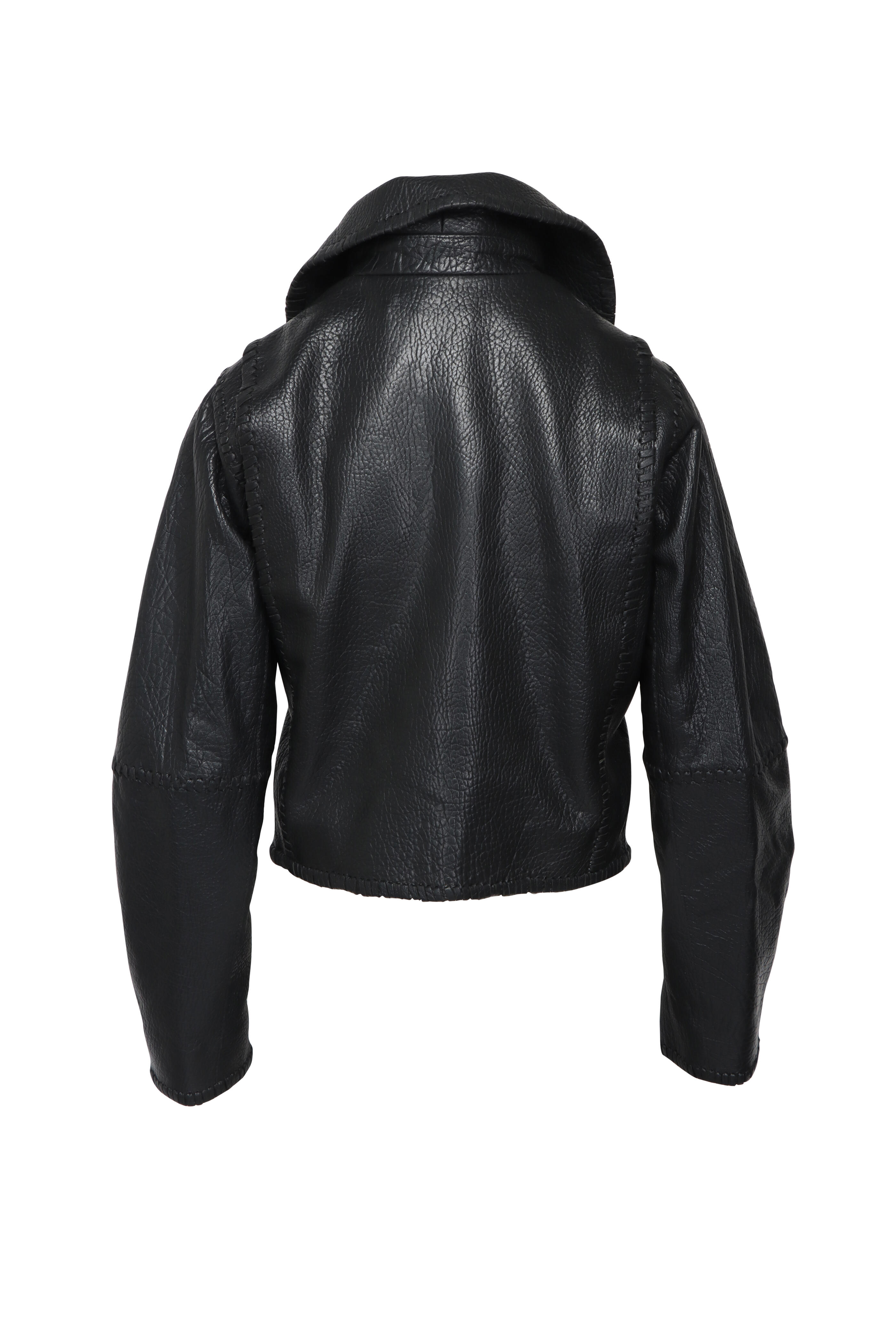 Oversized collar. Long barrel sleeves. Front zip closure. Boxy fit. Whipstitch detail. Imported. Cropped length. 100% leather. Dry clean with leather specialist.