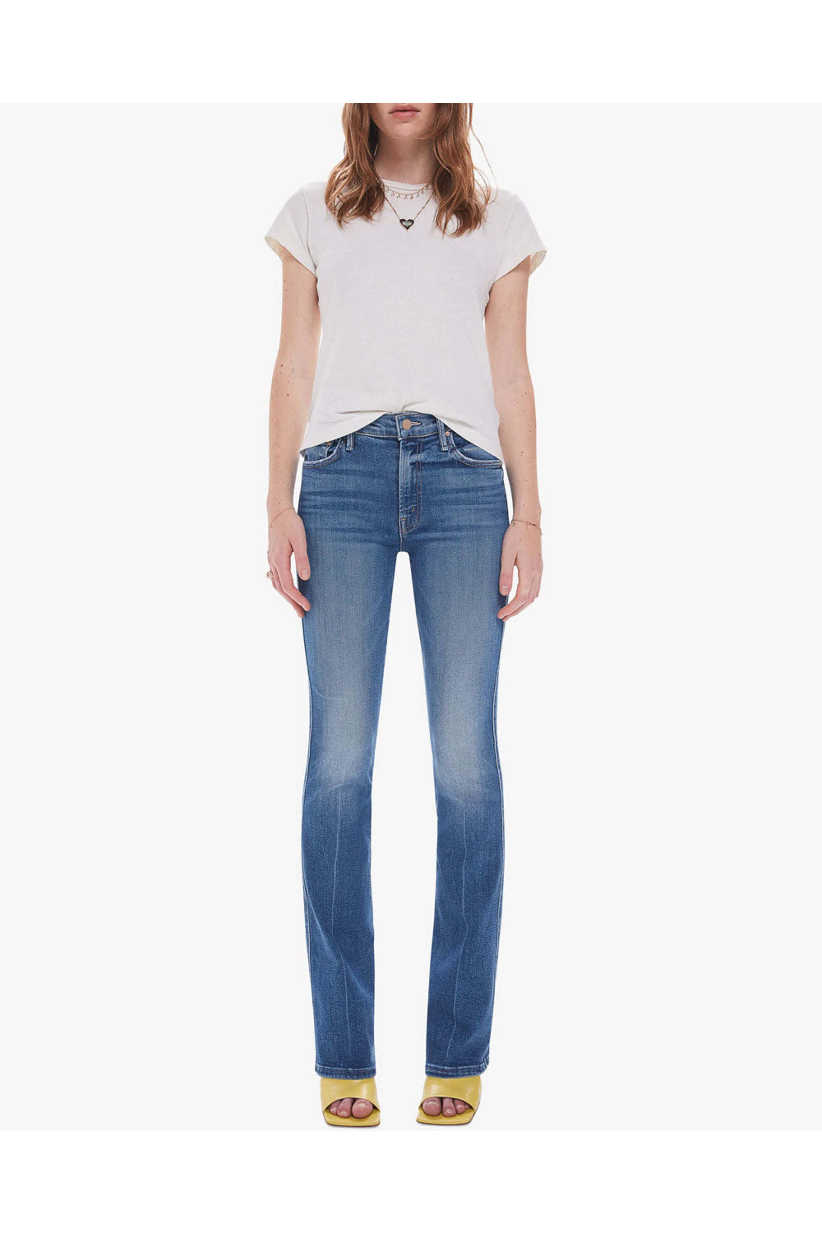 Mother The Double Insider Heel in Opposites Attract. Mid rise. Button closure. Zip fly. Belt loops. Five pocket style. Full length; clean hem. Bootcut silhouette. 76% Cotton, 16% Modal, 4% Polyester, 2% Elastane.