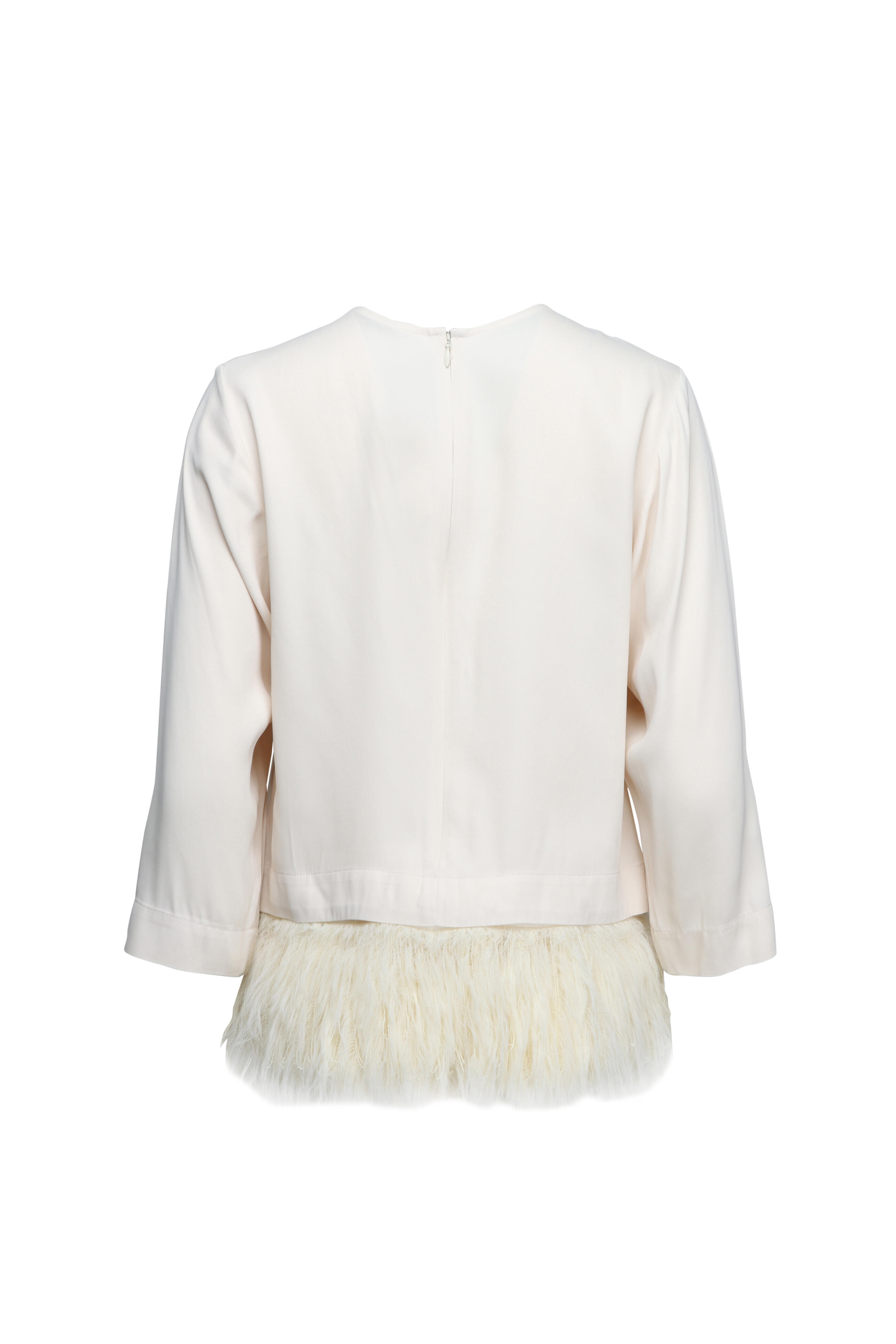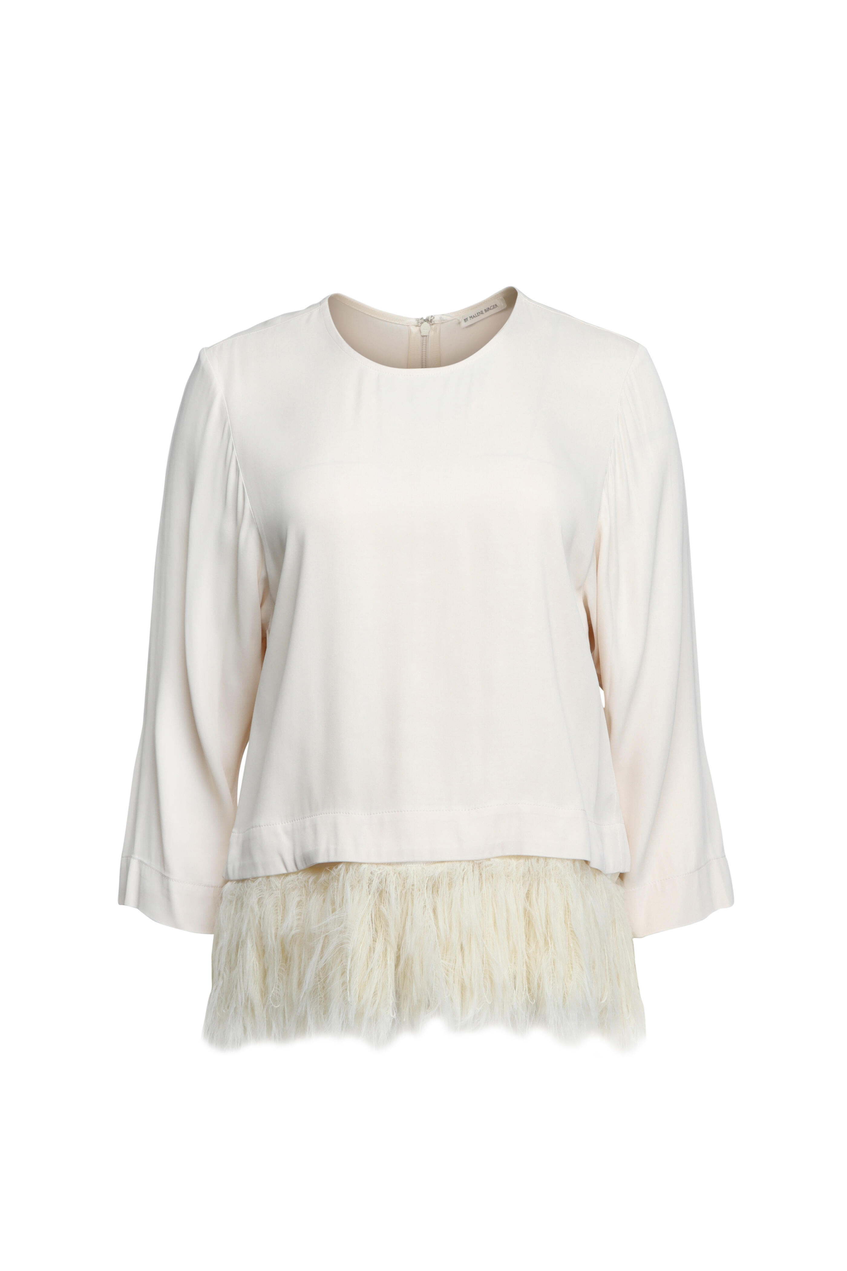 Round neck. Three-quarter length sleeves. Concealed back zip closure. Straight hem. Removable feather hem detail. Imported. 66% acetate, 34% viscose. Dry clean.