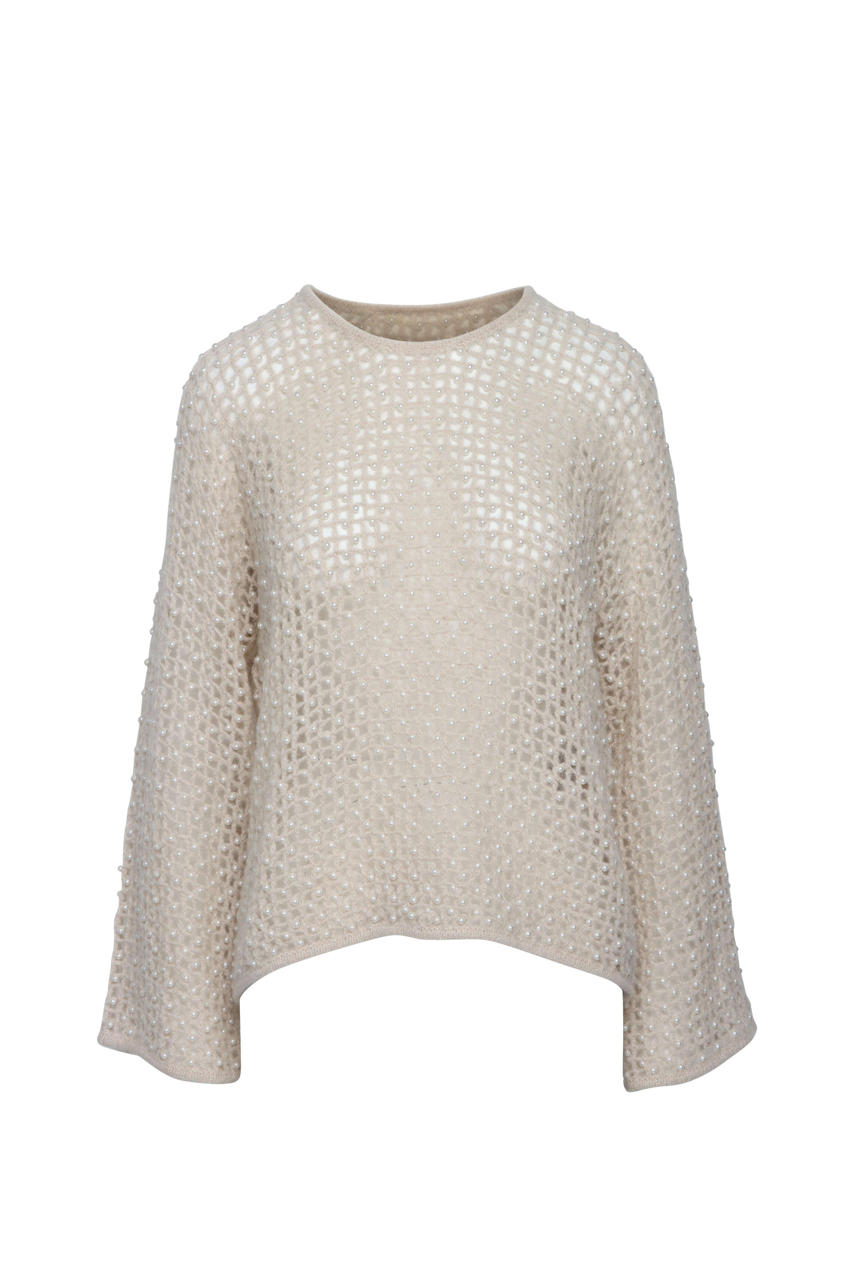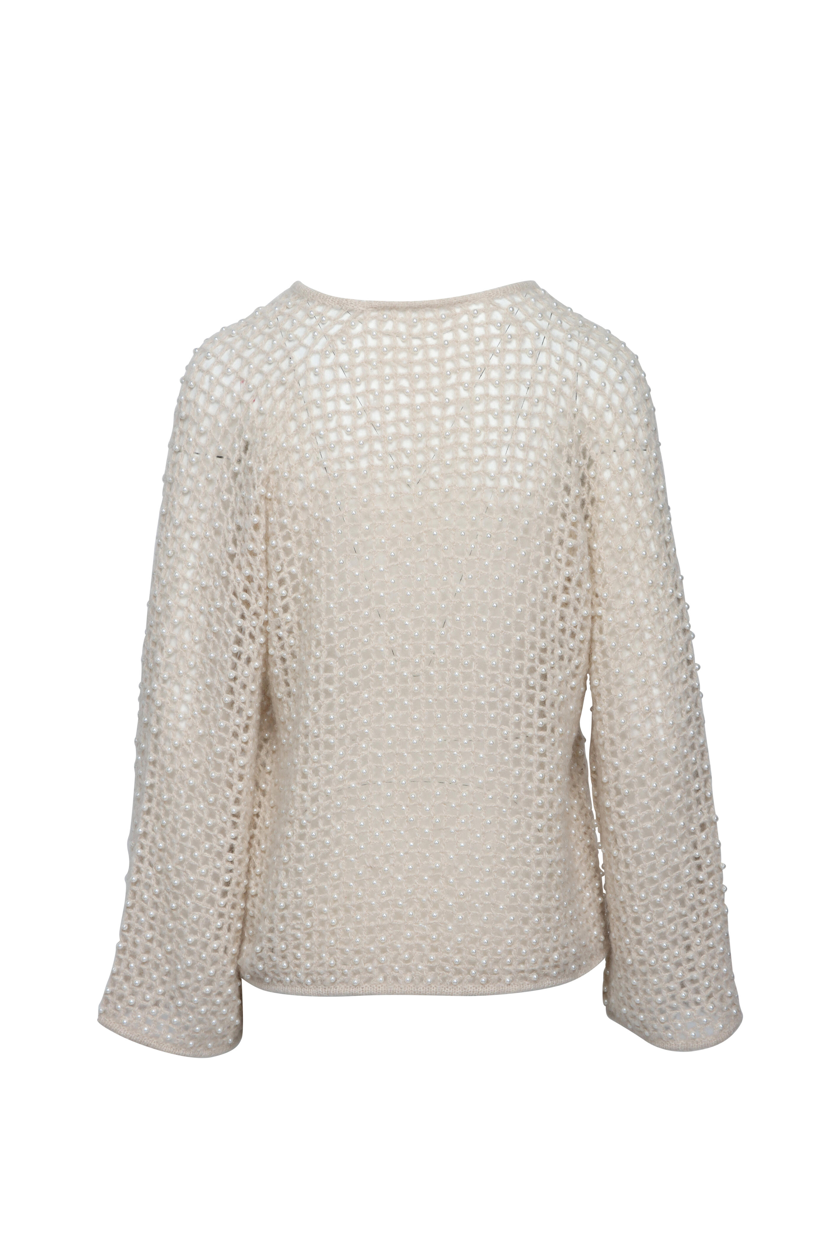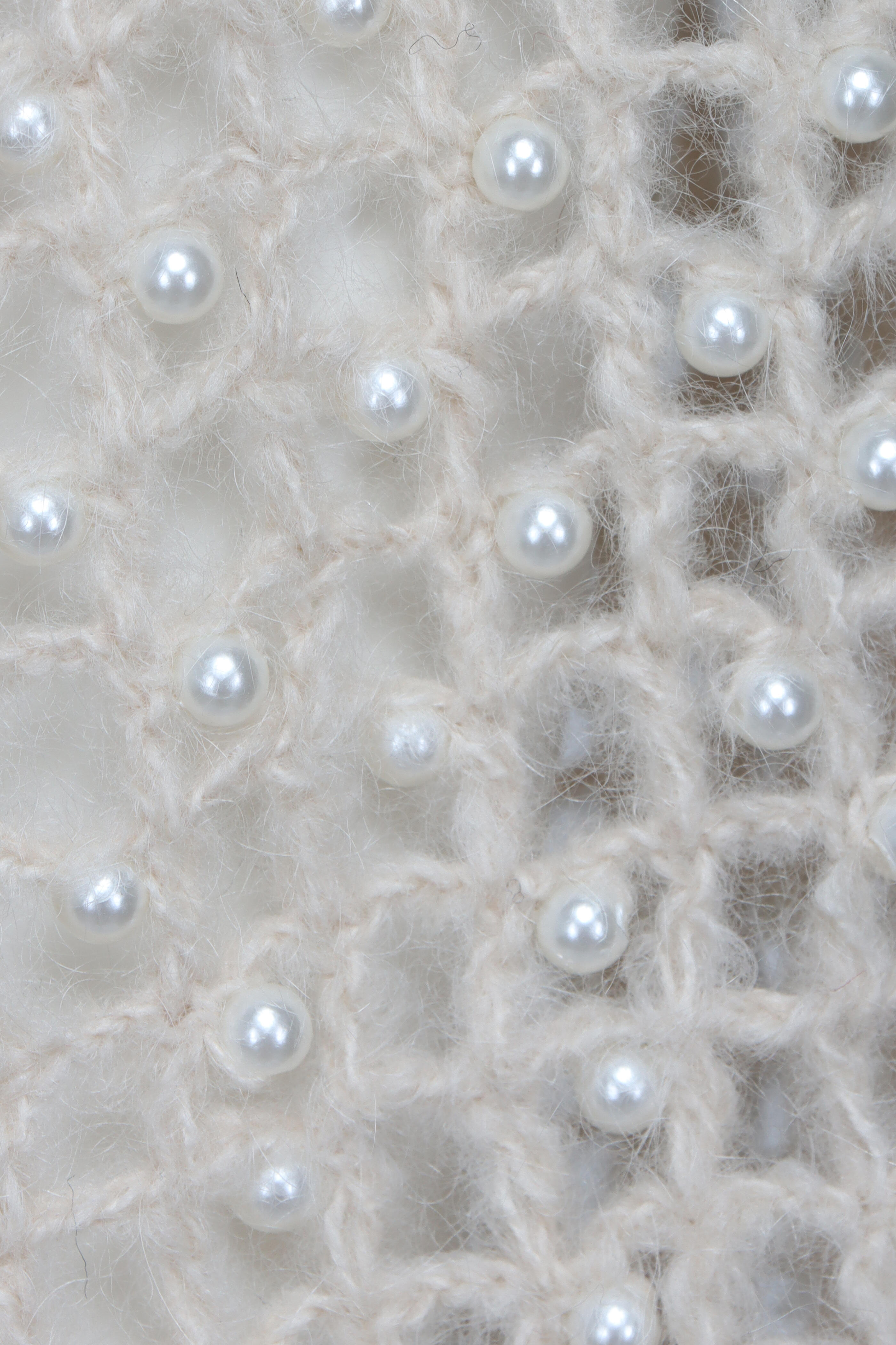 Round neck. Long wide sleeves. Open knit. Relaxed fit. Pearl embellishments throughout. Imported. 49% wool, 30% mohair, 21% polyamide. Handwash.