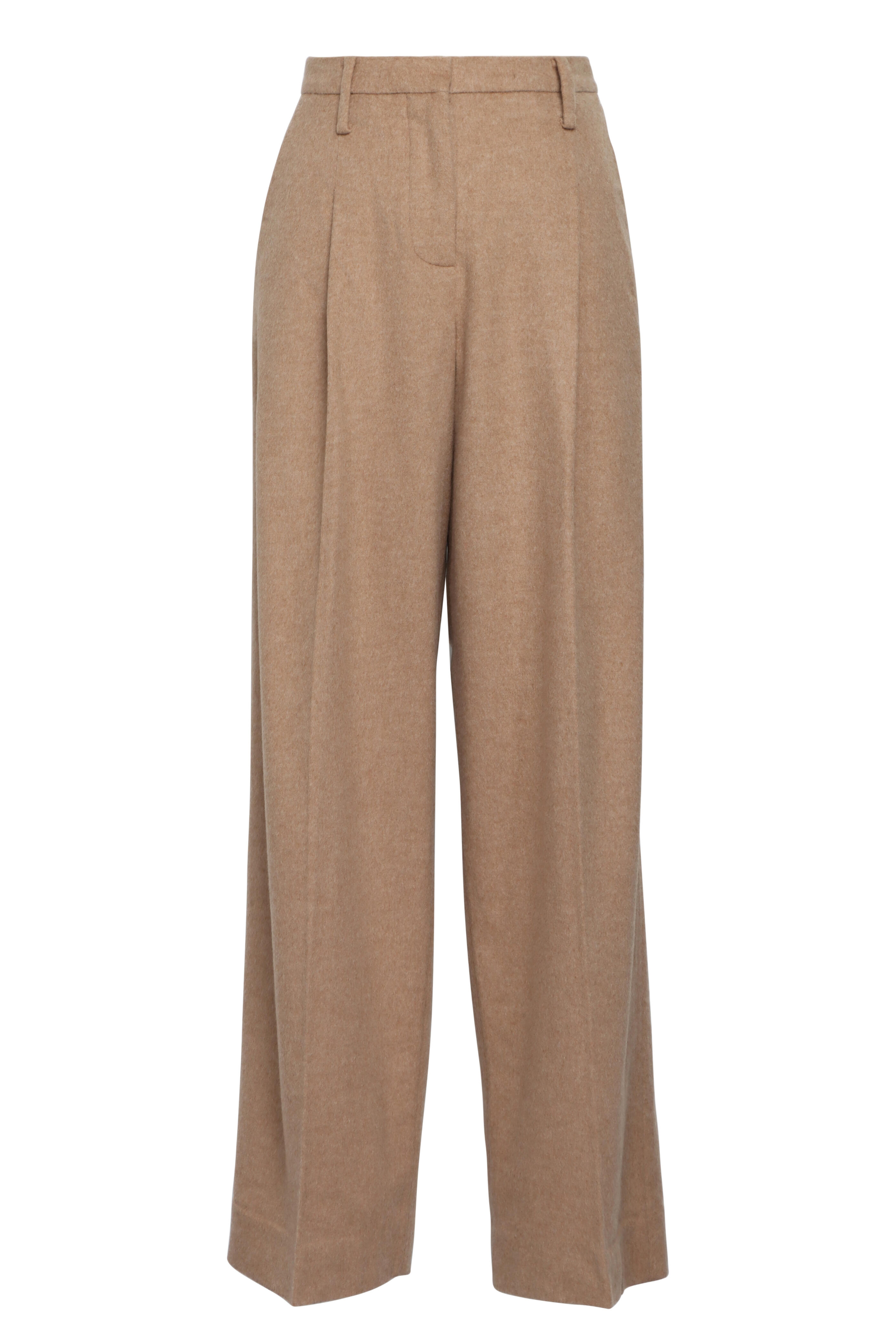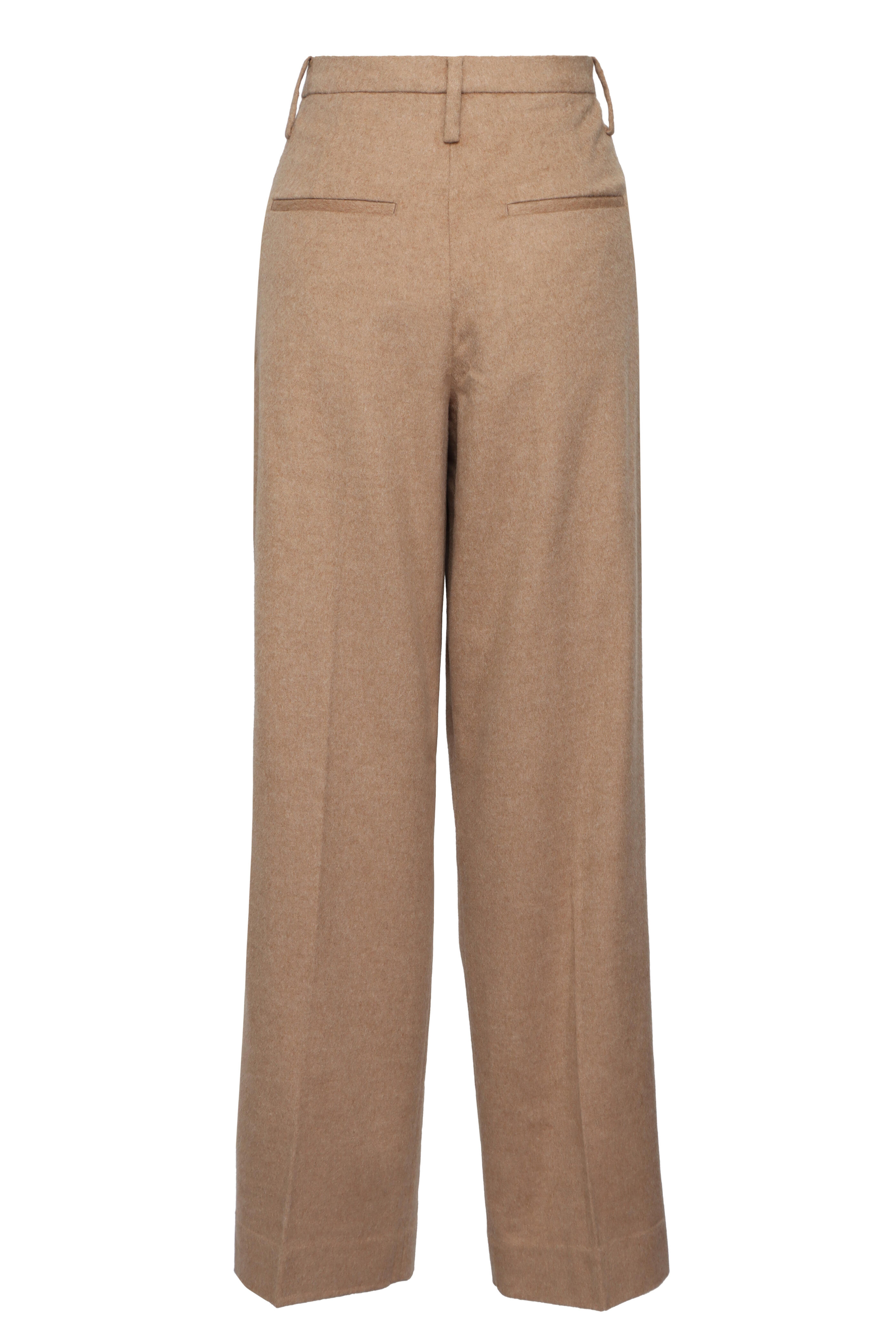 High rise. Hook and eye. Zip fly. Belt loops. Side slip pockets. Back pockets. Front pleat detail. Wide through leg. Imported. Full length. 80% wool, 10% silk, 10% cashmere. Handwash.