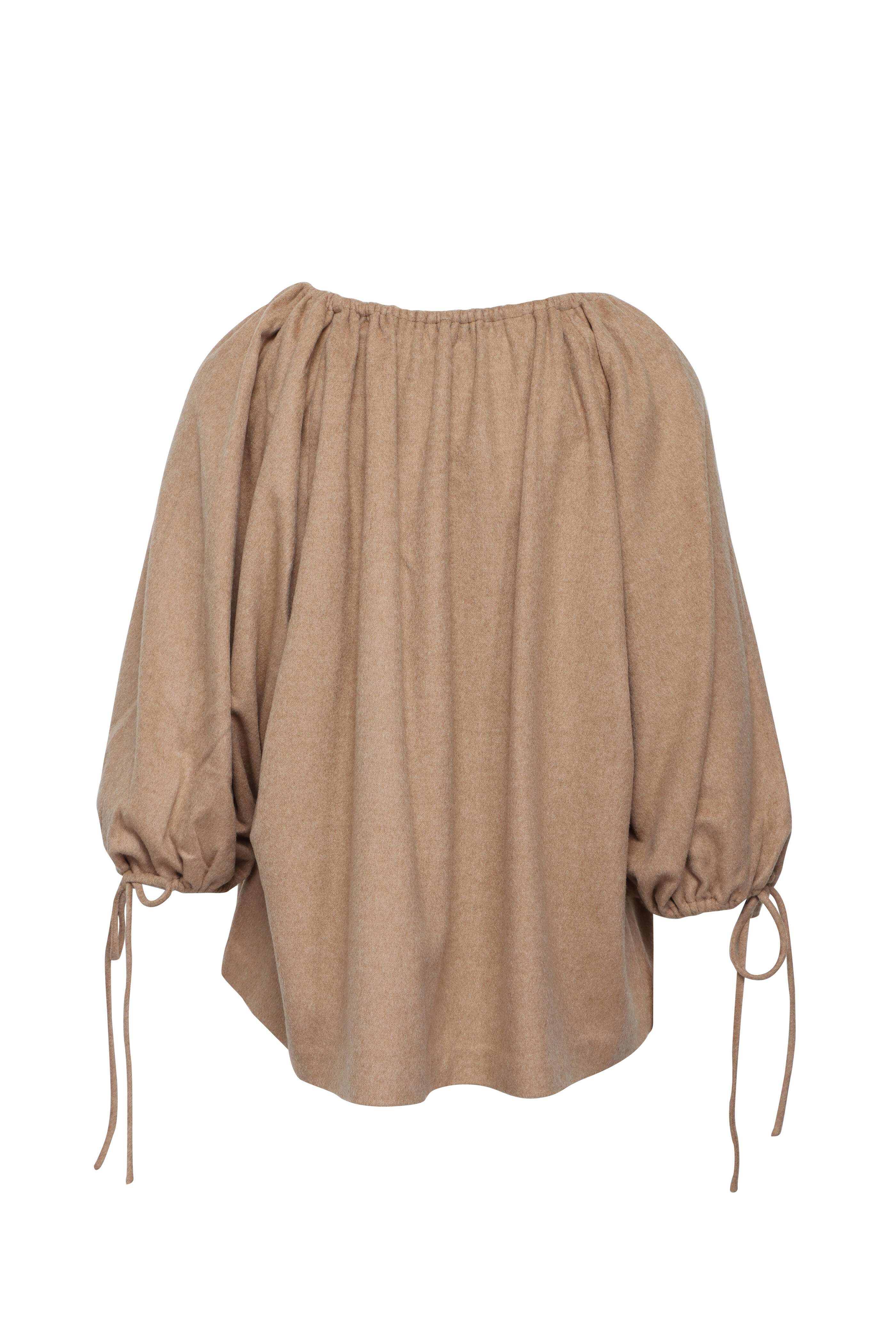 Round neck; self-tie closure. Elbow length raglan sleeves; self-tie cuffs. Relaxed fit. Imported. 80% wool, 10% silk, 10% cashmere. Handwash.