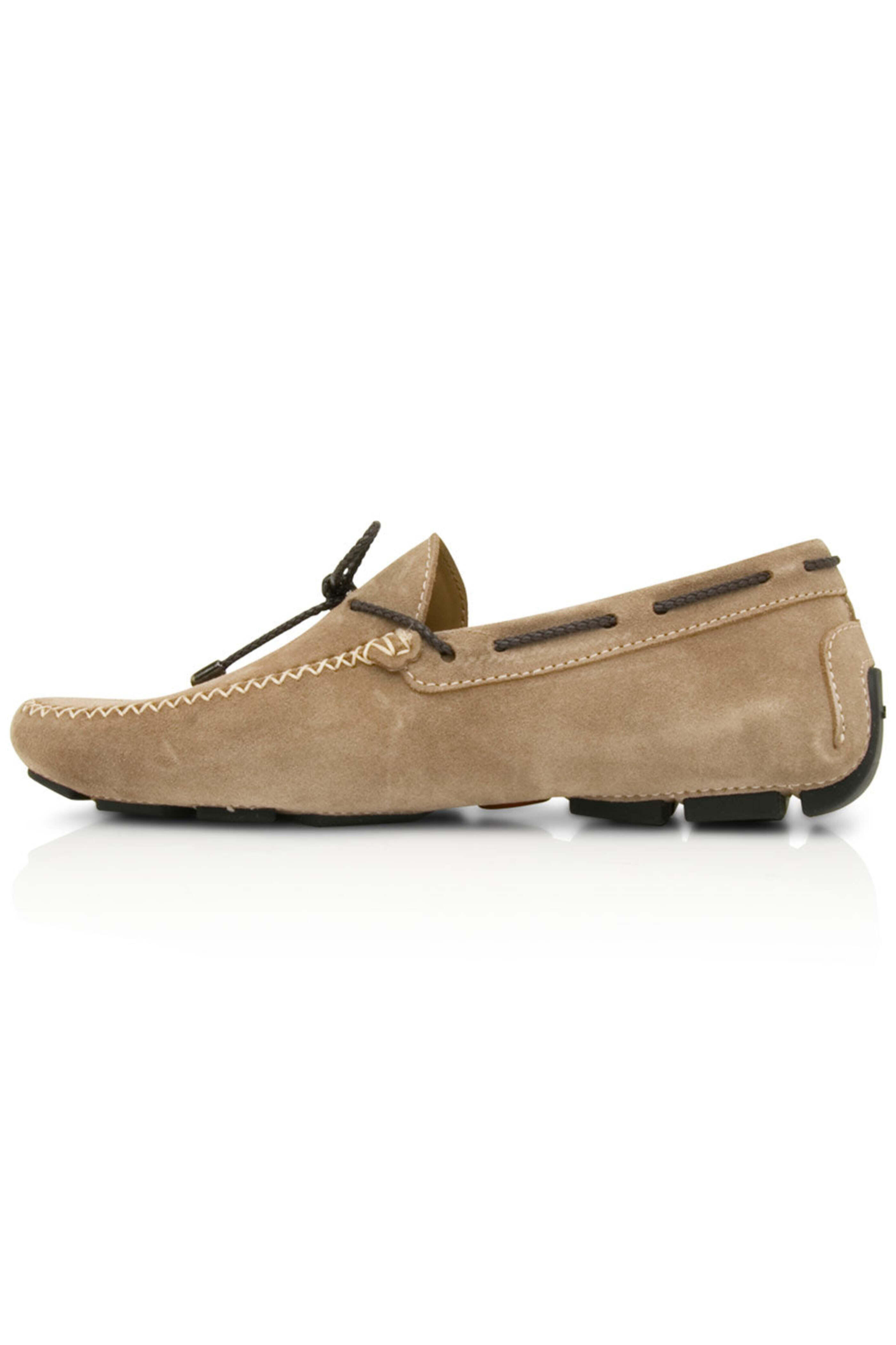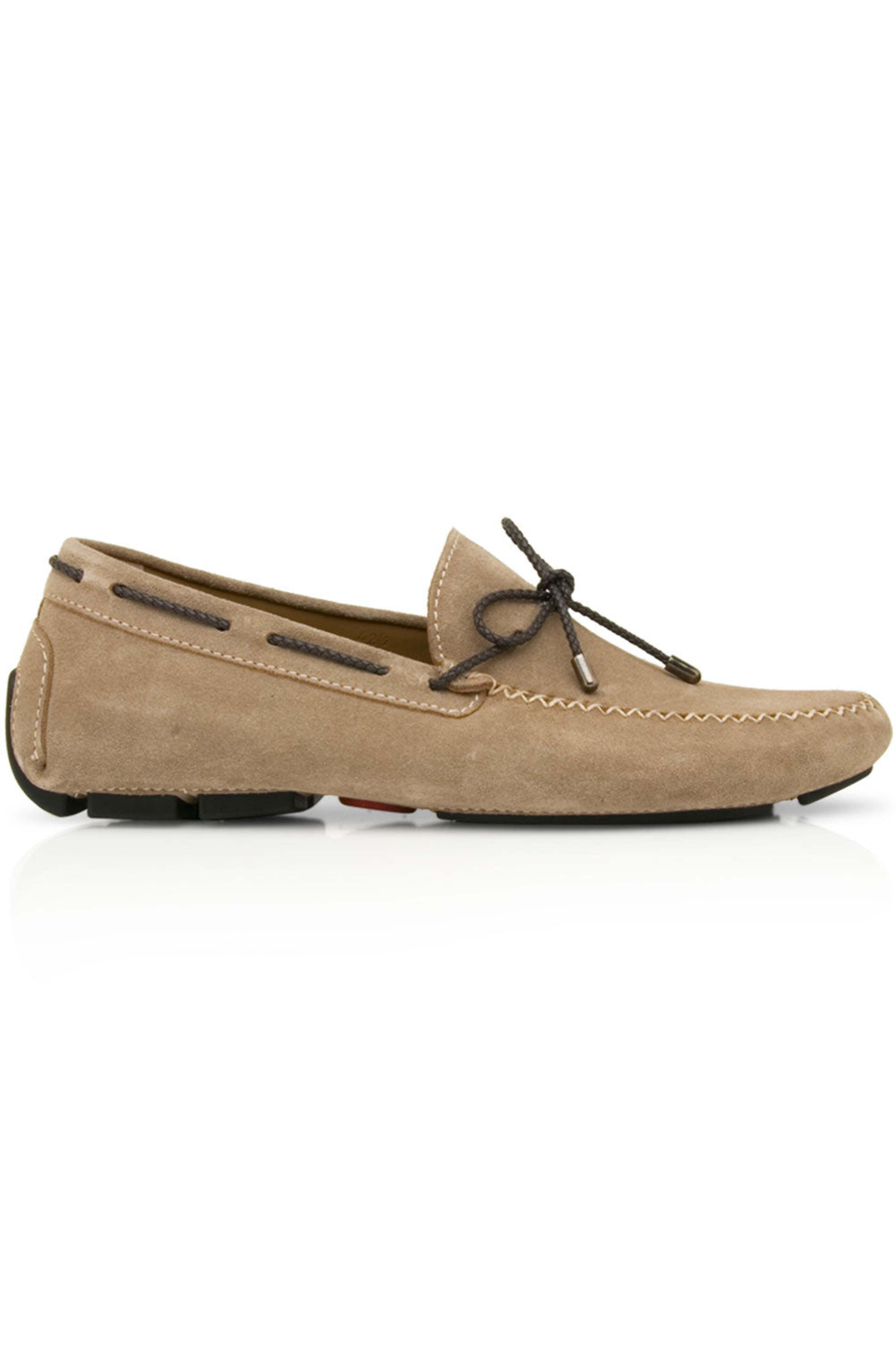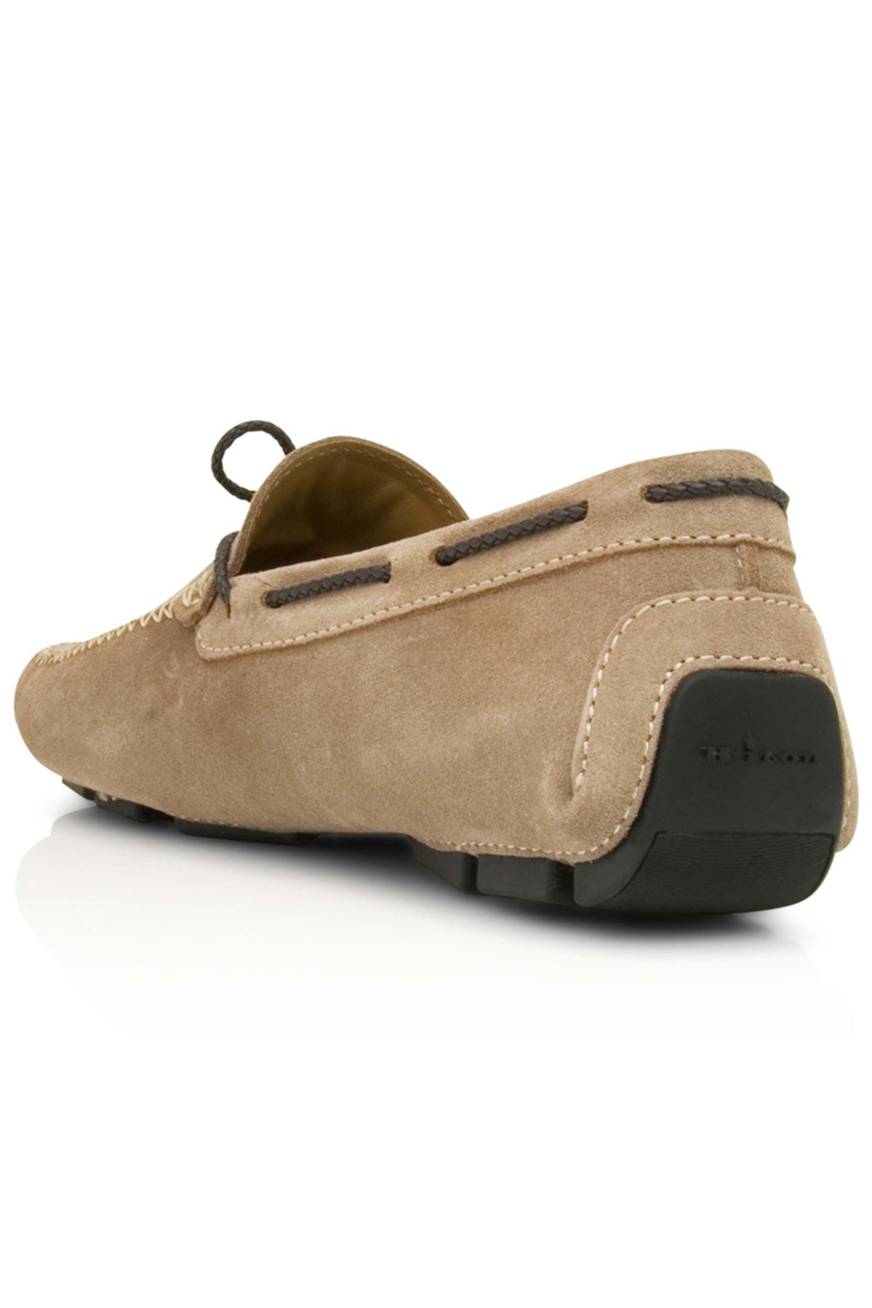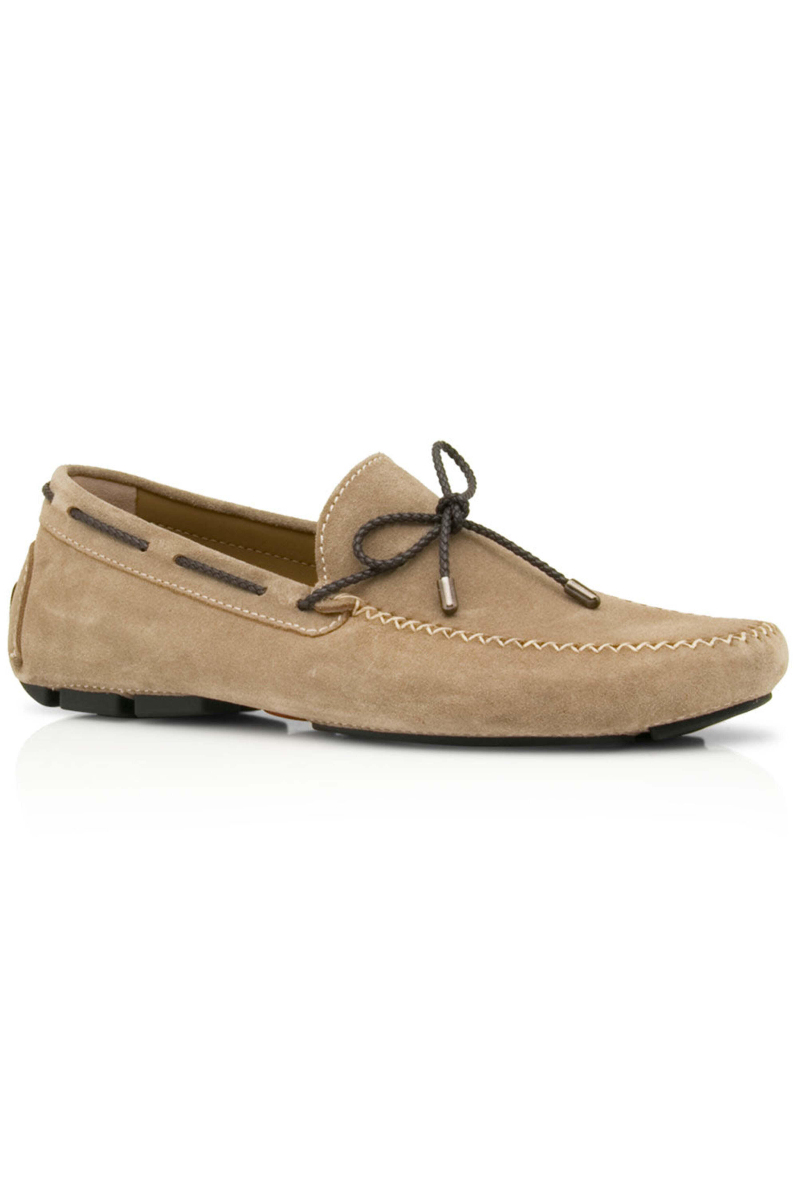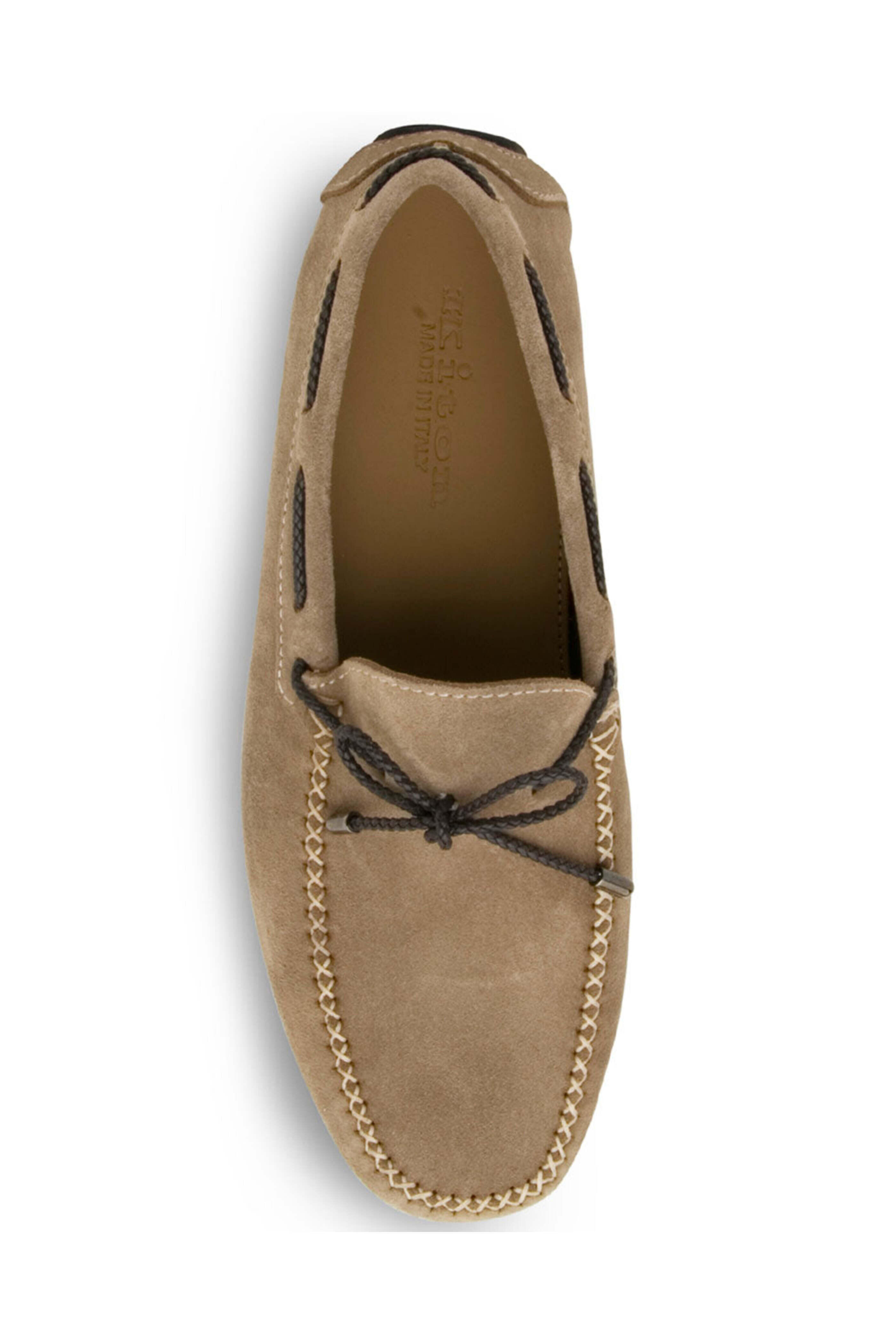 Kiton Lace Up Driver in Light Sand. Round reinforced toe. Slightly notched vamp. Braided leather lace up closure. Slip on. Contrast stitching. Branded rubber heel counter. Suede upper. Leather lining. Suede and rubber sole. Made in Italy.