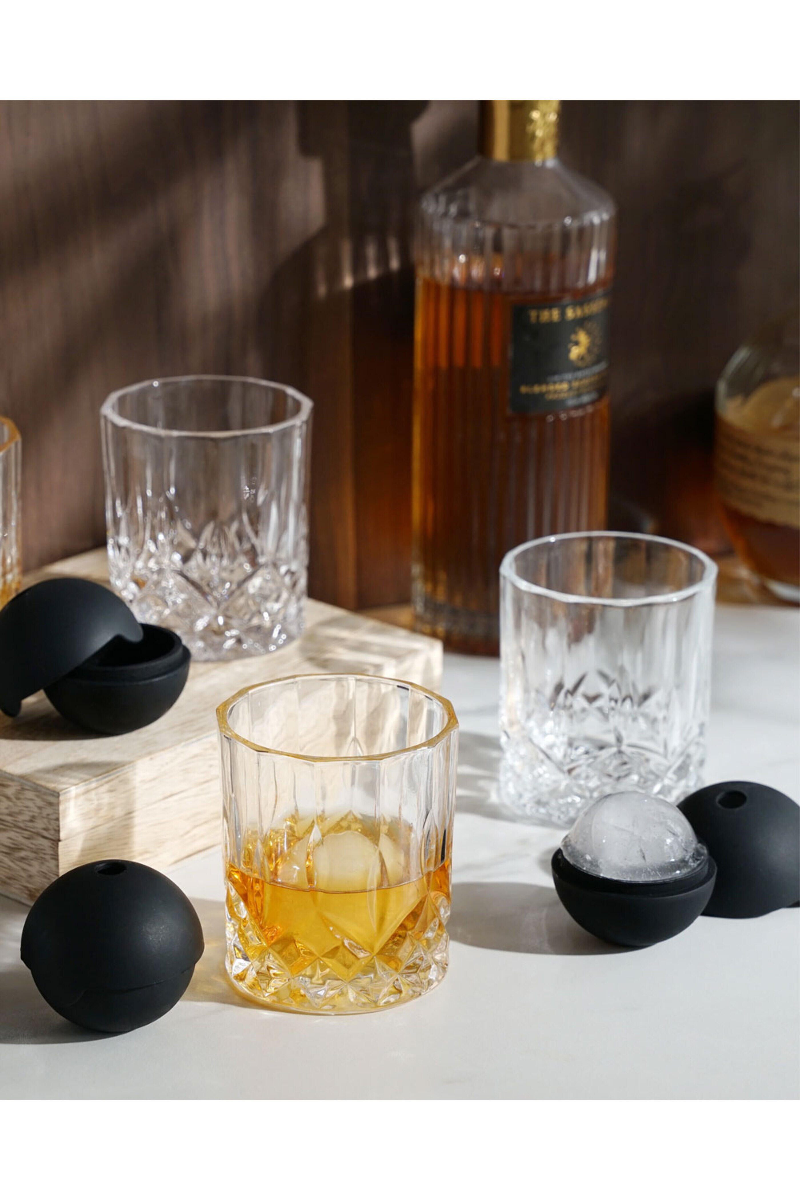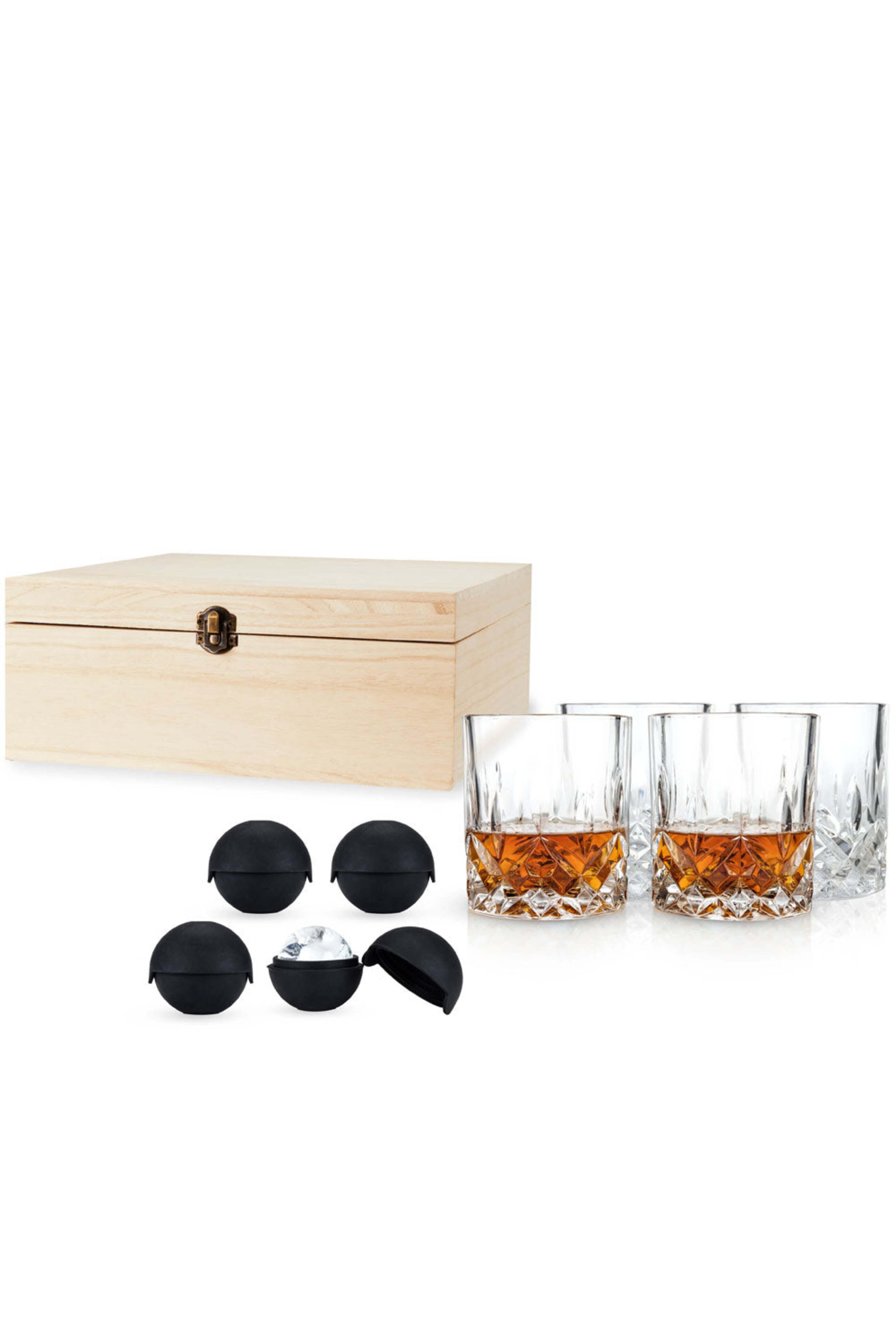 Viski Liquor Glass and Ice Sphere Box Set. Four tumblers. Four ice sphere molds. Lead-free crystal, silicone. Packaged in a wooden gift box. 9 oz.. Dishwasher safe.