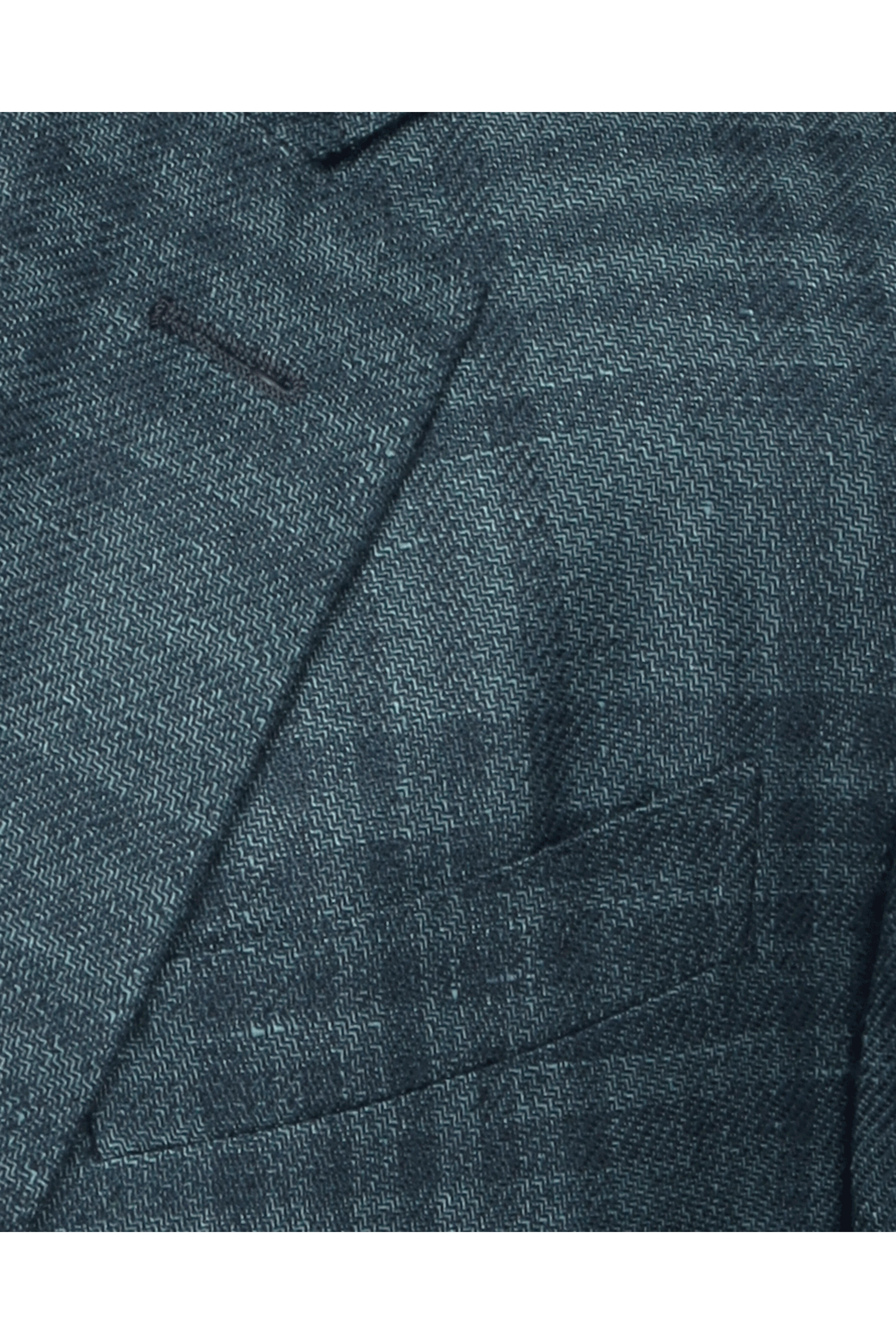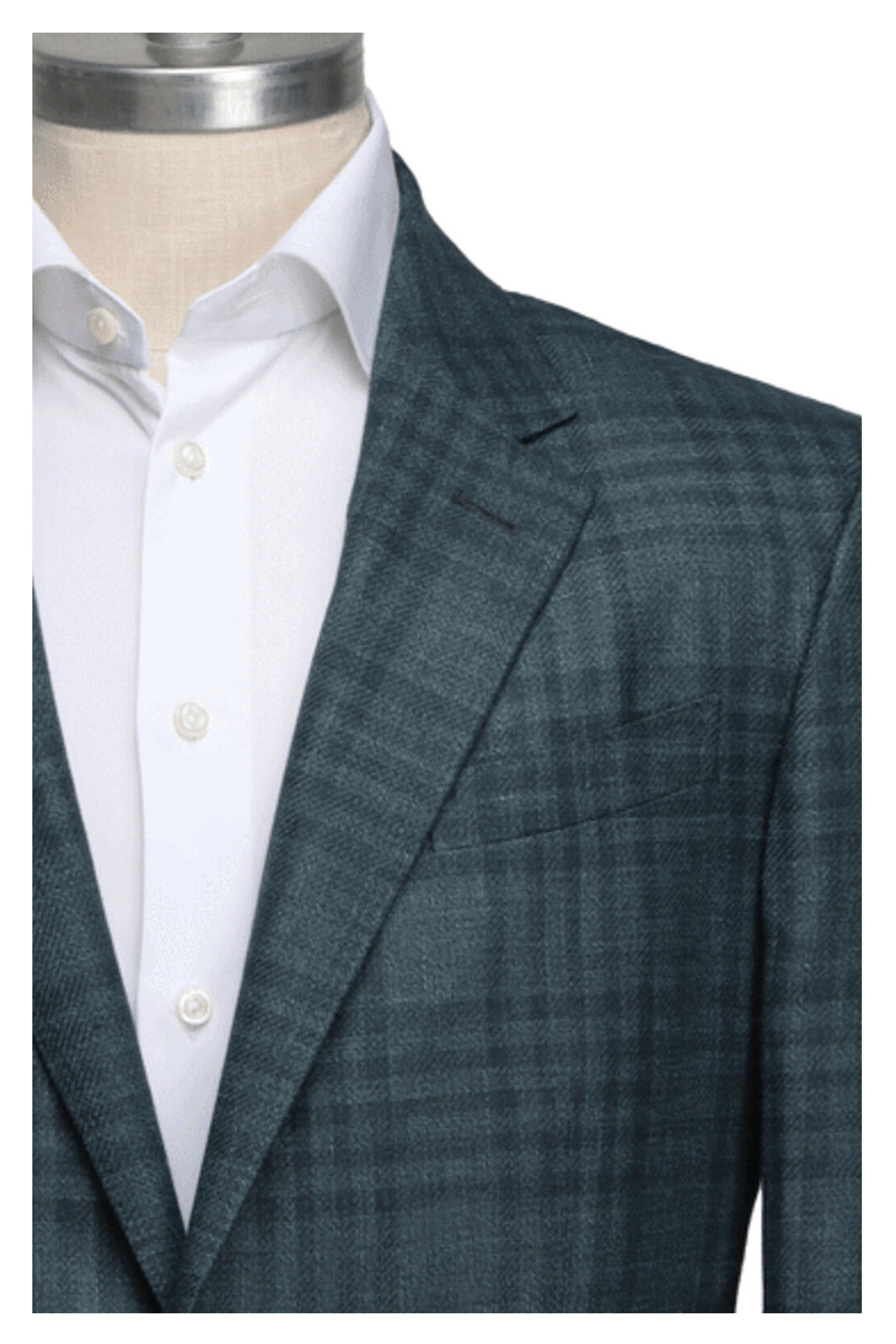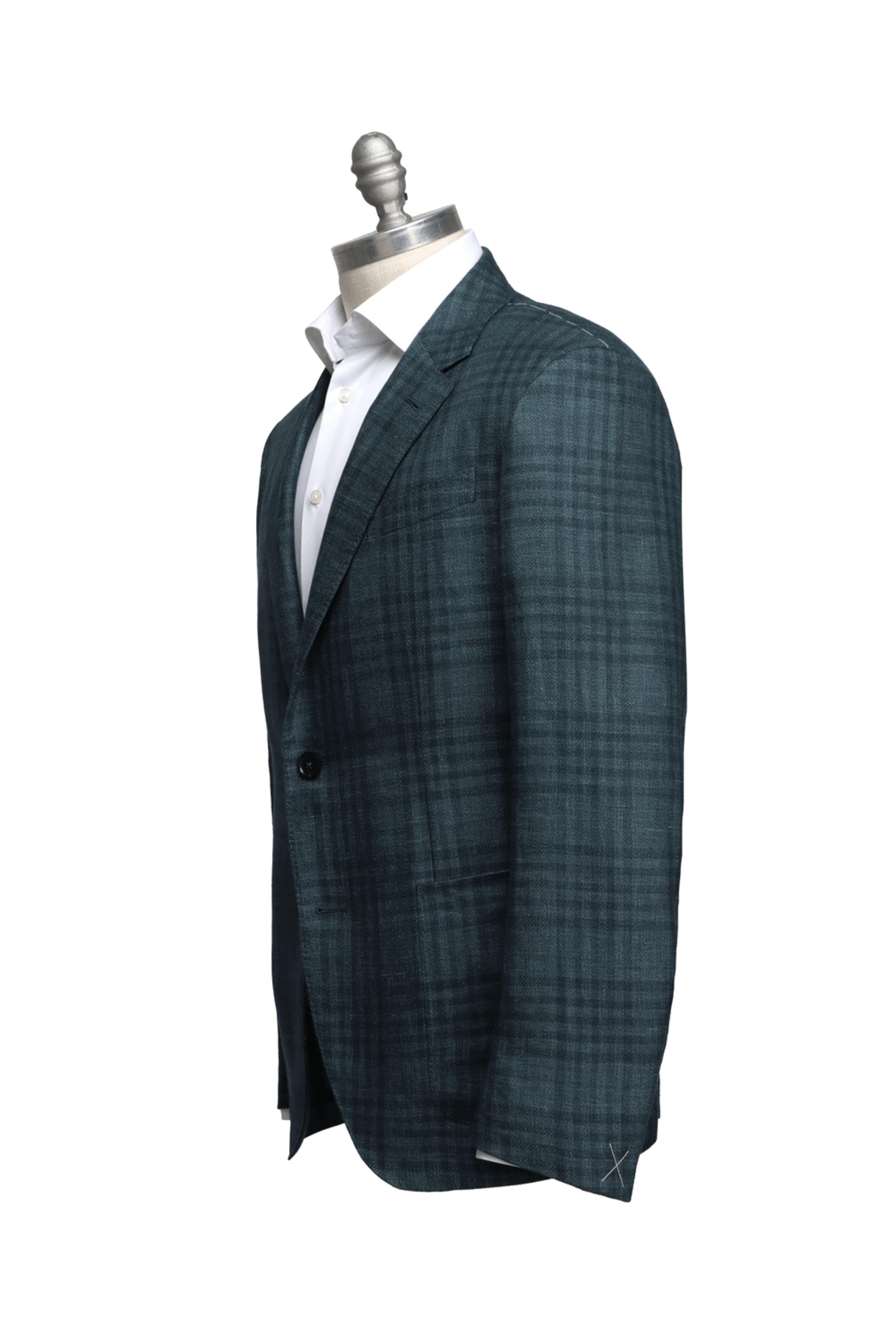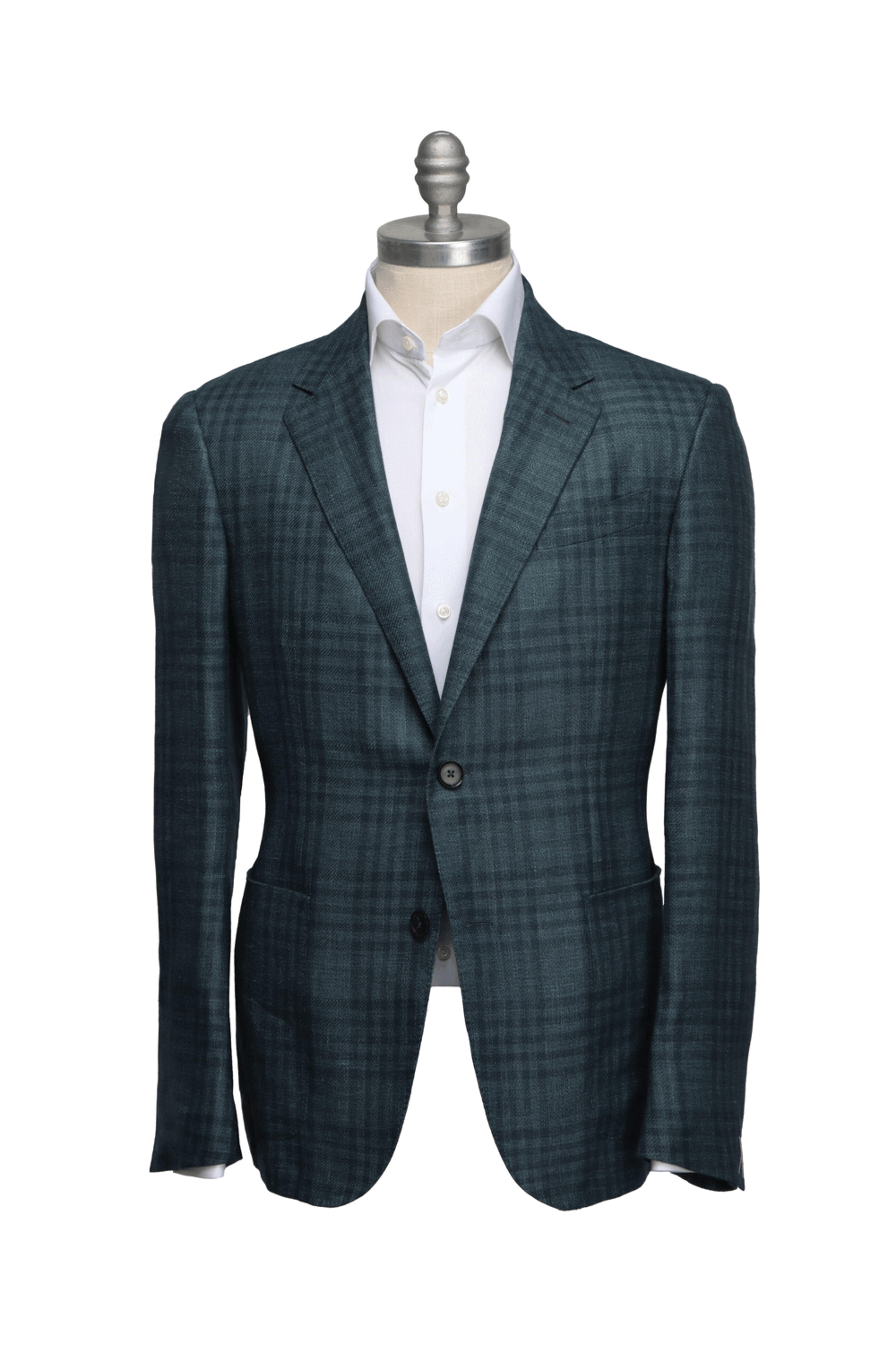 Zegna Dark Teal Overcheck Sportcoat. Notch lapels. Left lapel buttonhole. Left chest welt pocket. Button front closure. Waist patch pockets . Interior pockets. Unfinished buttonholes. Double back vents. Drop 7. Quarter-lined. Made in Italy . 50% cashmere, 47% silk, 3% linen. 100% cupro lining.