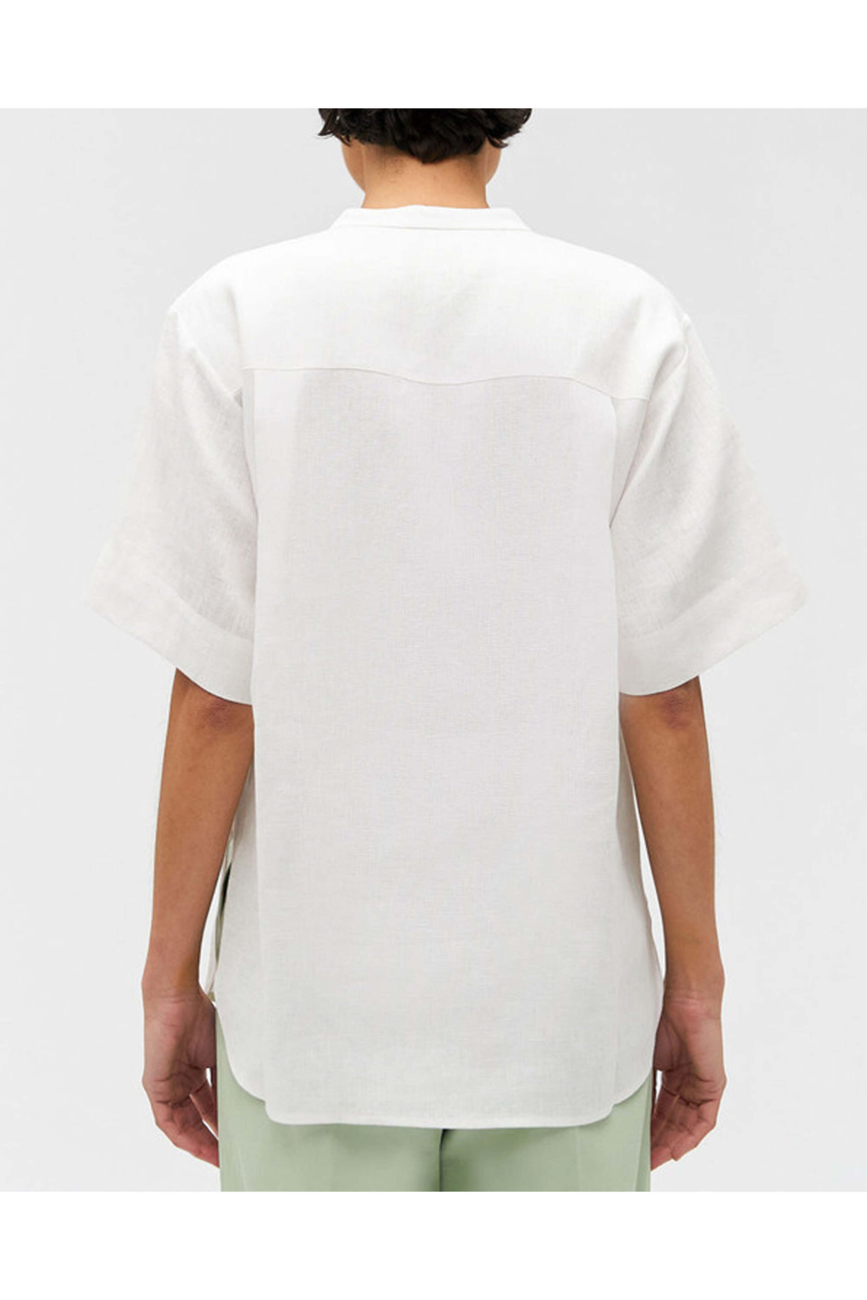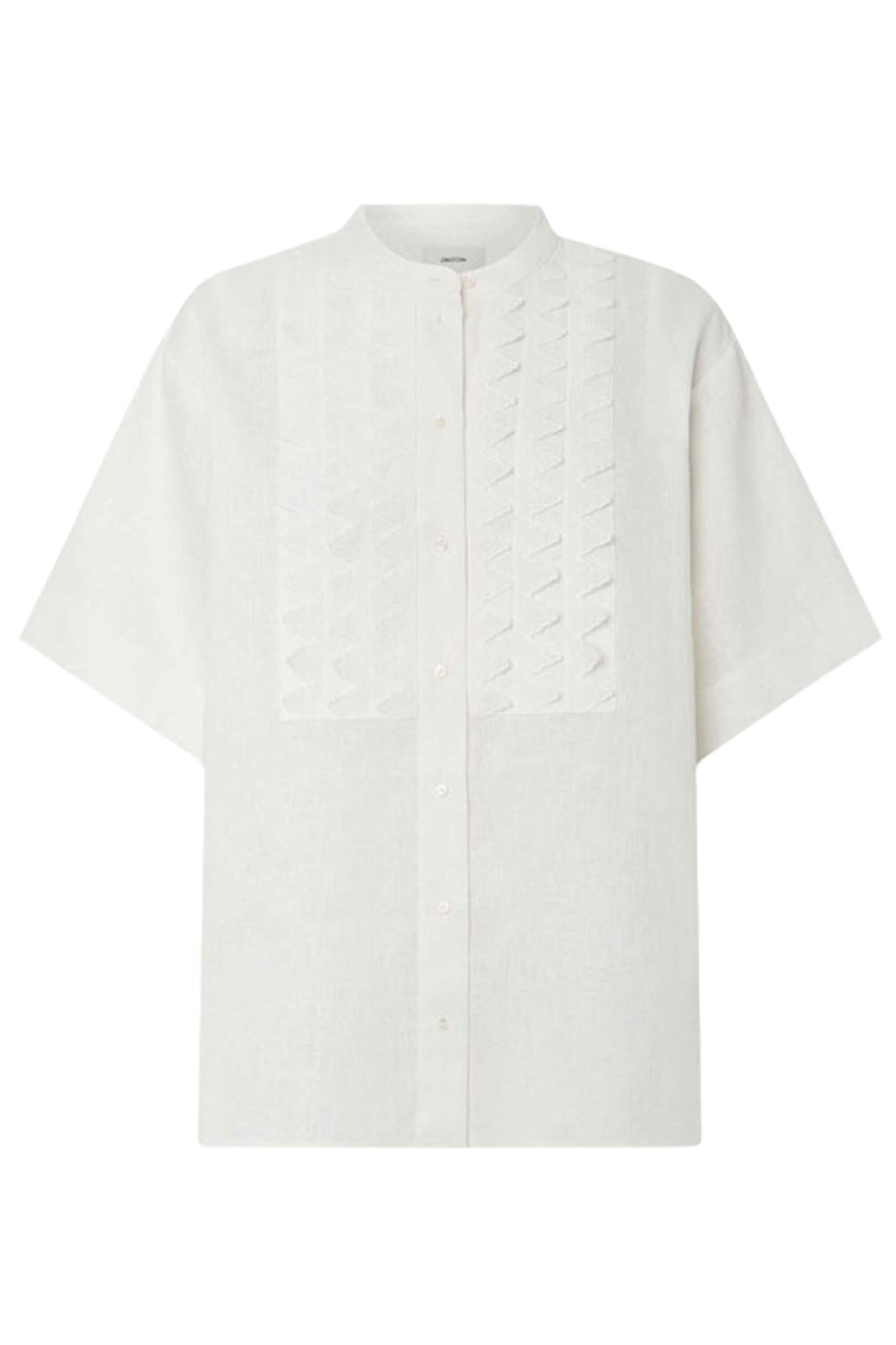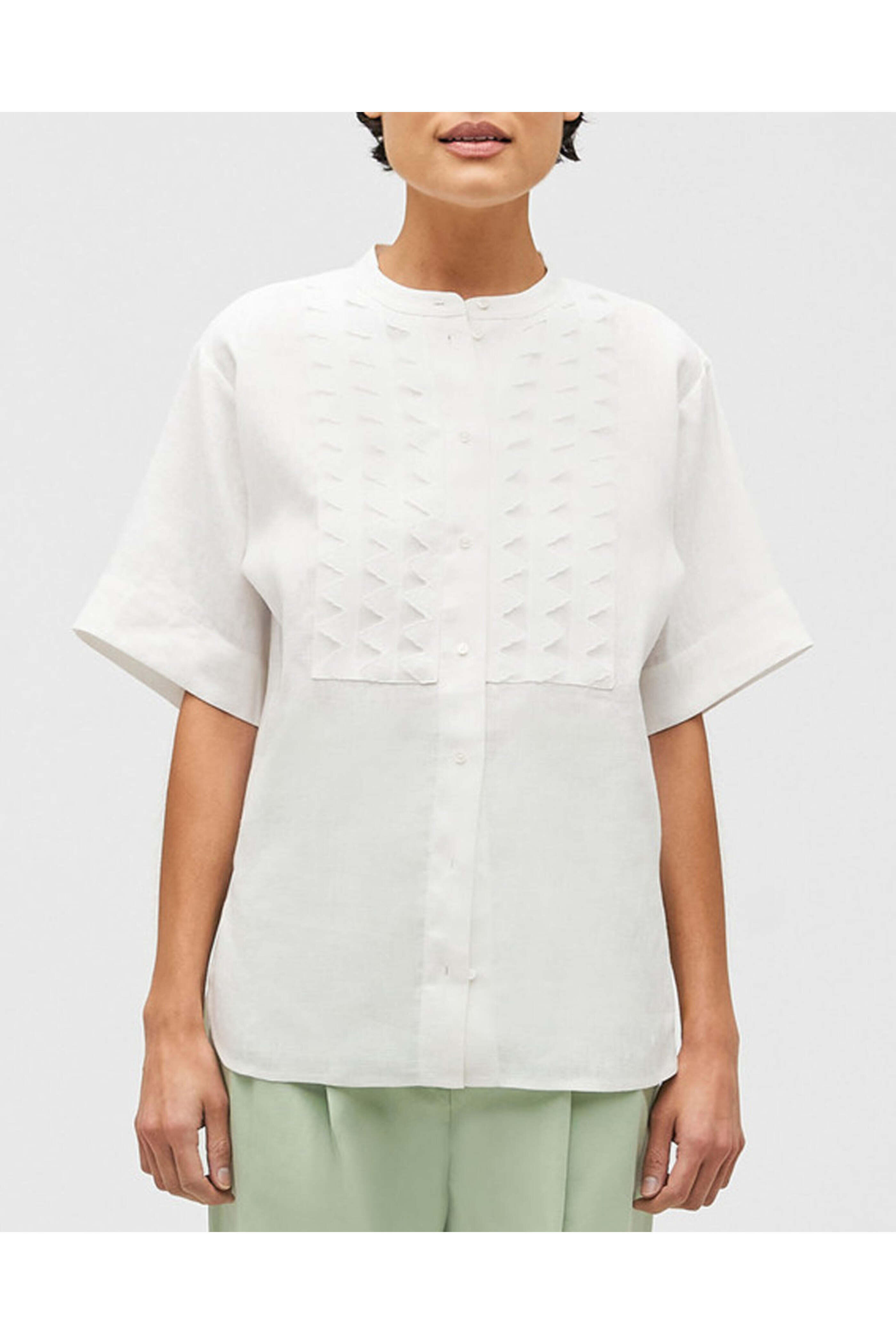 Oroton White Smocked Blouse. Bnaded collar. Elbow length wide sleeves. Button down front closure. Smock front detail. Relaxed fit. Rounded hem. 100% linen.