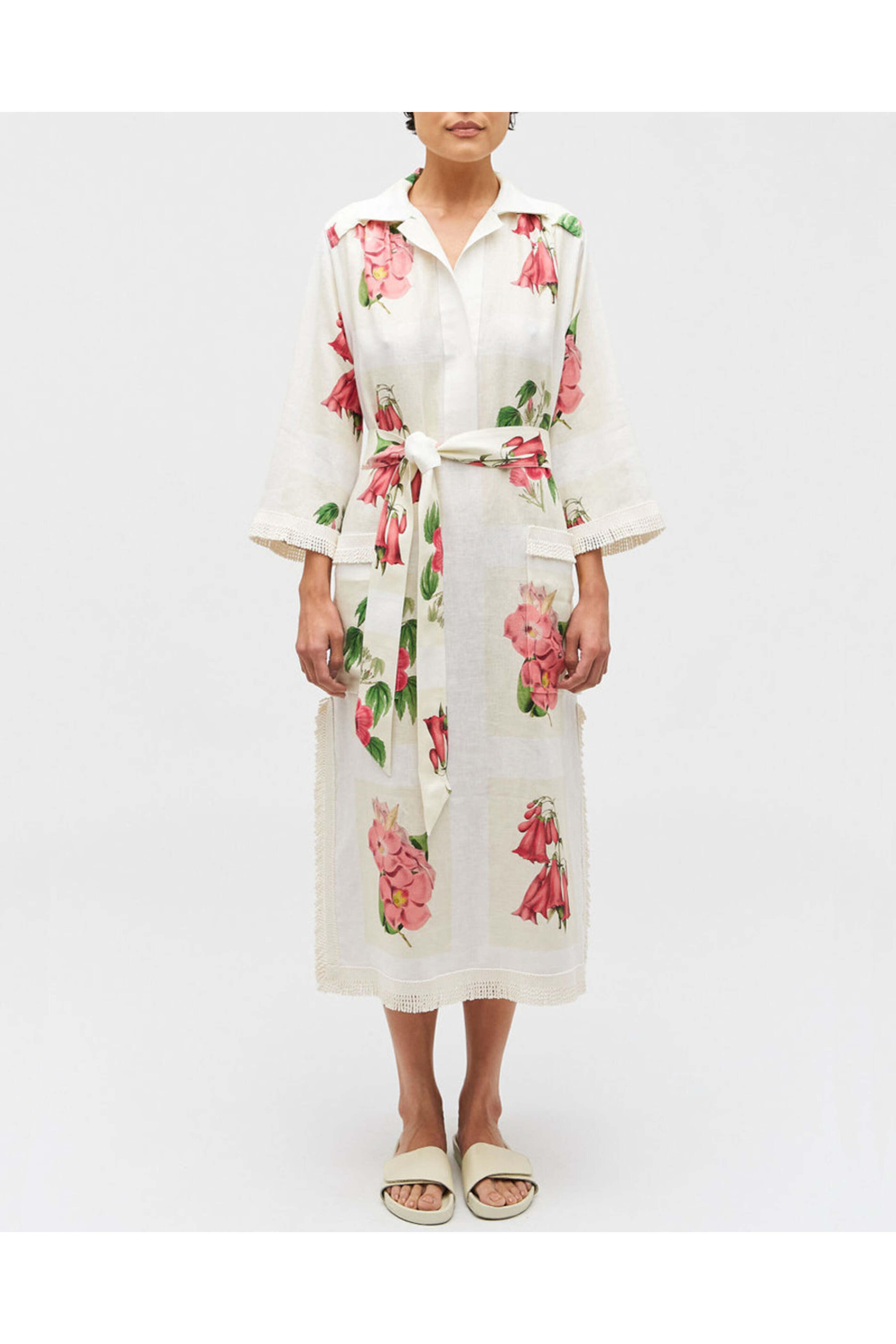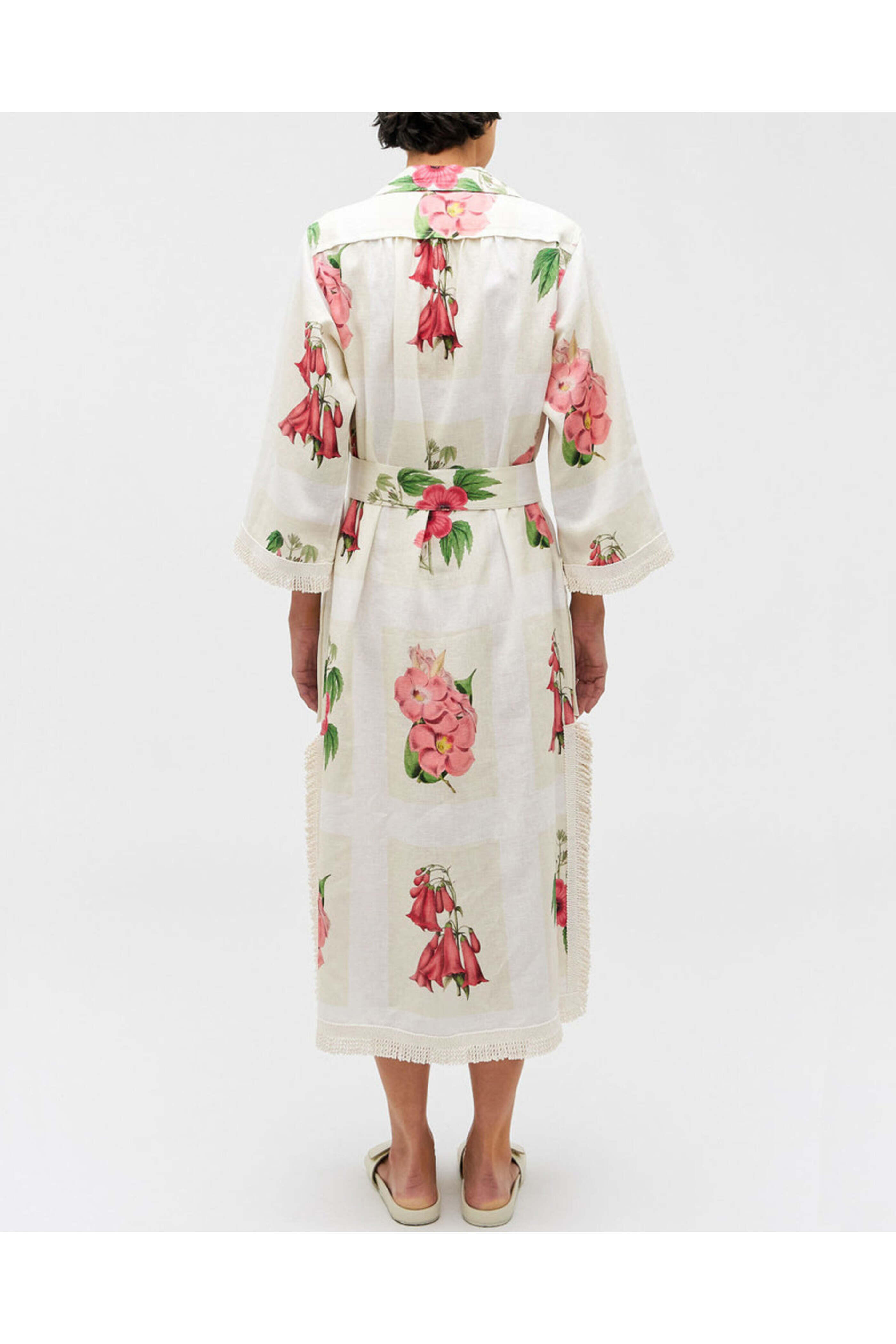Oroton Multicolor Floral Verandah Long Tunic. Collar. ¾ length sleeves. Open quarter placket. Oversized fit. Removable self-tie belt; self-fabrication. Front patch pockets. Midi length. Side hem slits. Fringe trim detail. 100% linen.