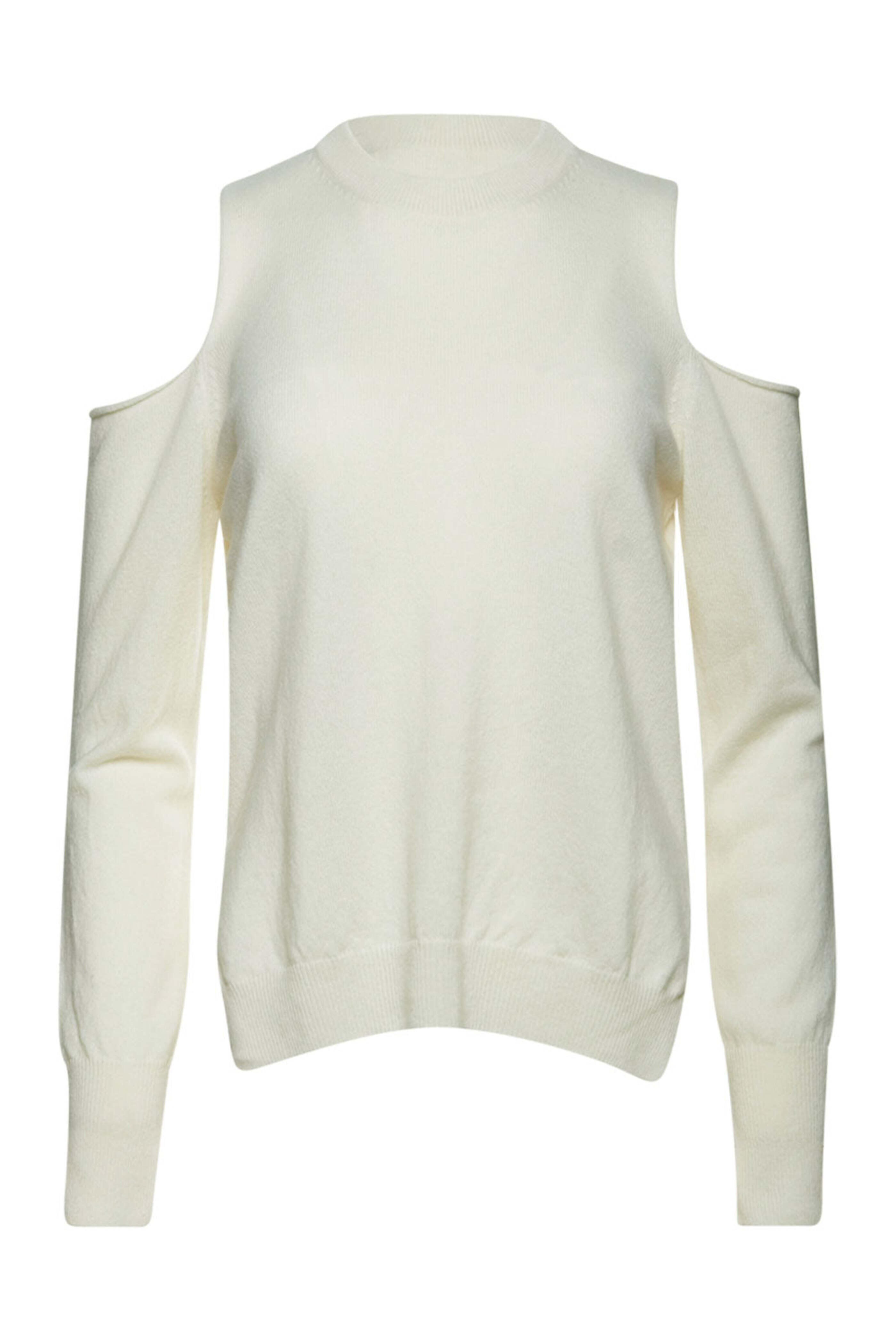 (Nude) Off White Crew Neck Cold Shoulder Sweater. Crew neck. Cold shoulders. Long sleeves. Ribbed collar, cuffs, and hem. Relaxed fit. Side hem slits. 50% wool, 50% cashmere.