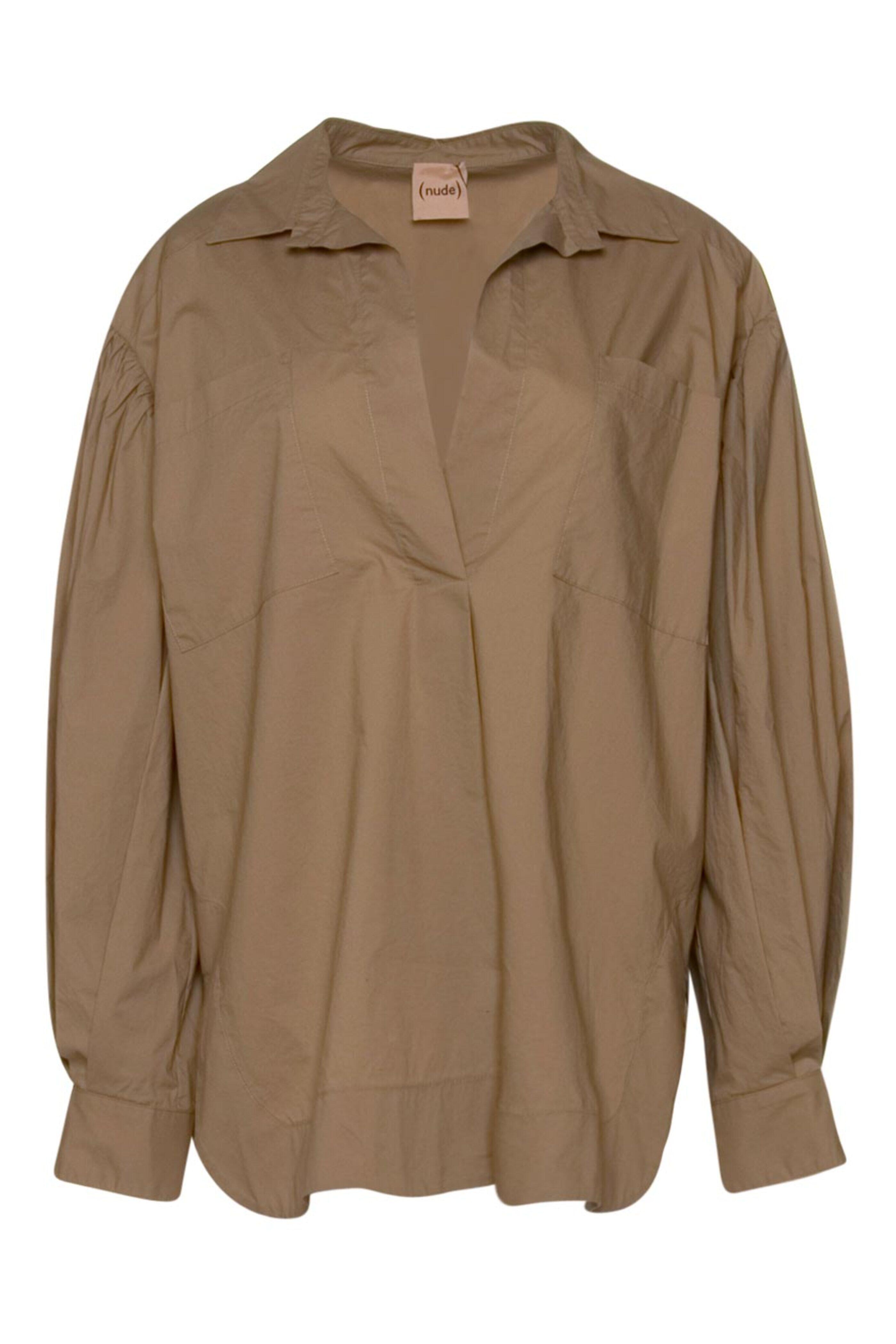 (Nude) Filbert Long Sleeve Collared Blouse Collared Split v neck Gathered shoulders Long sleeves; button cuffs Patch pockets at chest Relaxed fit Side hem vents Unlined 100% cotton.
