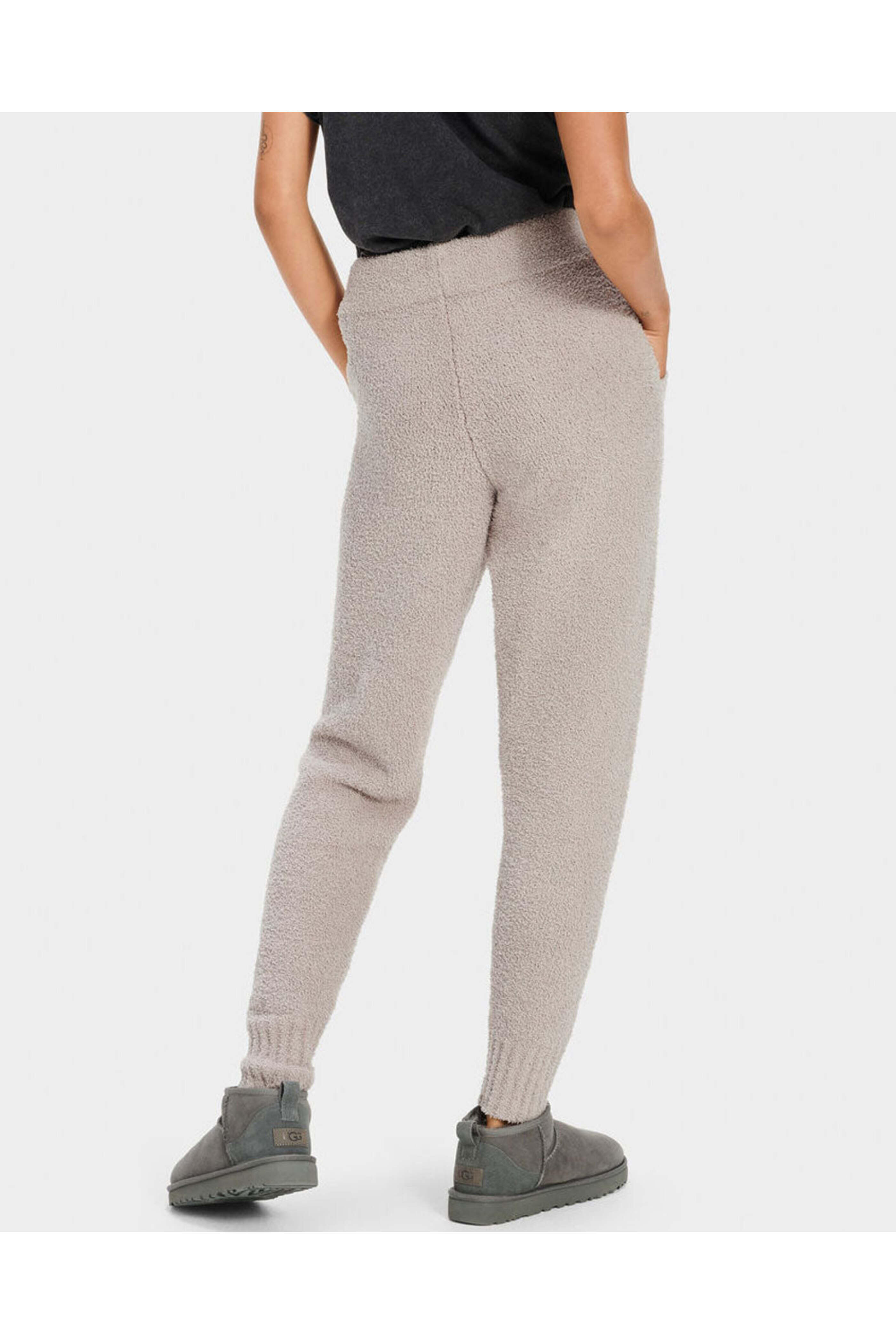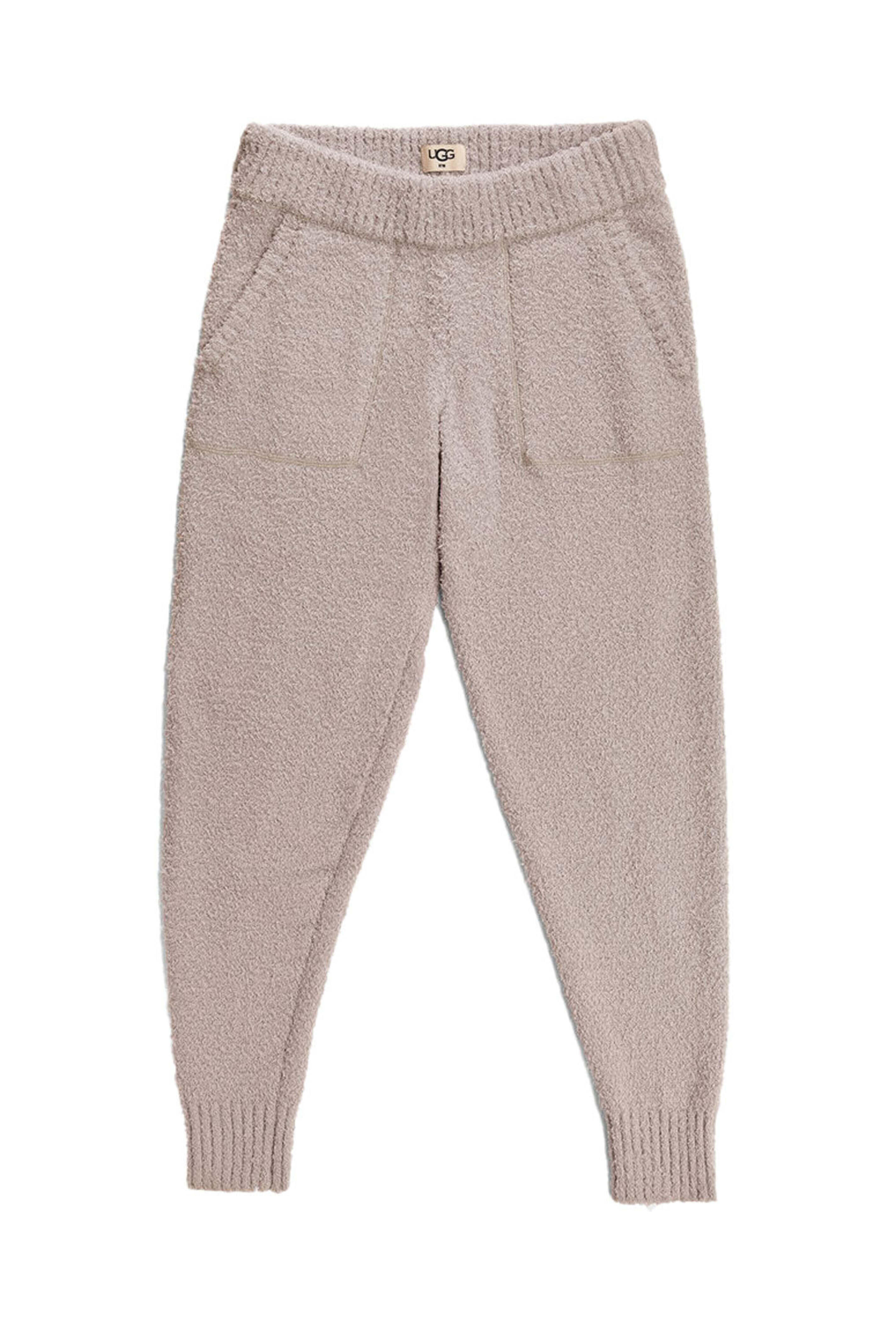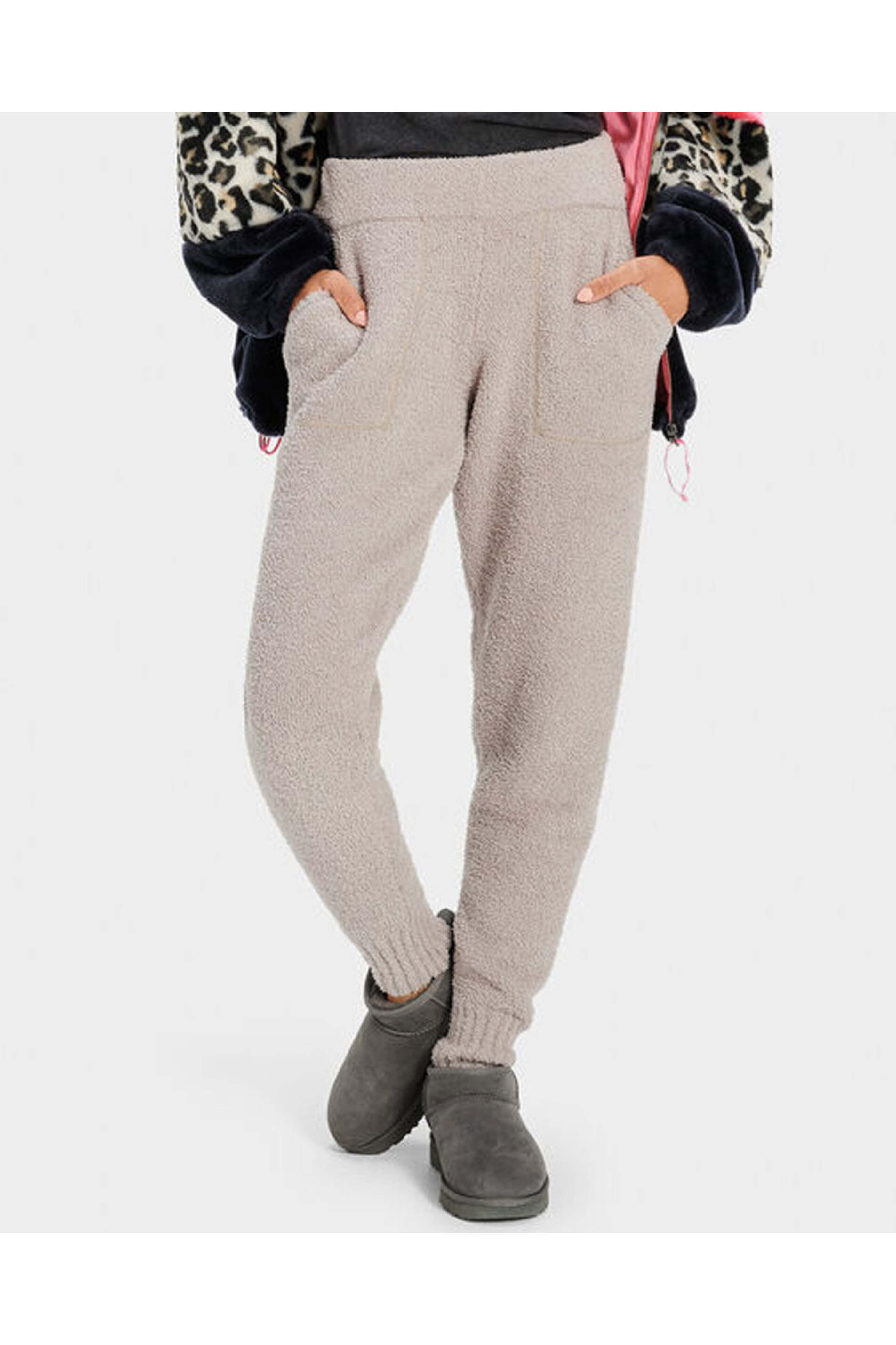UGG Safiya Jogger in Granite. Elastic waistband. Front slip pockets. Full length; ribbed cuffs. Jogger style. Relaxed fit. 70% Recycled polyester, 30% Polyester.