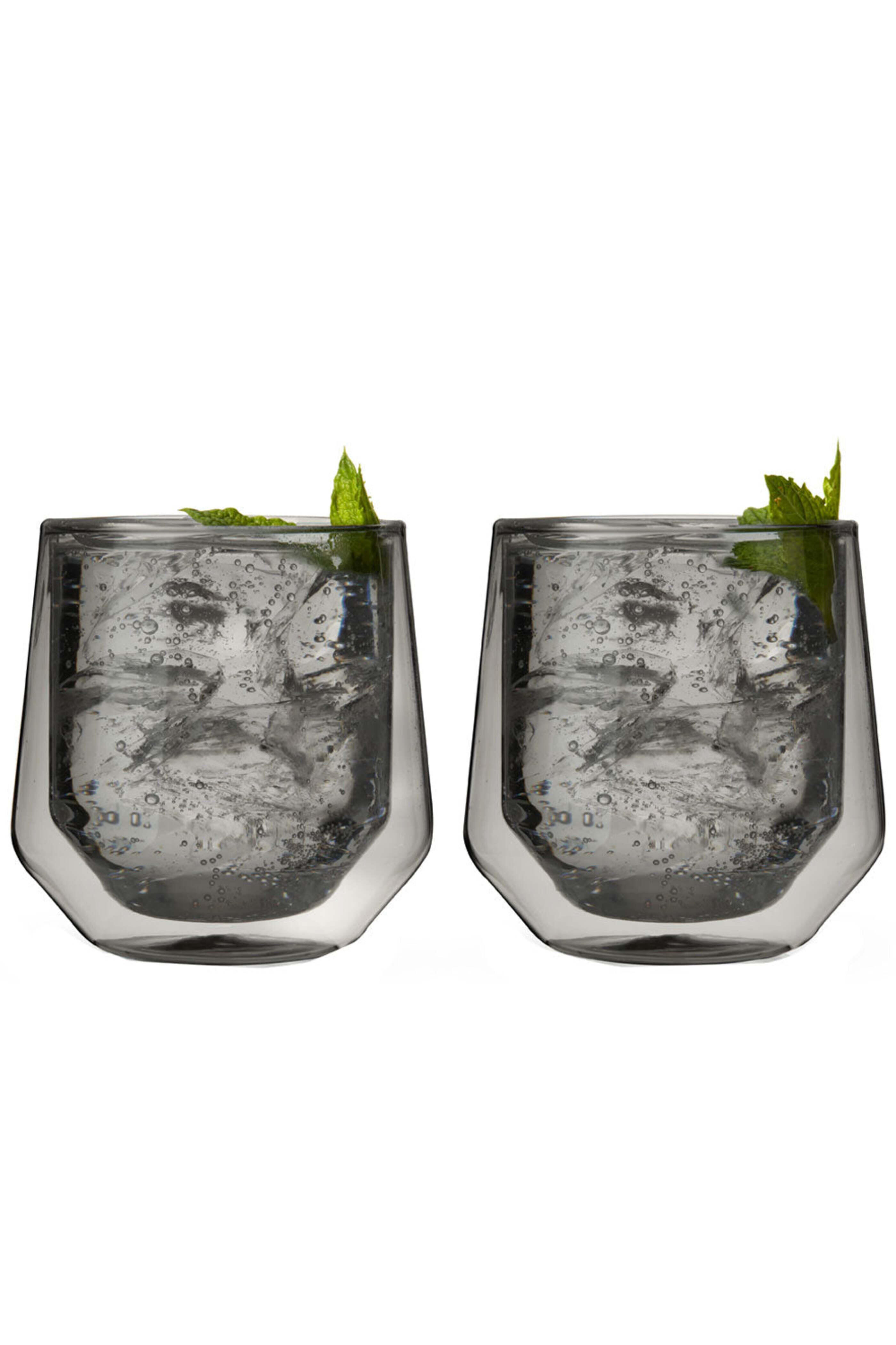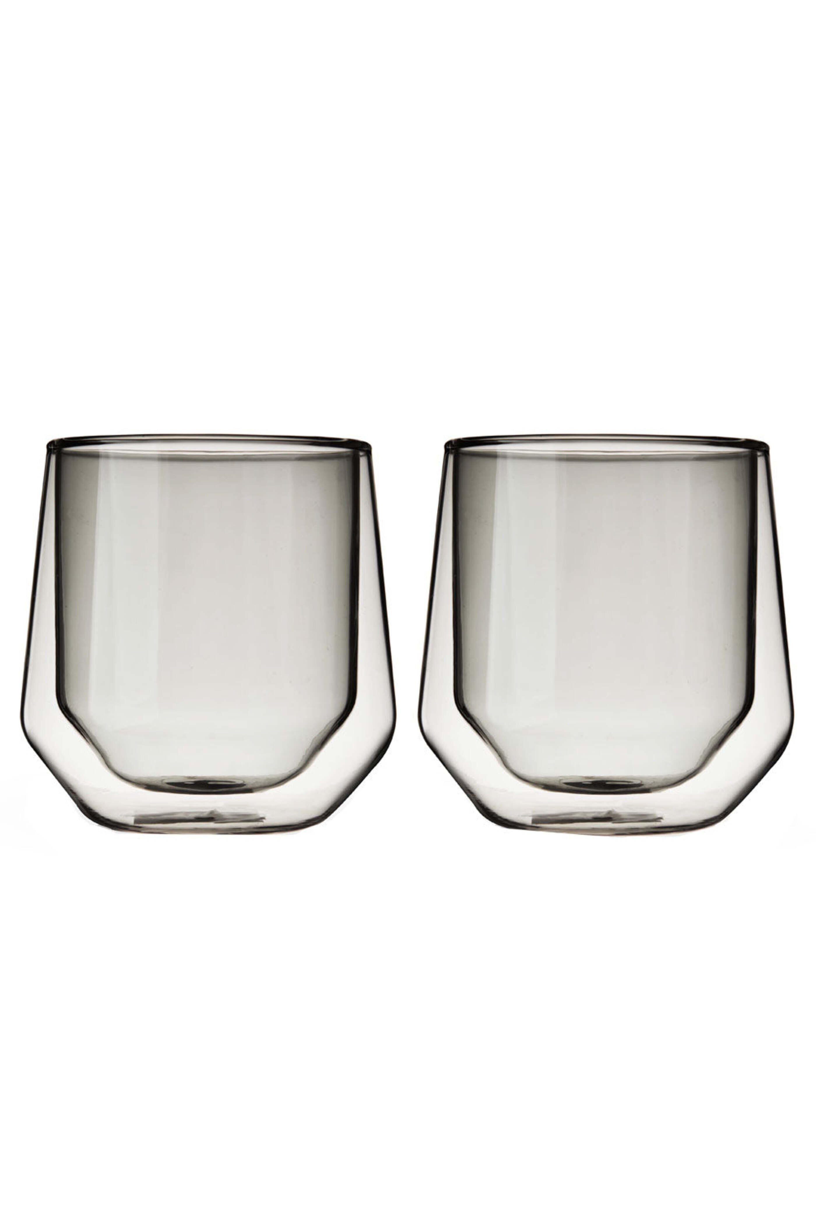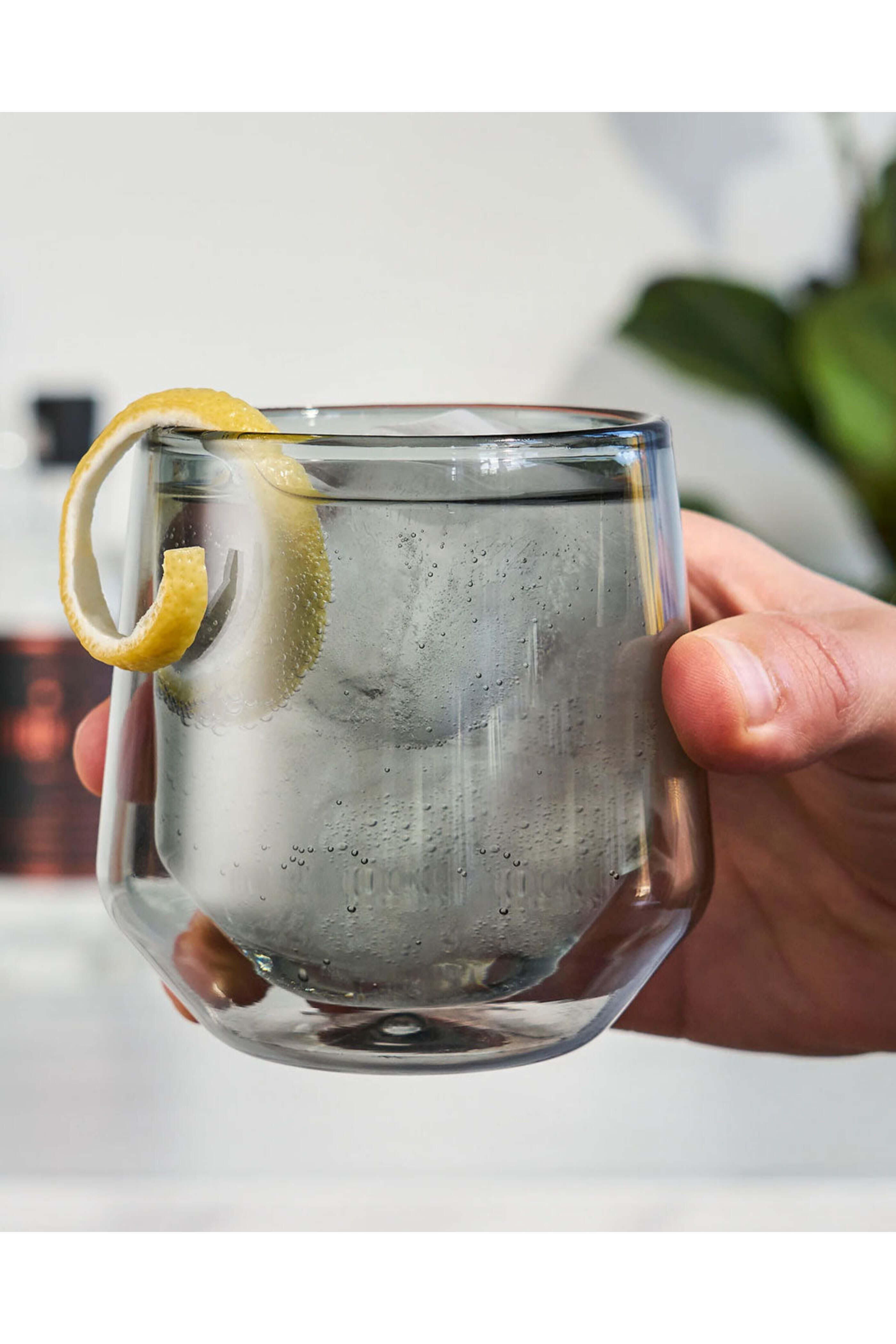 Handcrafted from durable smoke gray glass. Double-walled lowball tumblers maintains your drinks temperature and brings a pop of color to your glassware collection. Suitable for cocktails, wine, or iced coffee. Borosilicate glass naturally tinted with minerals. 9 oz.. Dishwasher safe.