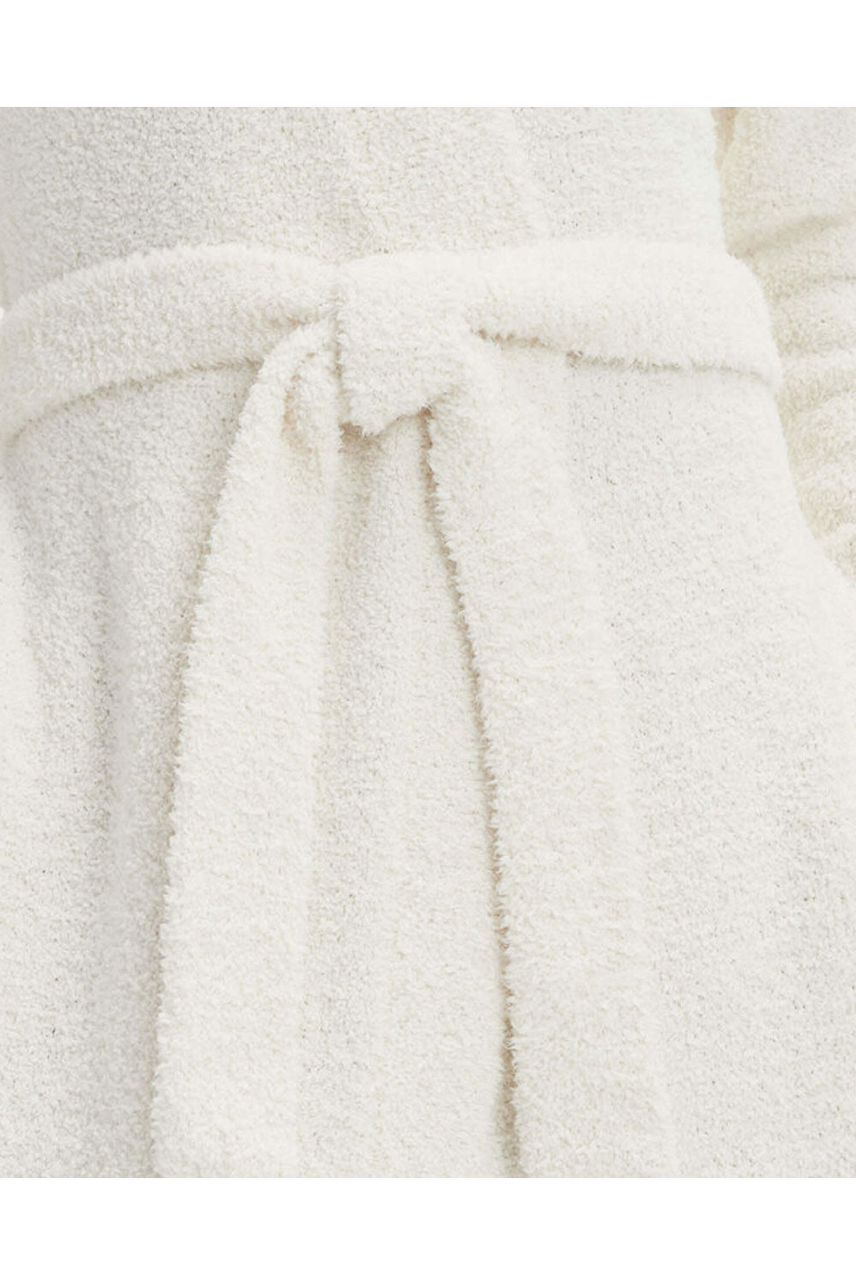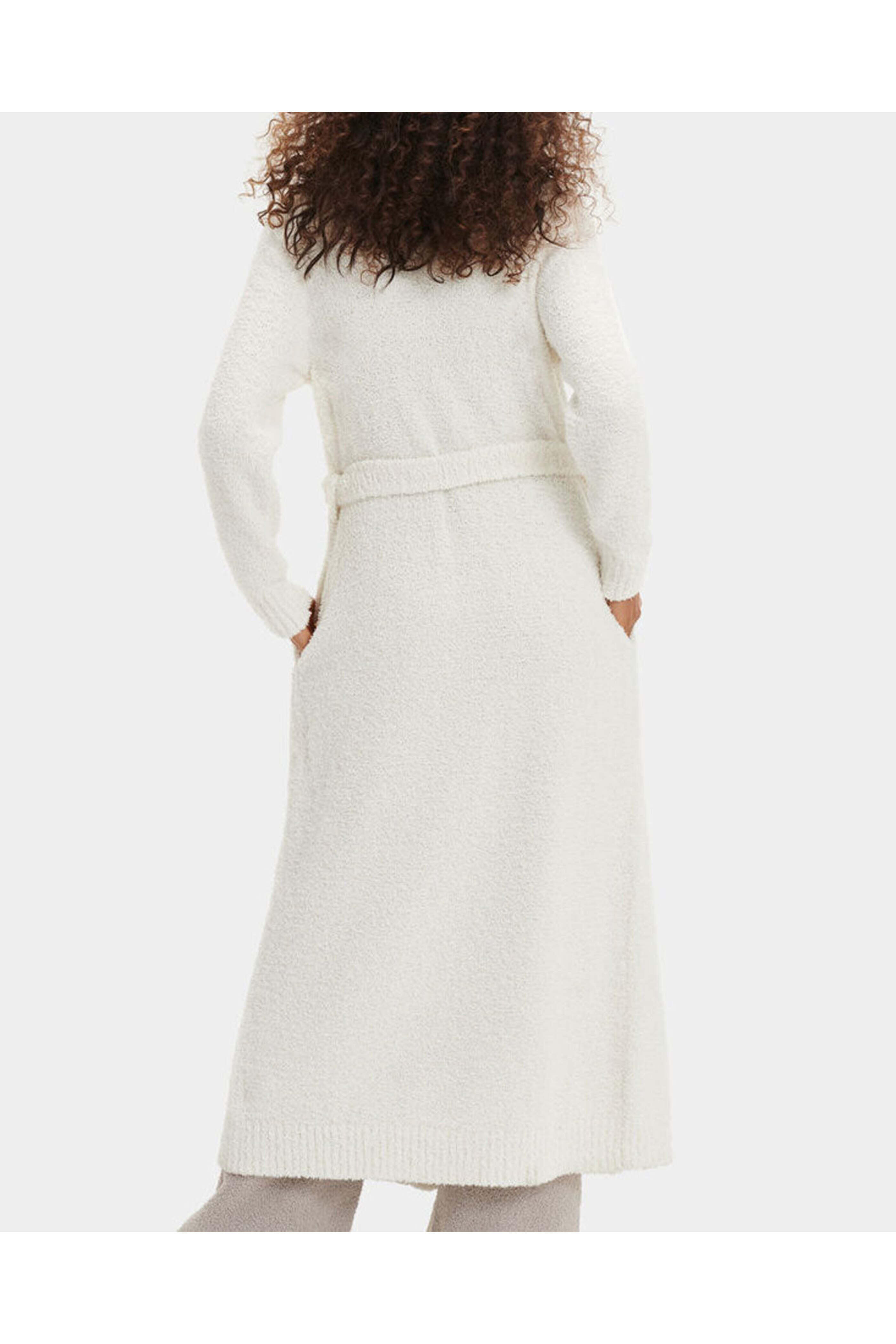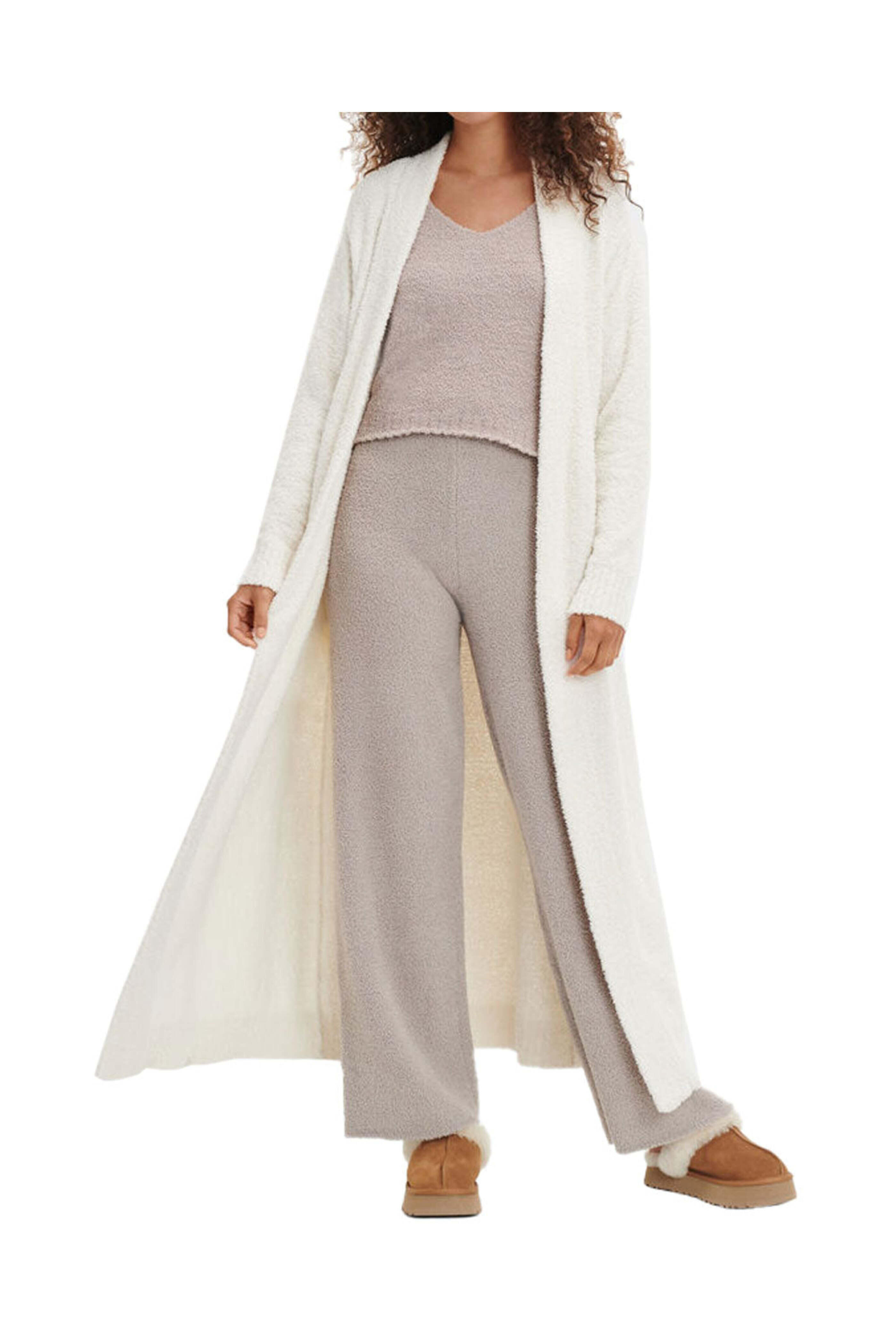 UGG Lenny Robe in Cream. Long sleeves. Front slip pockets. Open front. Removable self-tie belt; self fabrication. Long length. 78% polyester, 22% nylon.