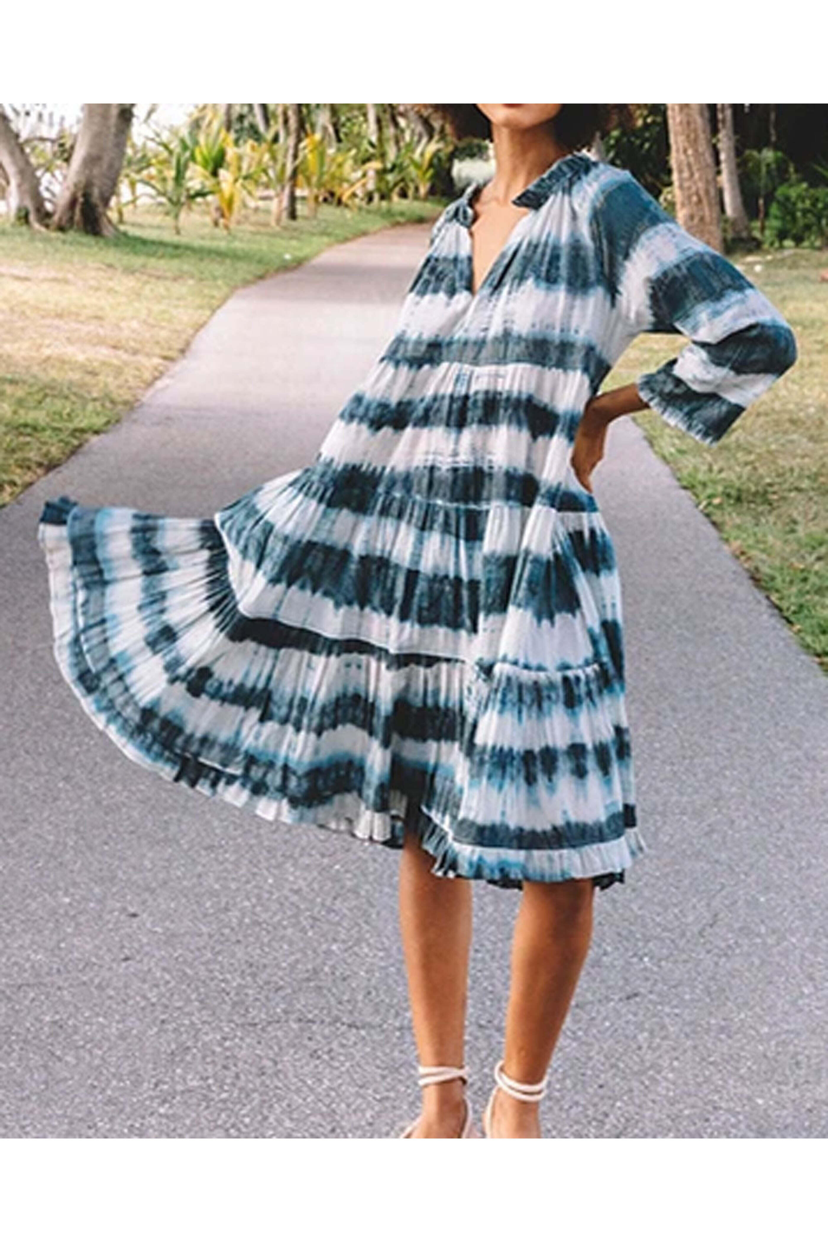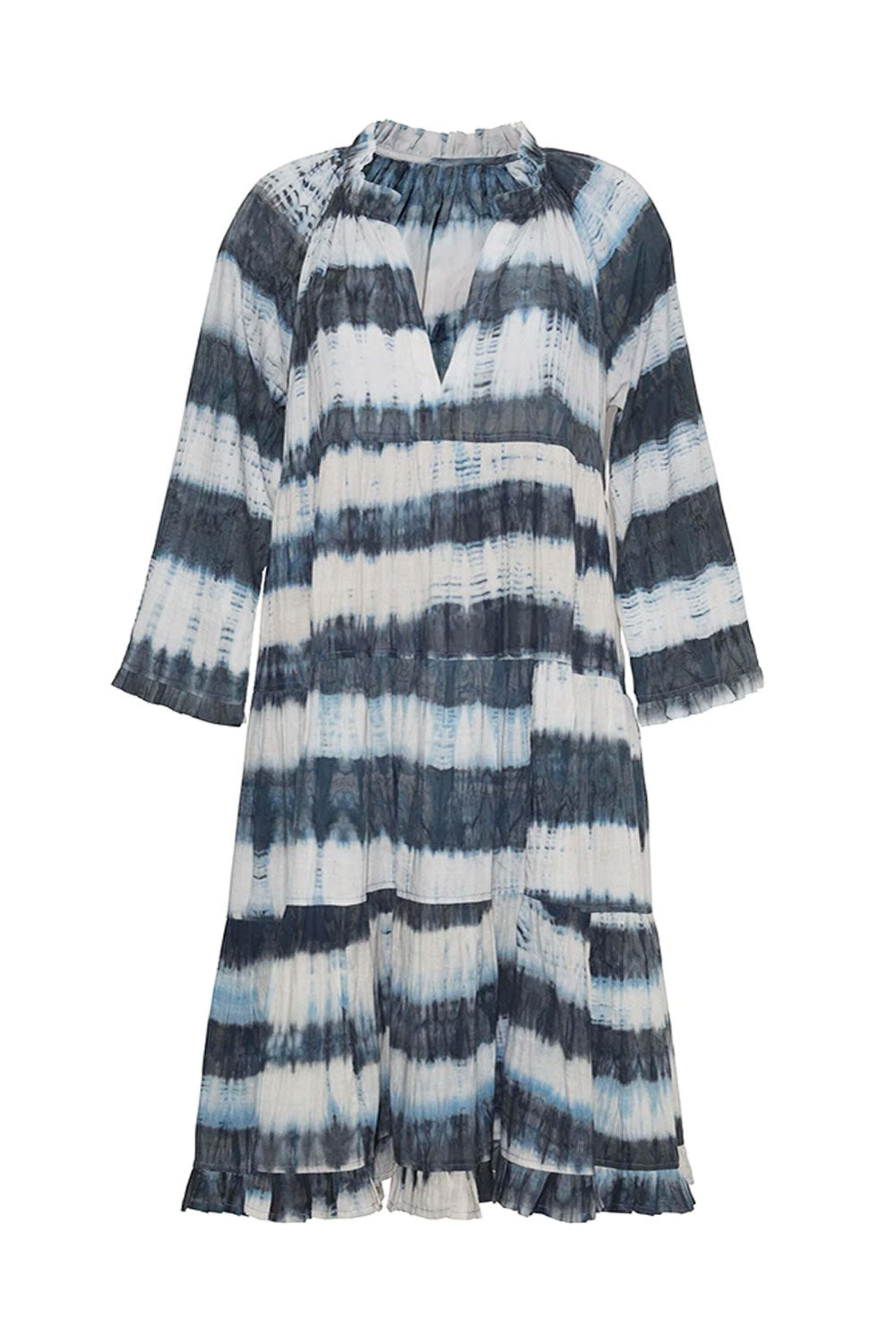 Cara Cara Indigo Tie Dye Gibson Mini Dress. Split v neck. ¾ length raglan sleeves. Relaxed fit. Tiered silhouette. Mini to knee length. Ruffle hem. Lightweight fabrication. 100% cotton voile.