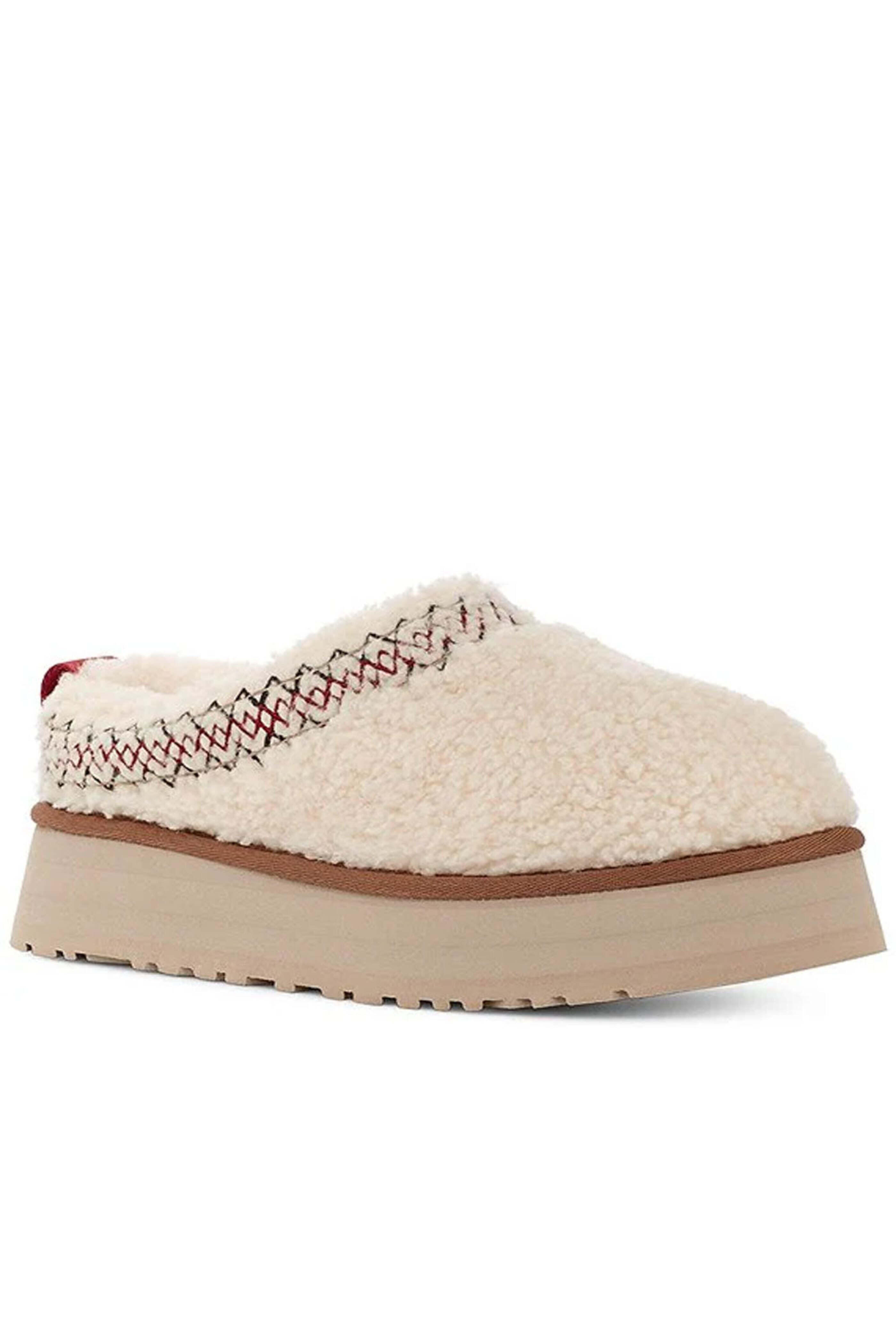 UGG Tazz Braid in Natural. Round toe. Slip on. Pull tab at hel. Braid embroidery. Sheepskin collar. EVA sole. 1.75 platform height. 60% upcycled wool, 40% lyocell sockliner.