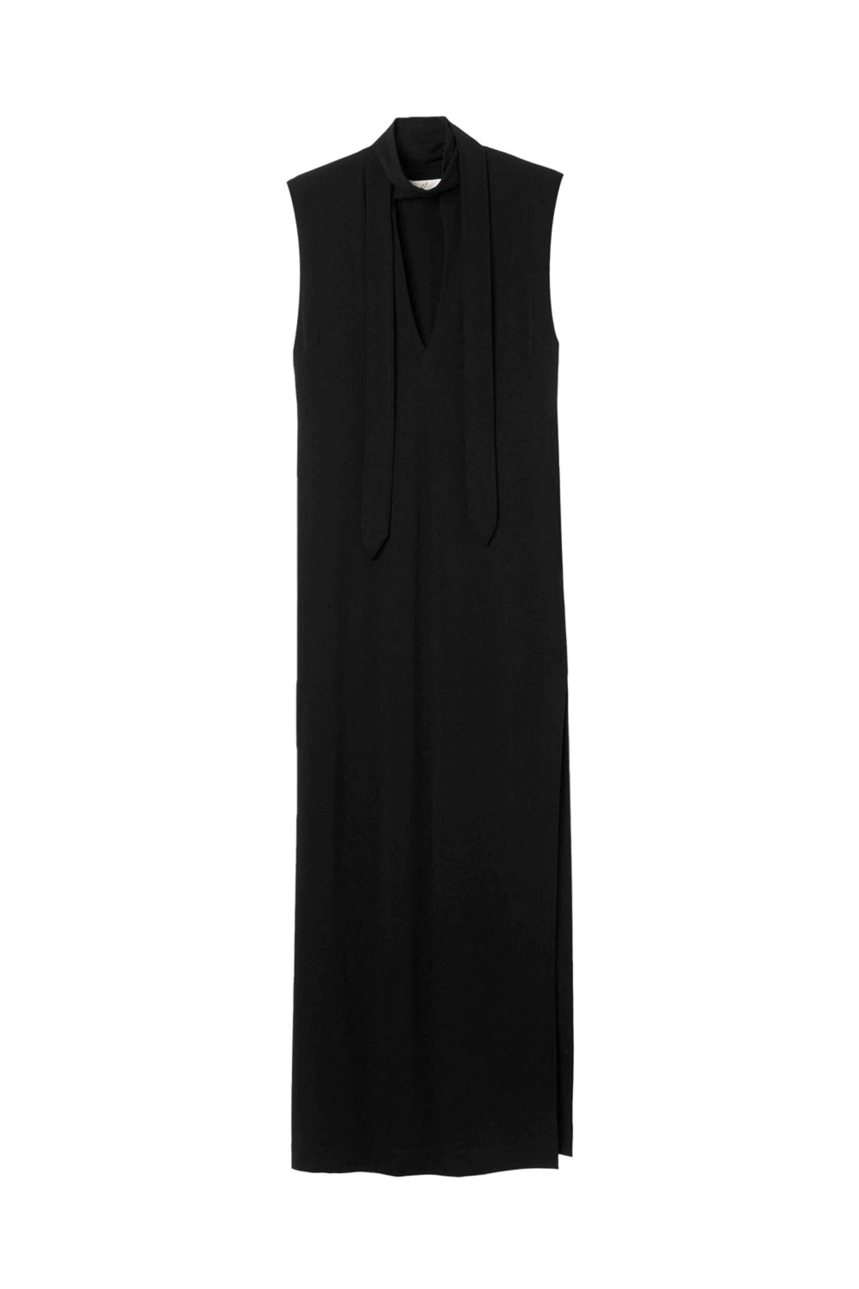 BITE Studios Black La Nuit Scarf Dress. High neck; deep v keyhole cutout. Wrap neck detail. Sleeveless. Columnar silhouette. Maxi length. Side hem slits. Jersey fabrication. 98% viscose, 2% elastane.