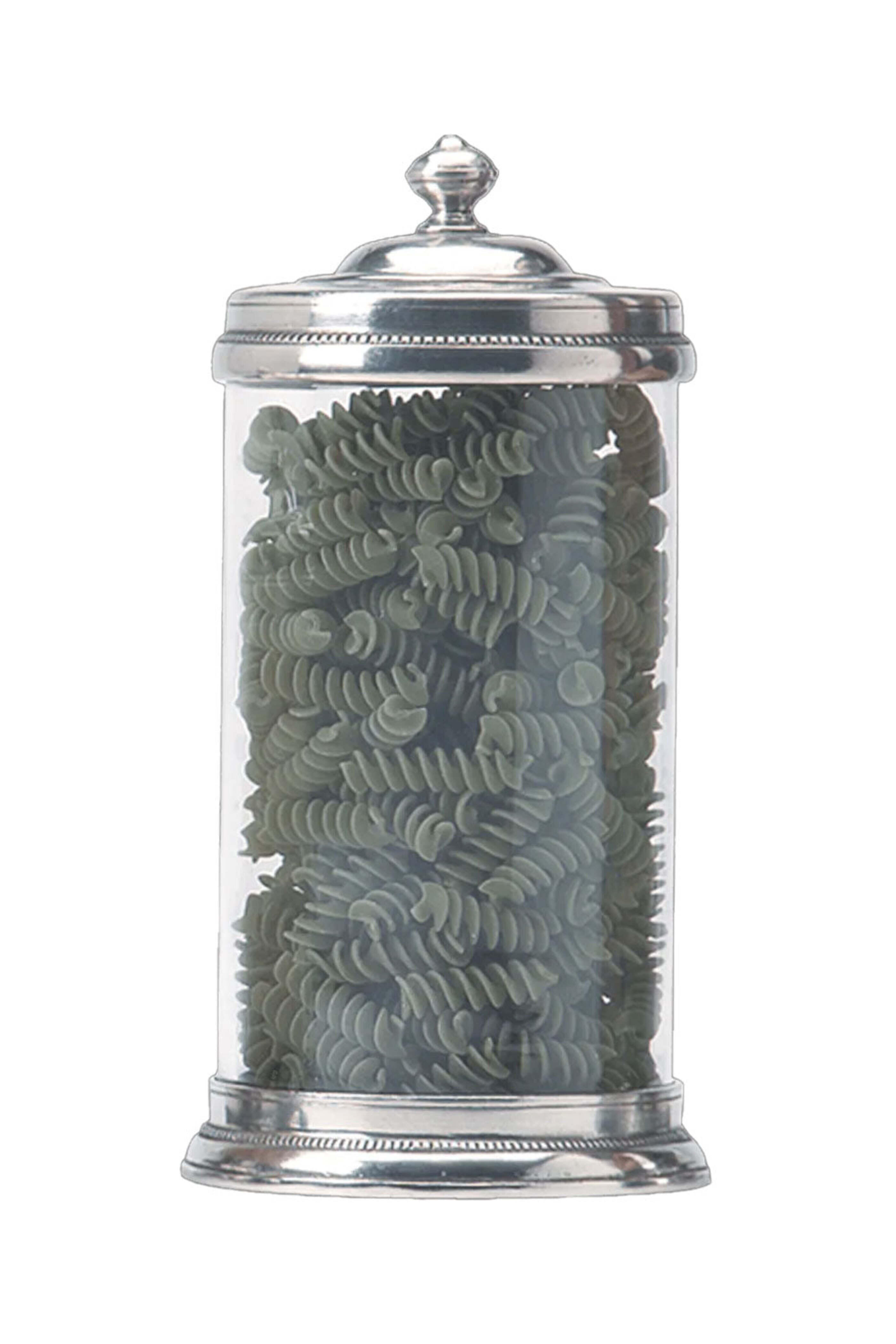 Match Large Glass Canister. Pewter lid and base. Glass canister. 4.7€Dia x 10€H. Made in Italy. Hand wash.