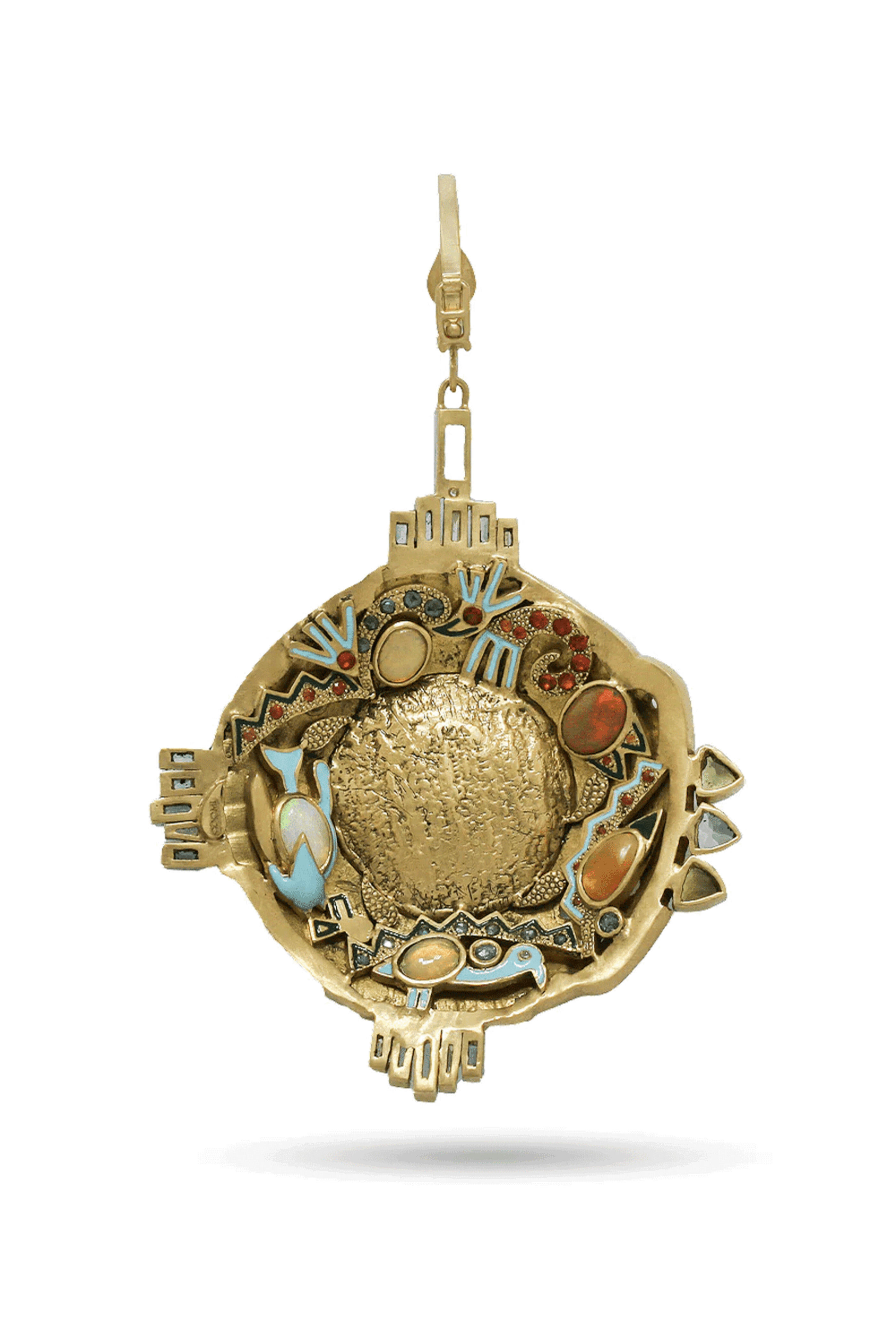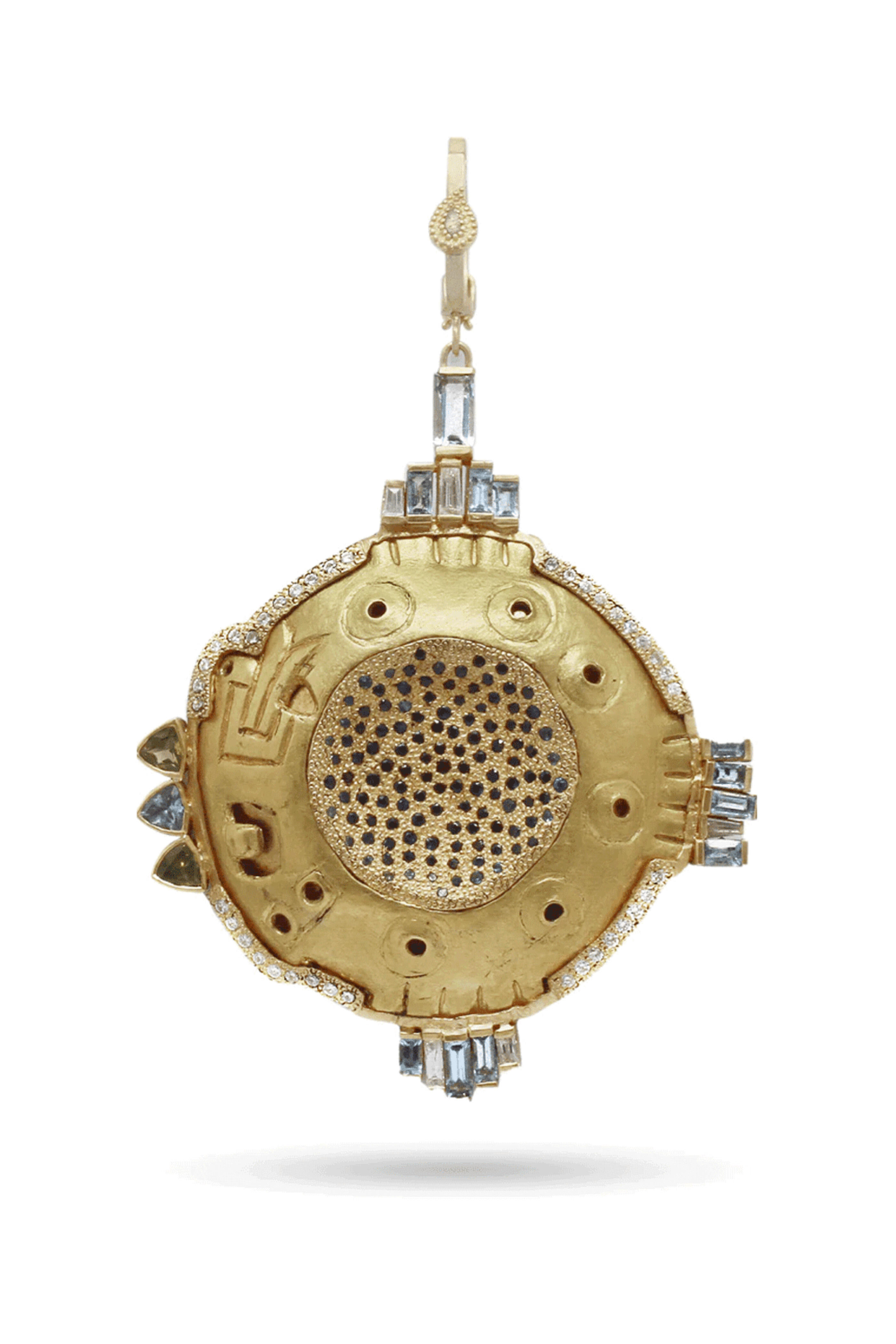 20k gold. Diamond 1.00 total carat weight. Aquamarine 1.53 total carat weight. Green sapphire 0.56 total carat weight. Orange sapphire 0.34 total carat weight. Blue sapphire 1.08 total carat weight. Opal 0.40 total carat weight. Pre-Columbian, Preu, Chavin. 900 to 200 BCE.. Hammered into a round disc with raised, openwork circles on its body to create a pirarucu (known as an arapaima or paiche fish). Latch bail. Handmade.