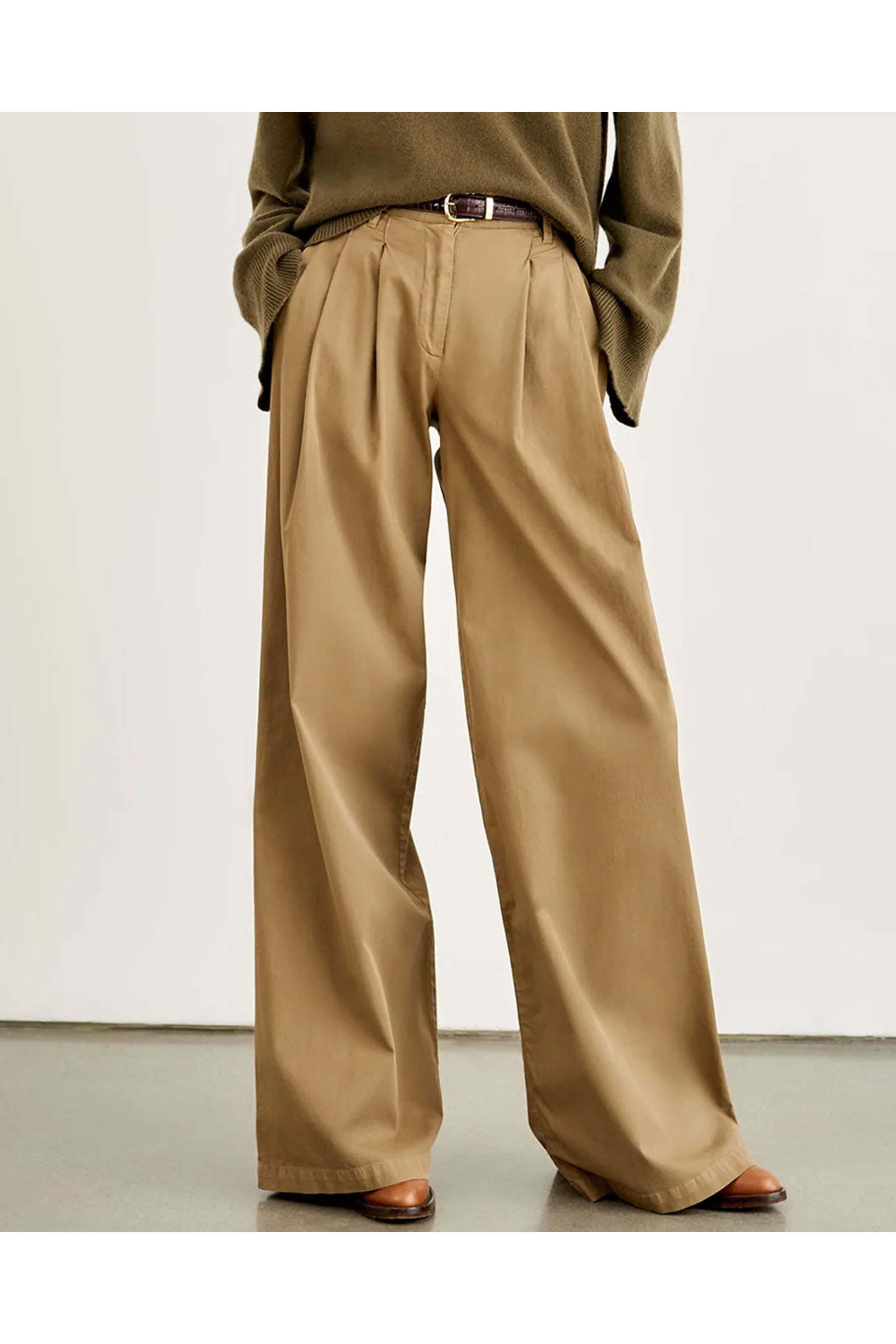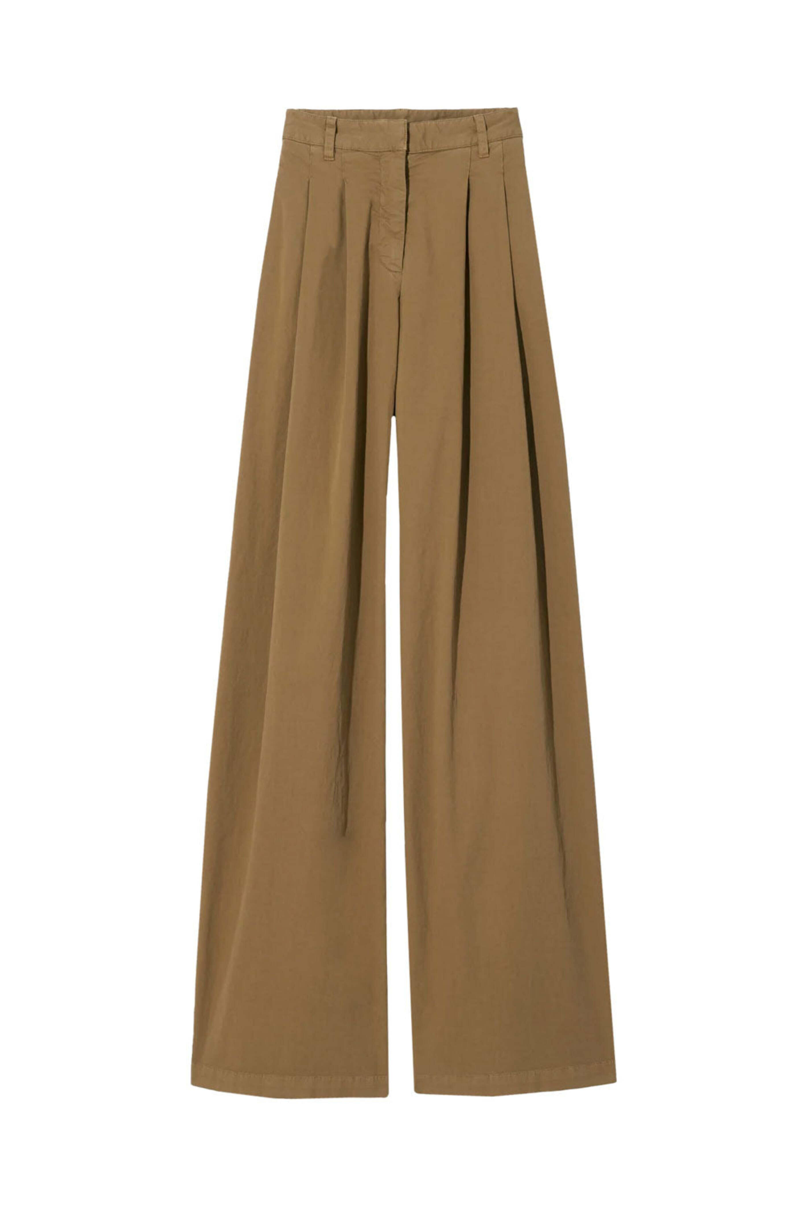 Nili Lotan Bark Wide Leg Dillon Pant. High rise. Hook and eye closure. Zip fly. Belt loops. Side slip pockets. Pleated throughout. Wide leg silhouette. Full length. 97% cotton, 3% elastane.