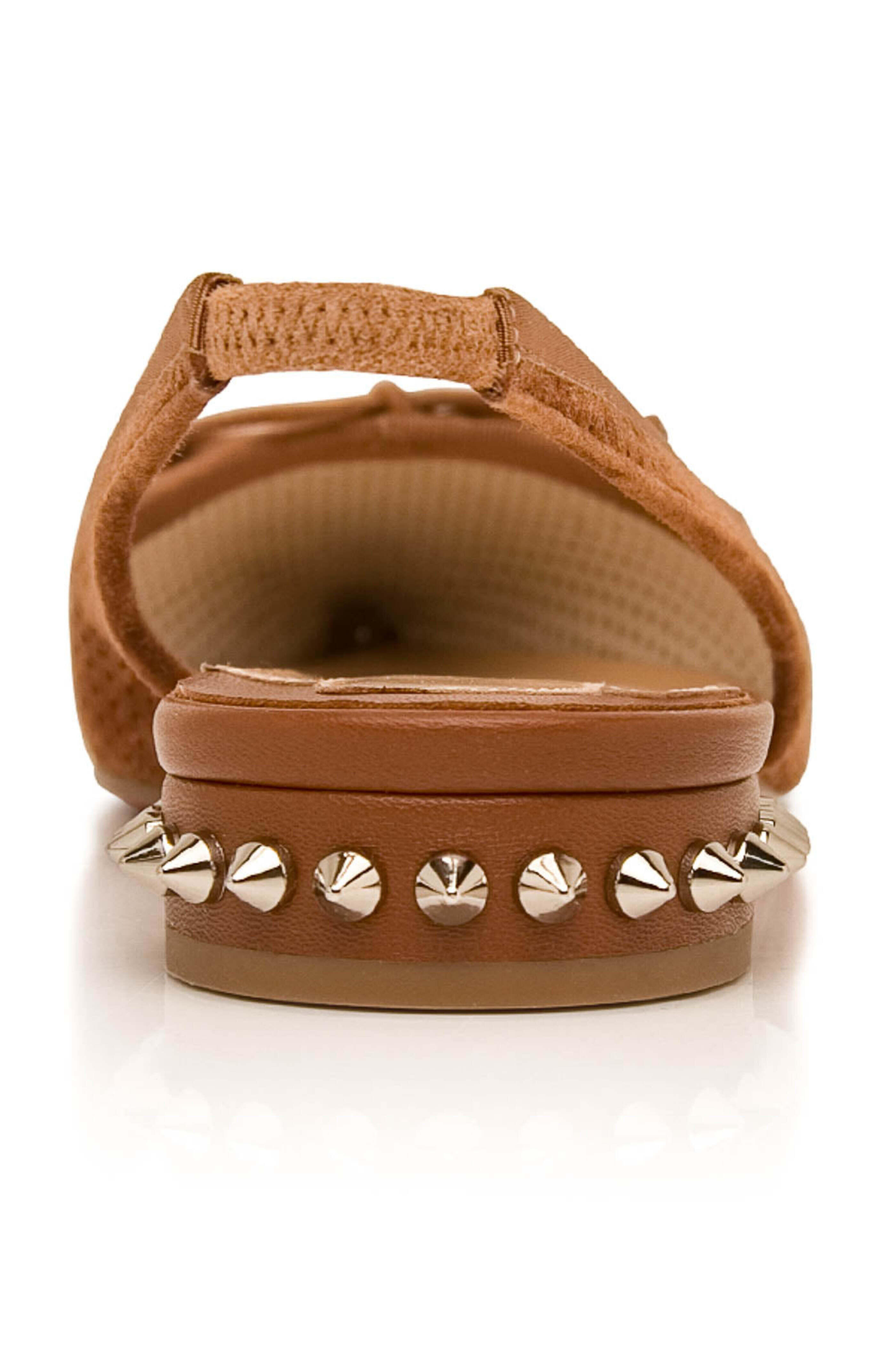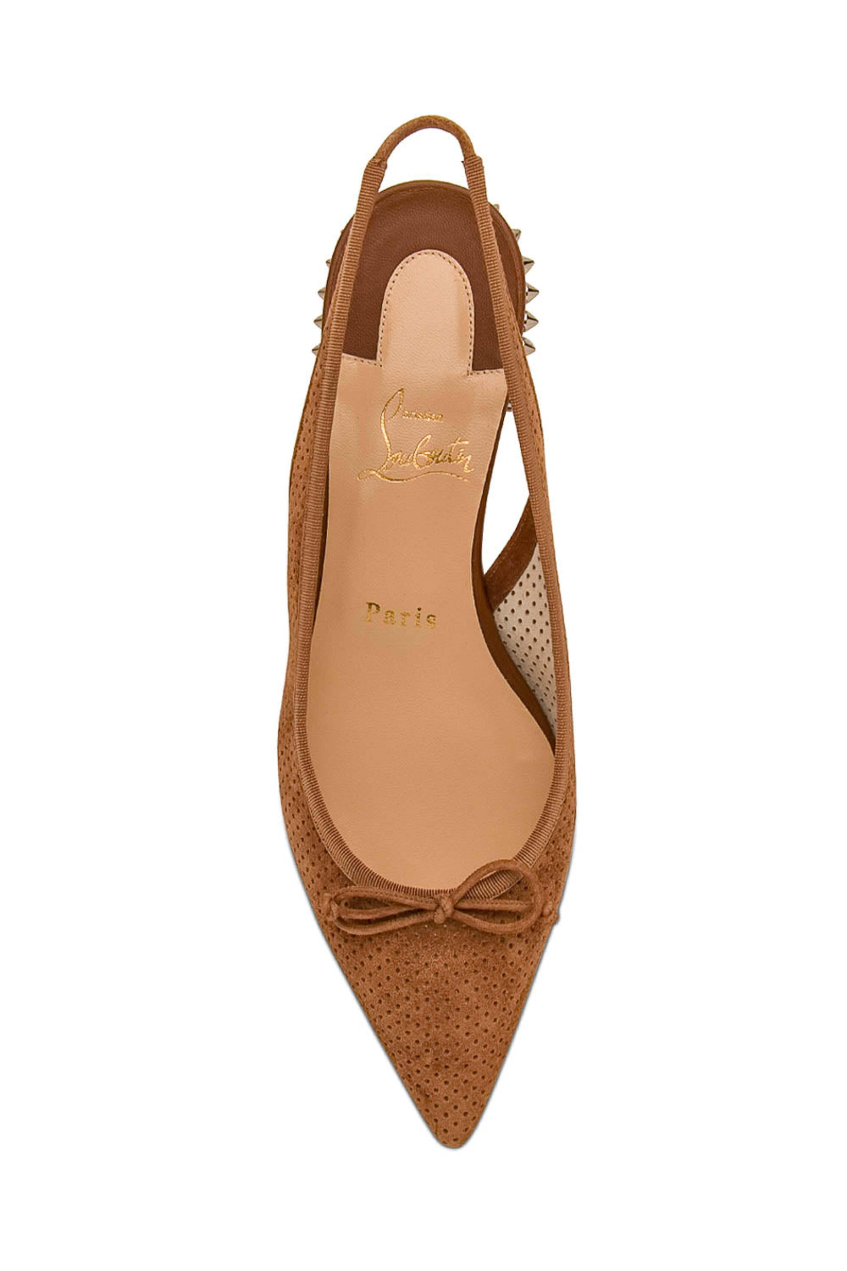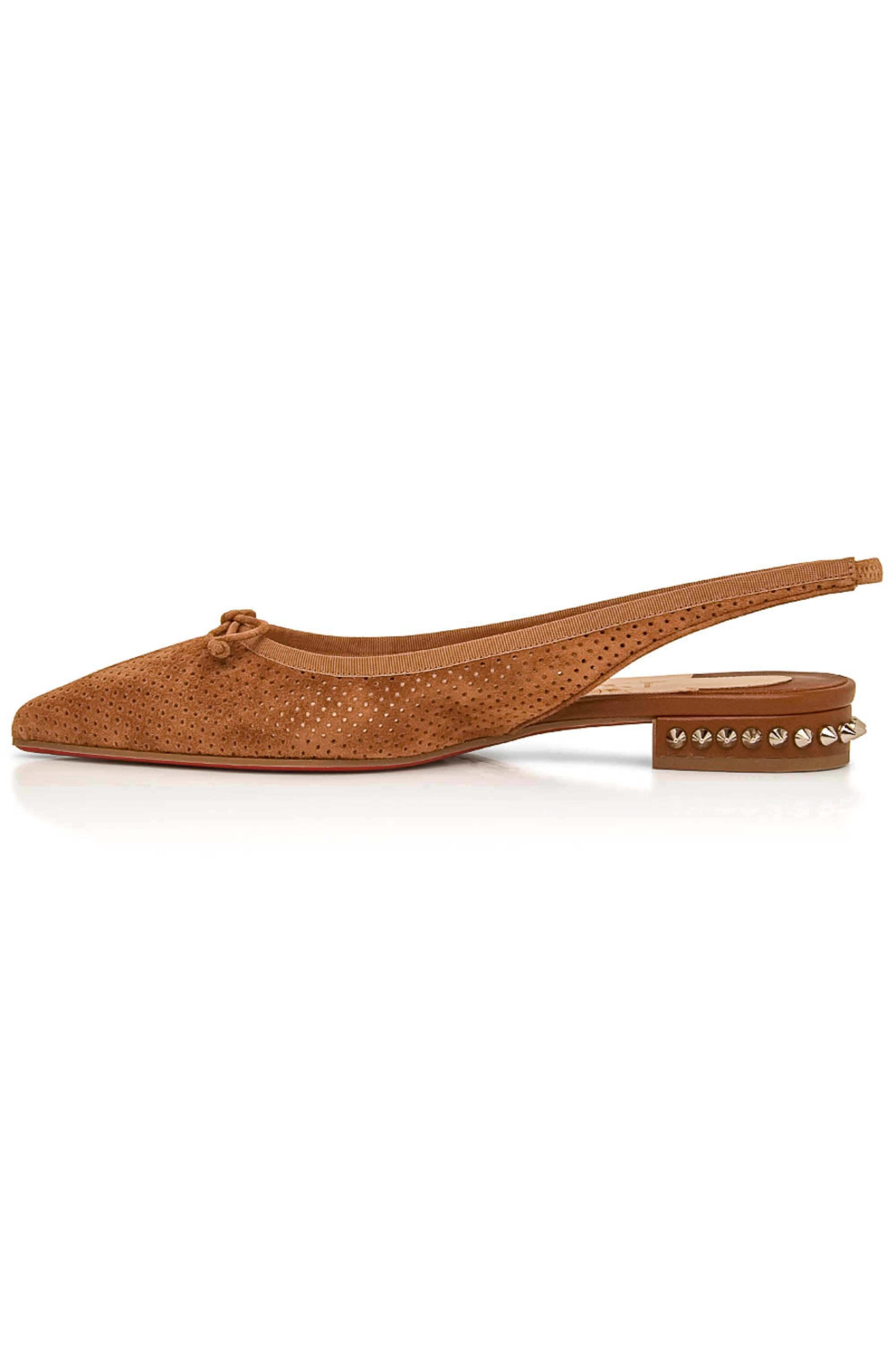 - Christian Louboutin Hall Sling Flat in Biscotto Perforated calfskin suede leather upper Slingback ankle strap Pointy toe Spike accents at heel Bow accent Grosgrain edging Leather lining and insole Padded footbed Signature red leather sole 0.75 heel Made in Italy