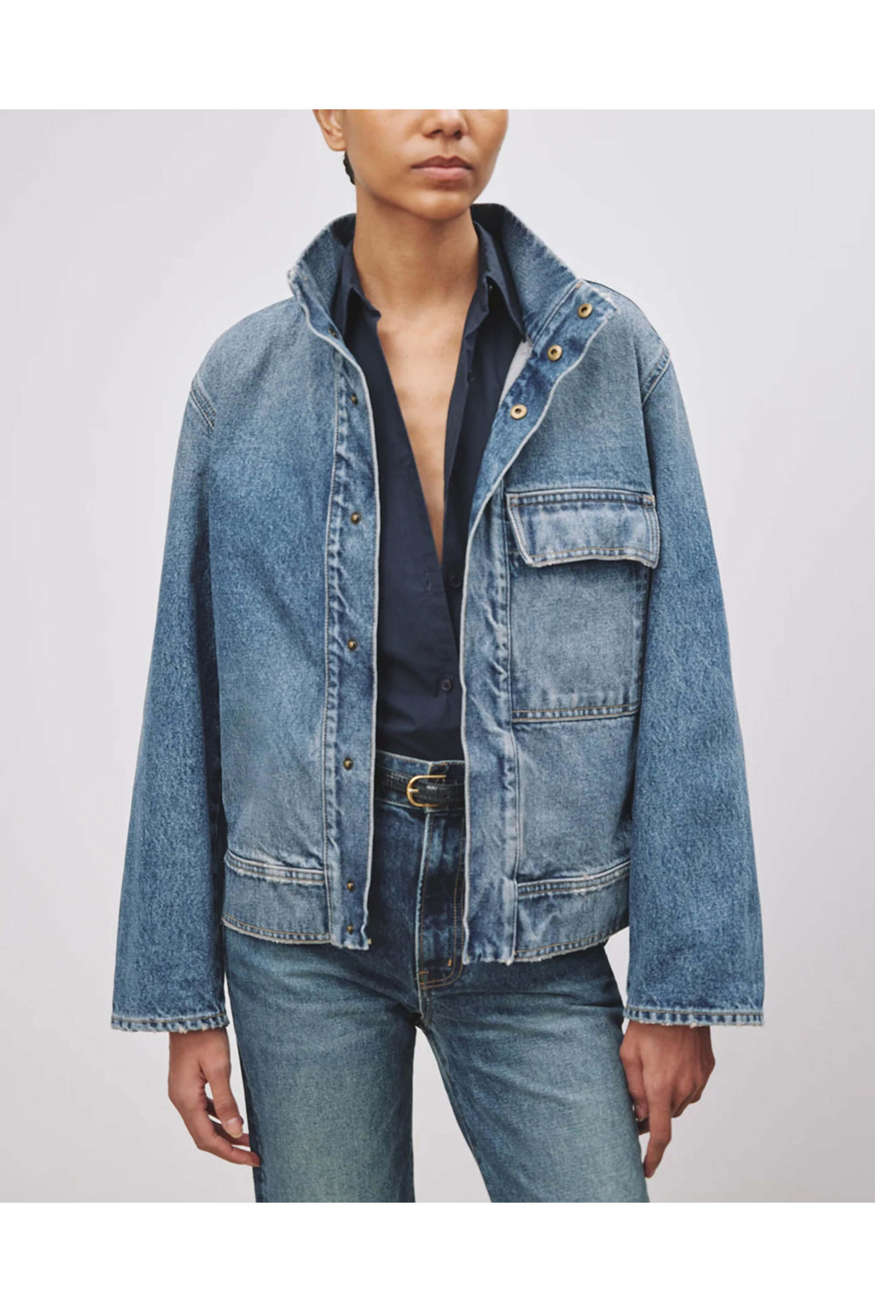 Stand collar. Long sleeves. Concealed snap button closure. Single chest flap pocket. Relaxed fit. Nili Lotan Marilou Denim Jacket in Ocean Wash. 100% cotton.