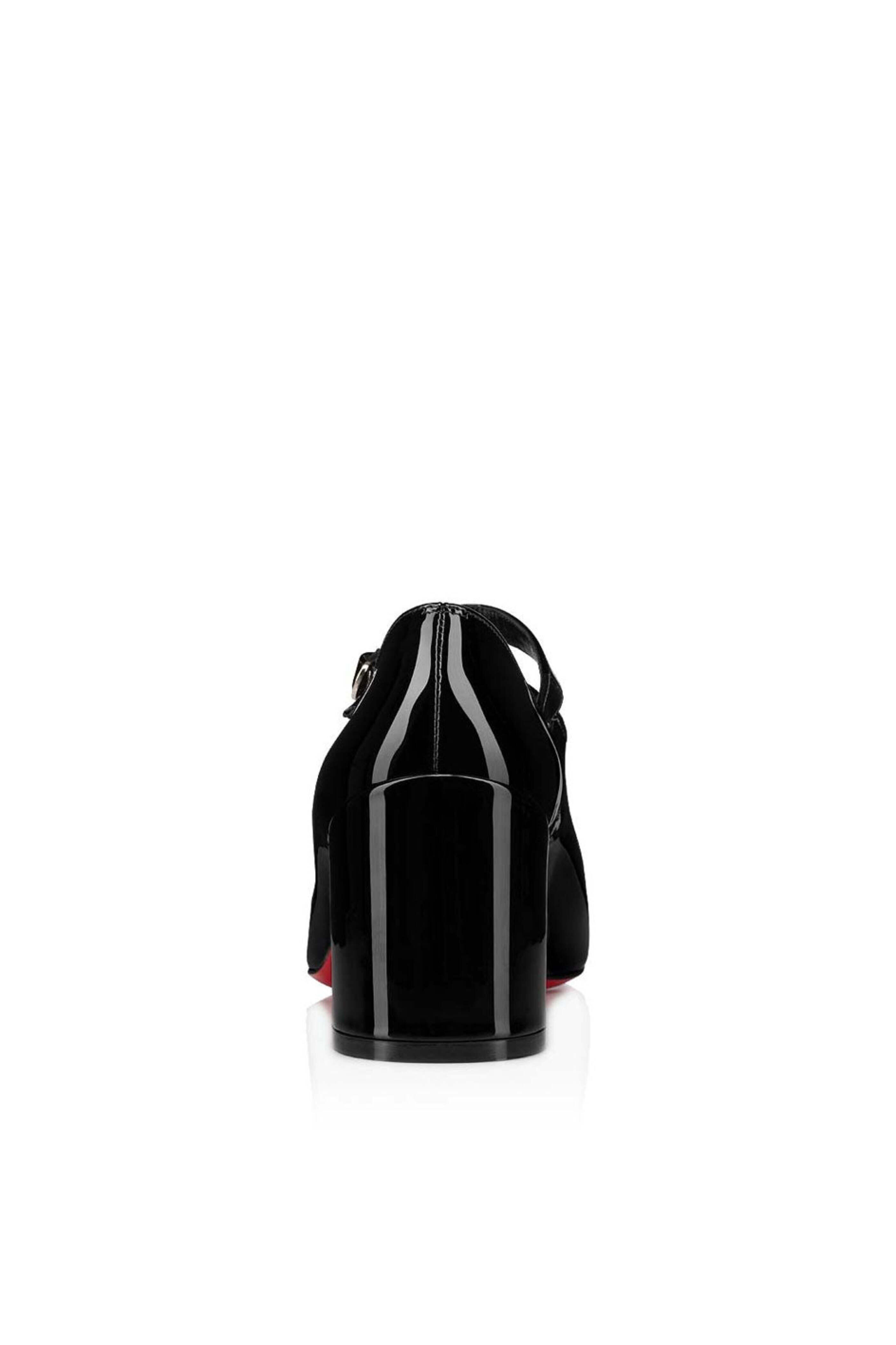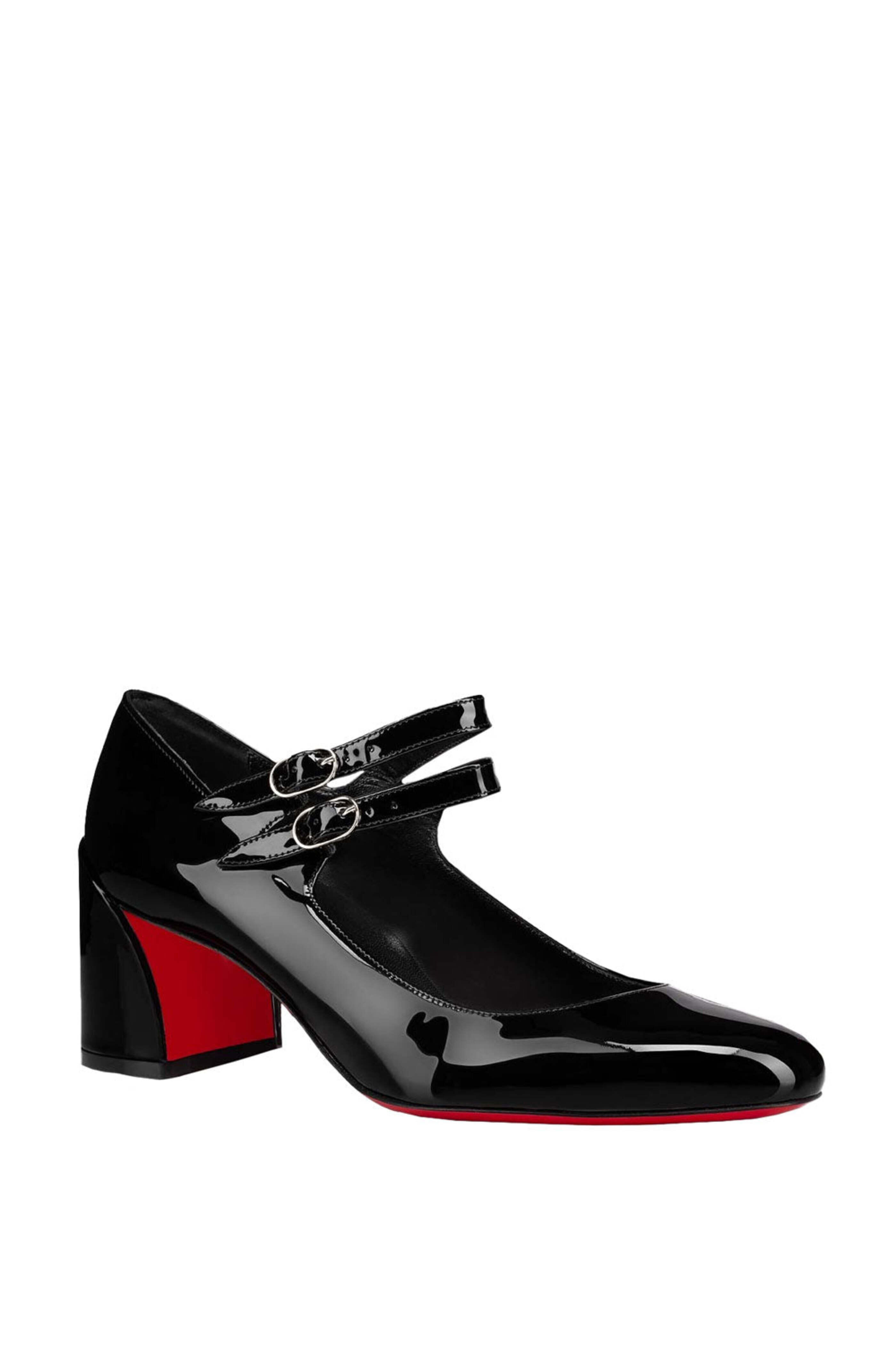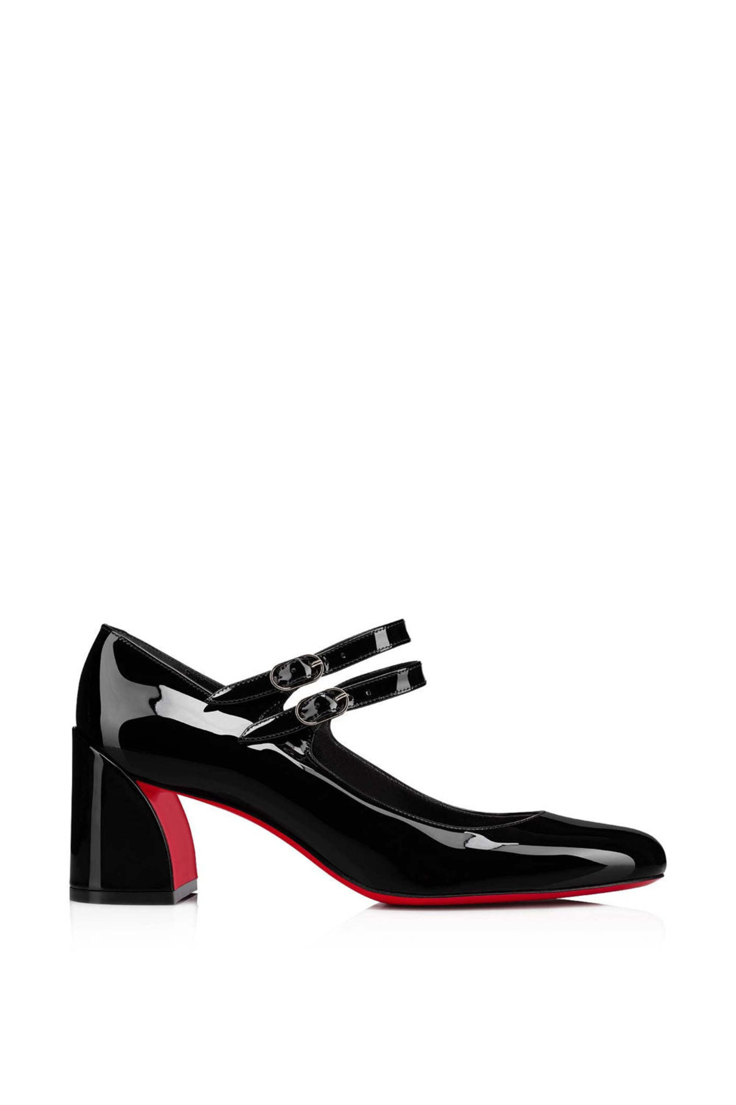 Patent leather outer. Closed round toe. Dual buckle fastening. Leather lining and sole. Block heel. Signature red leather sole. Made in Italy. Heel height: 55mm.