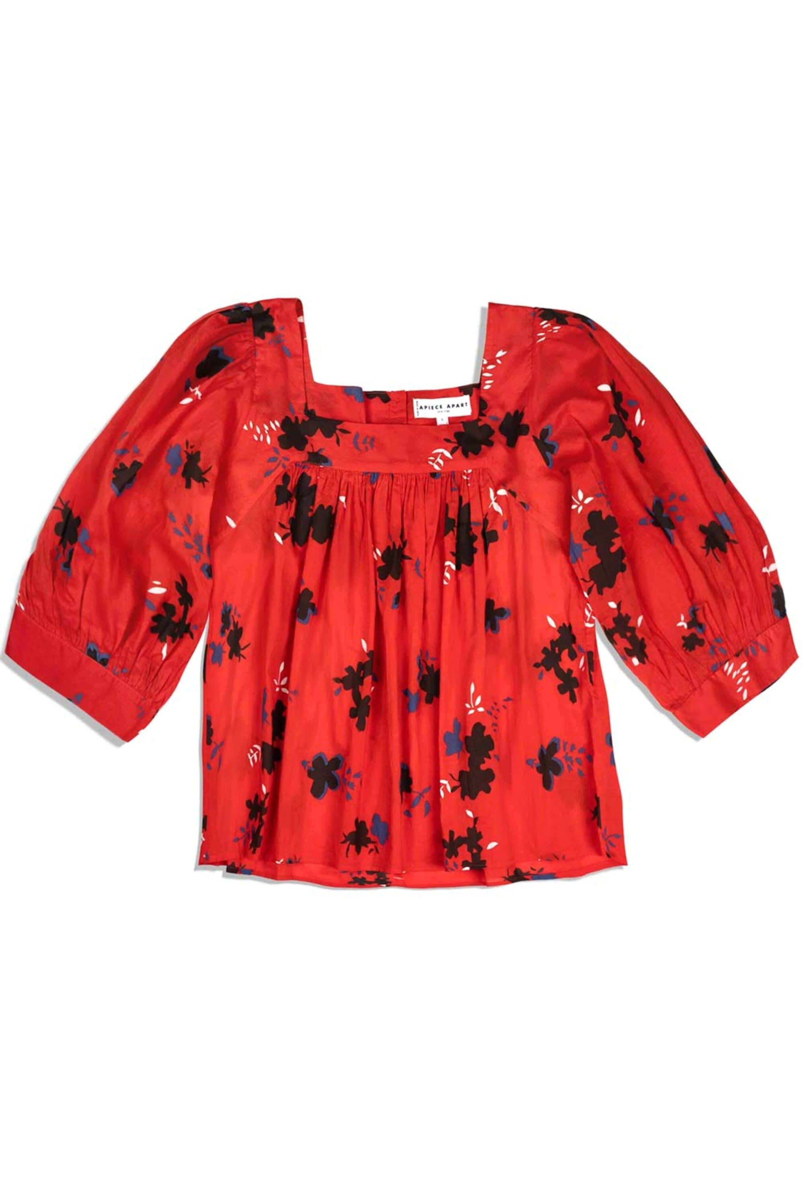 - Apiece Apart Red Aster Floral Zinnia Top Square neck ¾ length puff sleeves; banded cuffs Back quarter button placket Relaxed fit Unlined 100% organic cotton