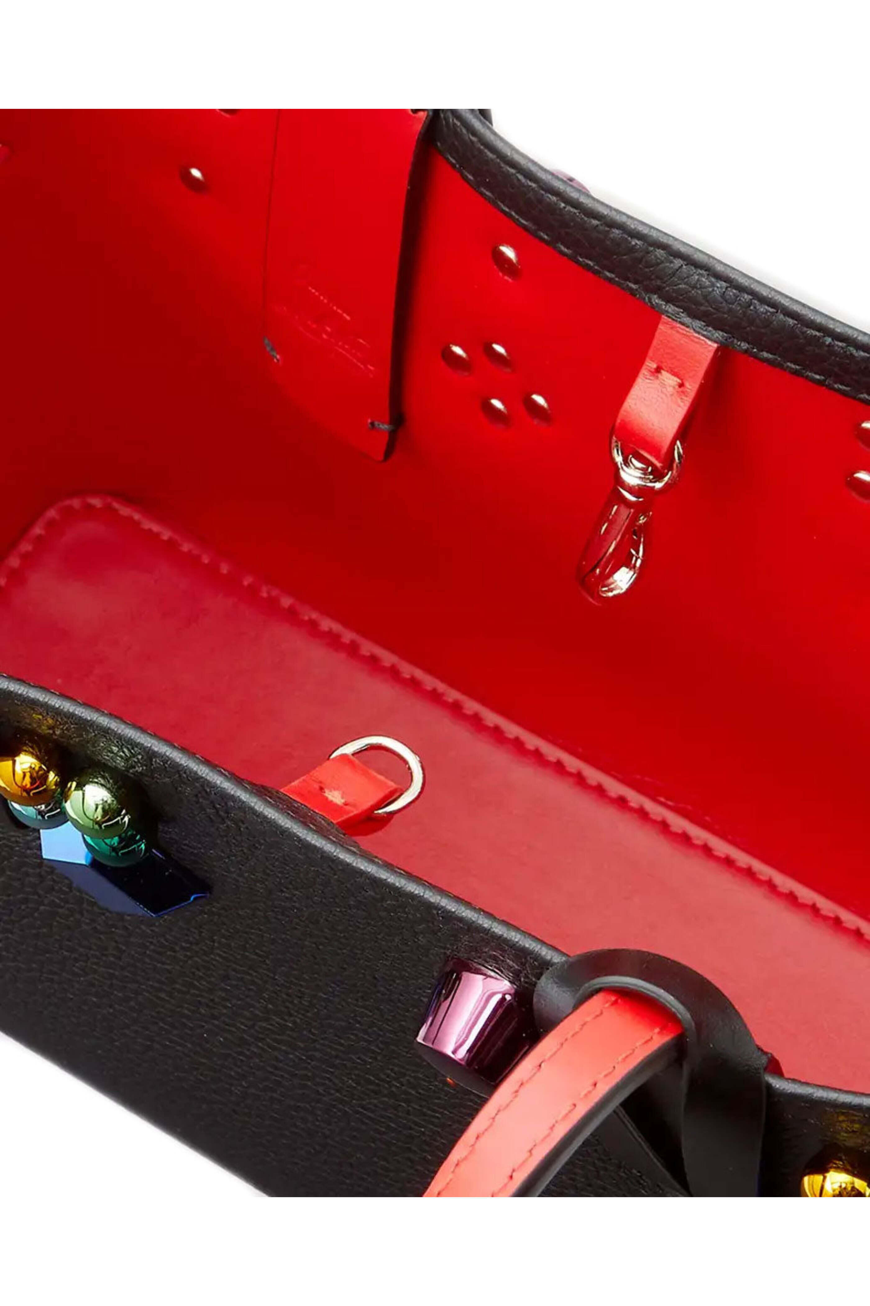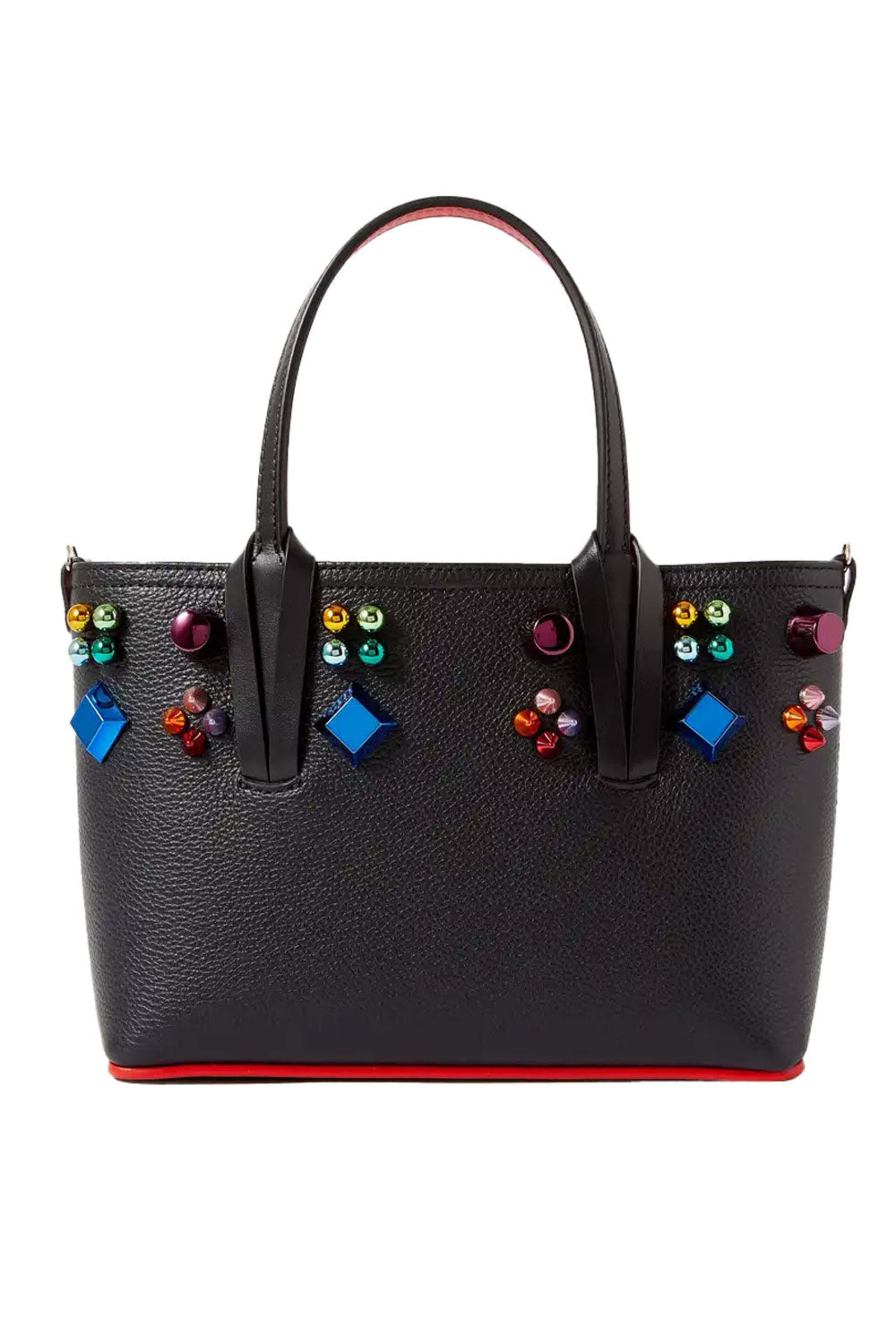 Christian Louboutin Mini Cabata Tote in Black Multi. Clasp fastening at top. Top carry handles. Structured silhouette with flat base. Spike and embellished details. Leather upper. Signature red lining. 9.1 x 6.7 x 3.1. 4.7 handle drop. Made in Italy.