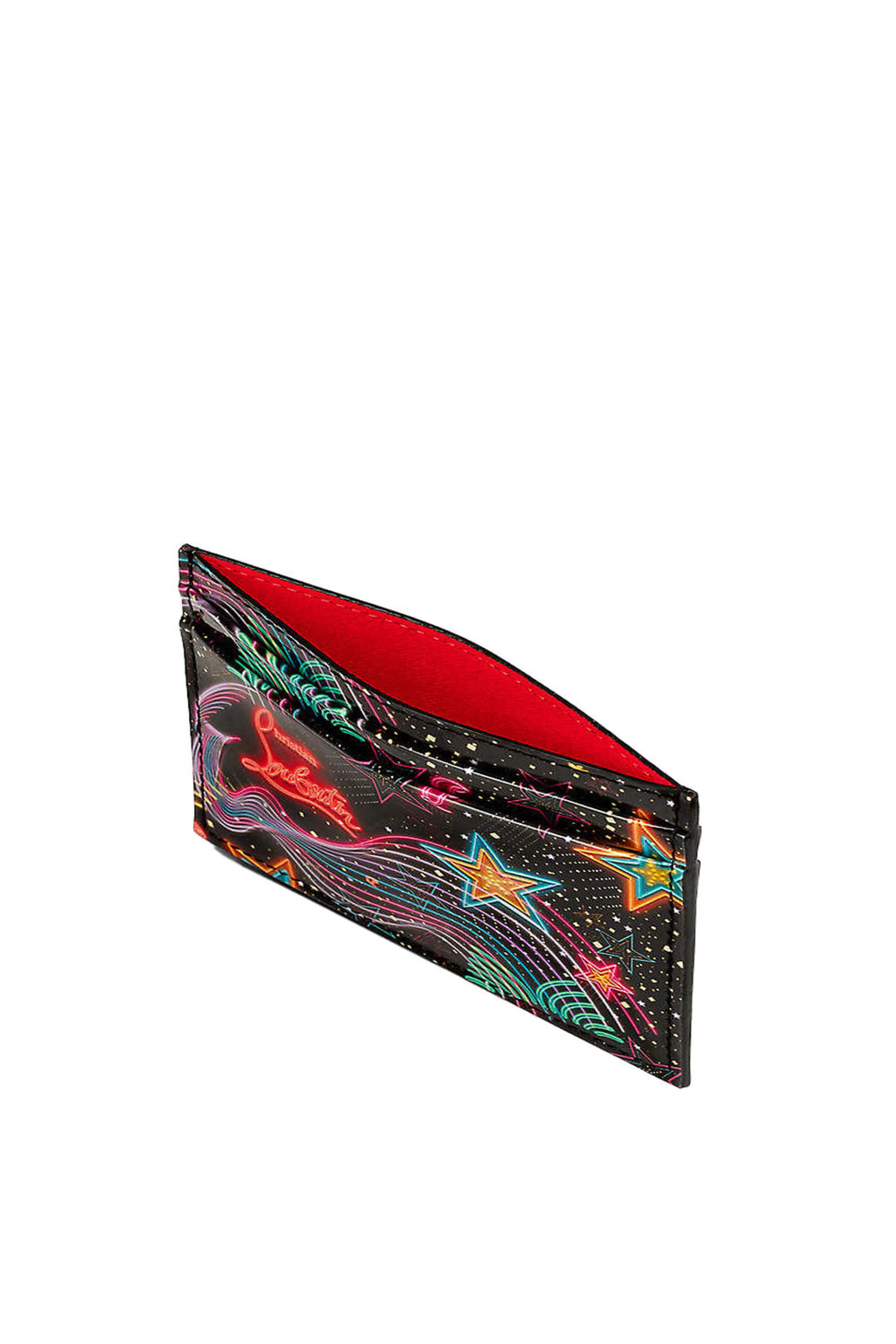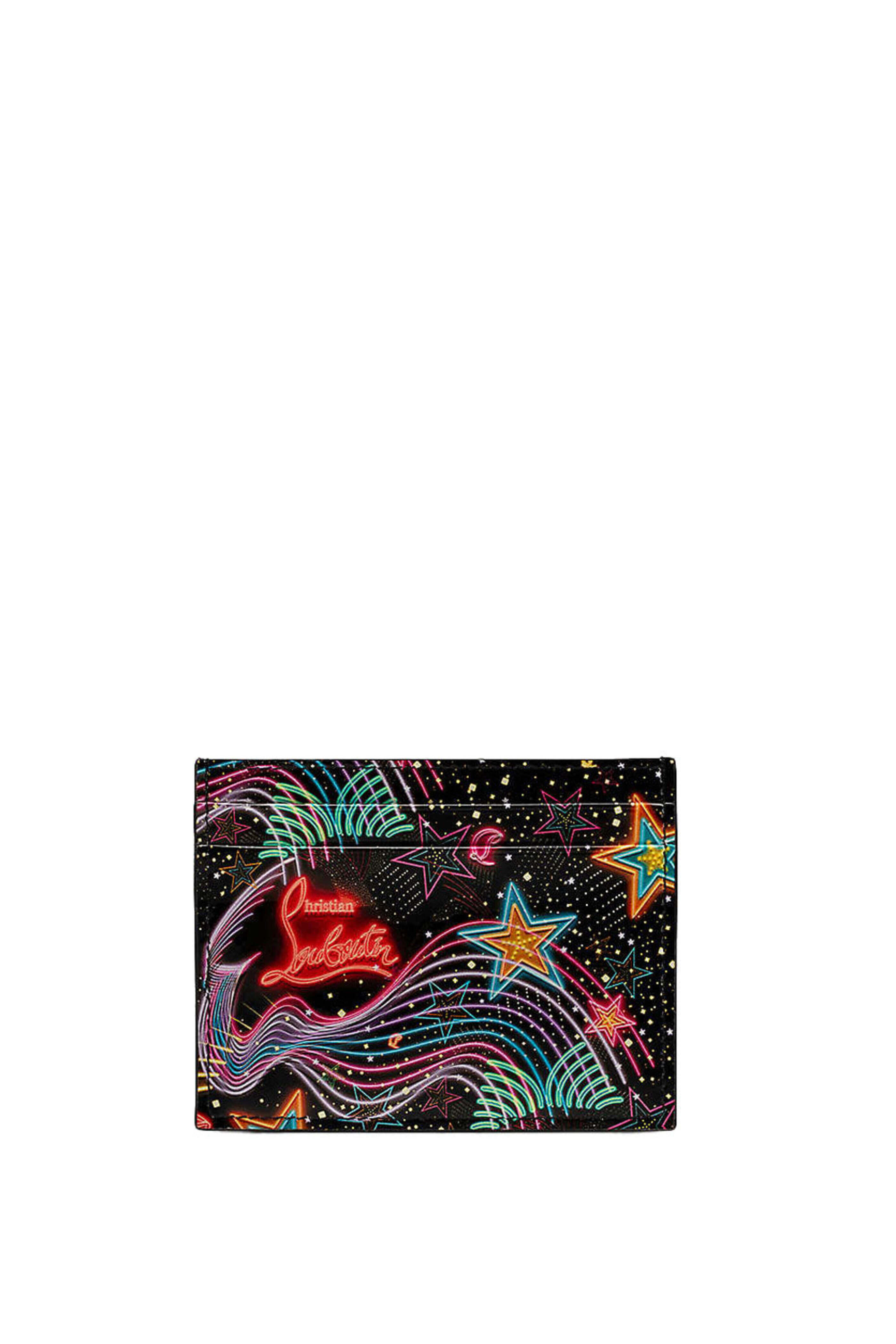 Christian Louboutin Kios Patent Print Starlight in Black Multi. Central slip pocket. 2 card slots at front and back. Rectangle shape. Printed logo at front. Debossed branding at back. Patent leather outer. Leather lining. .5W x 3H x .2D. Made in Italy.