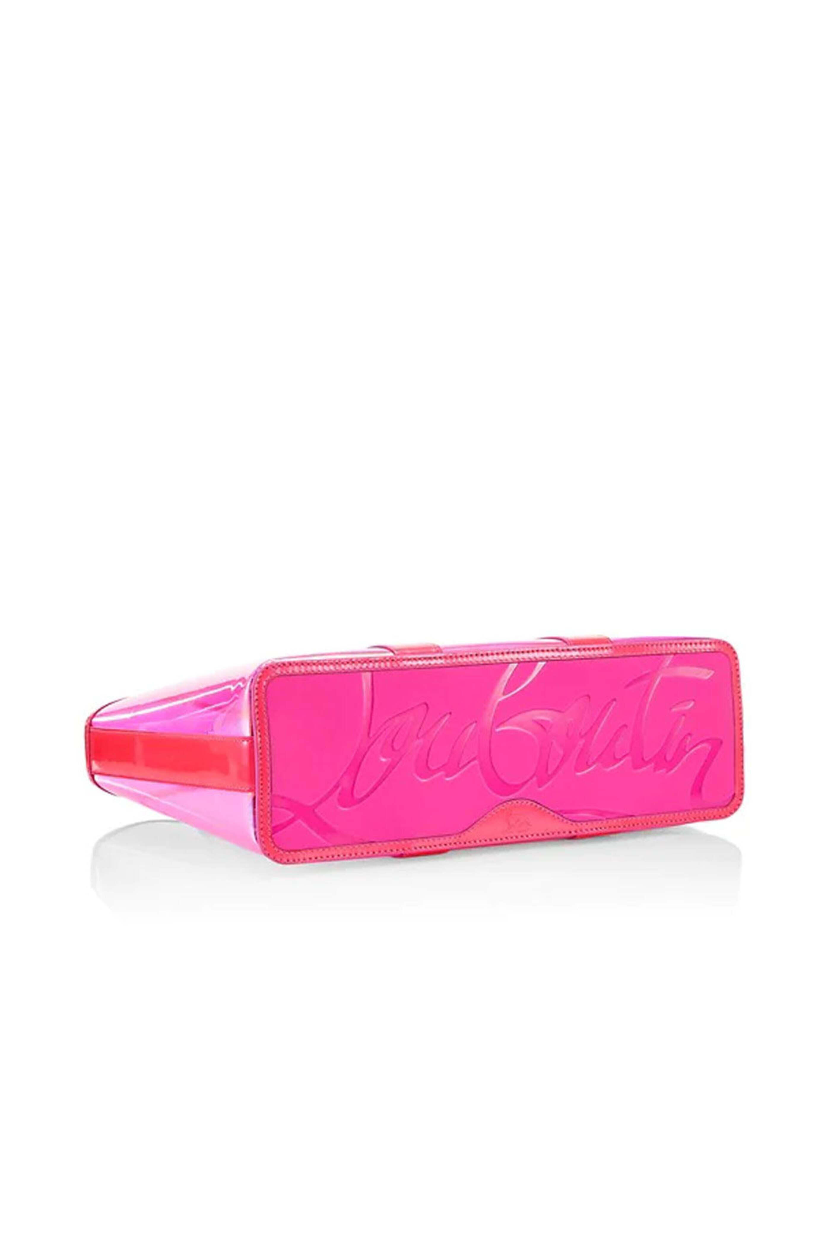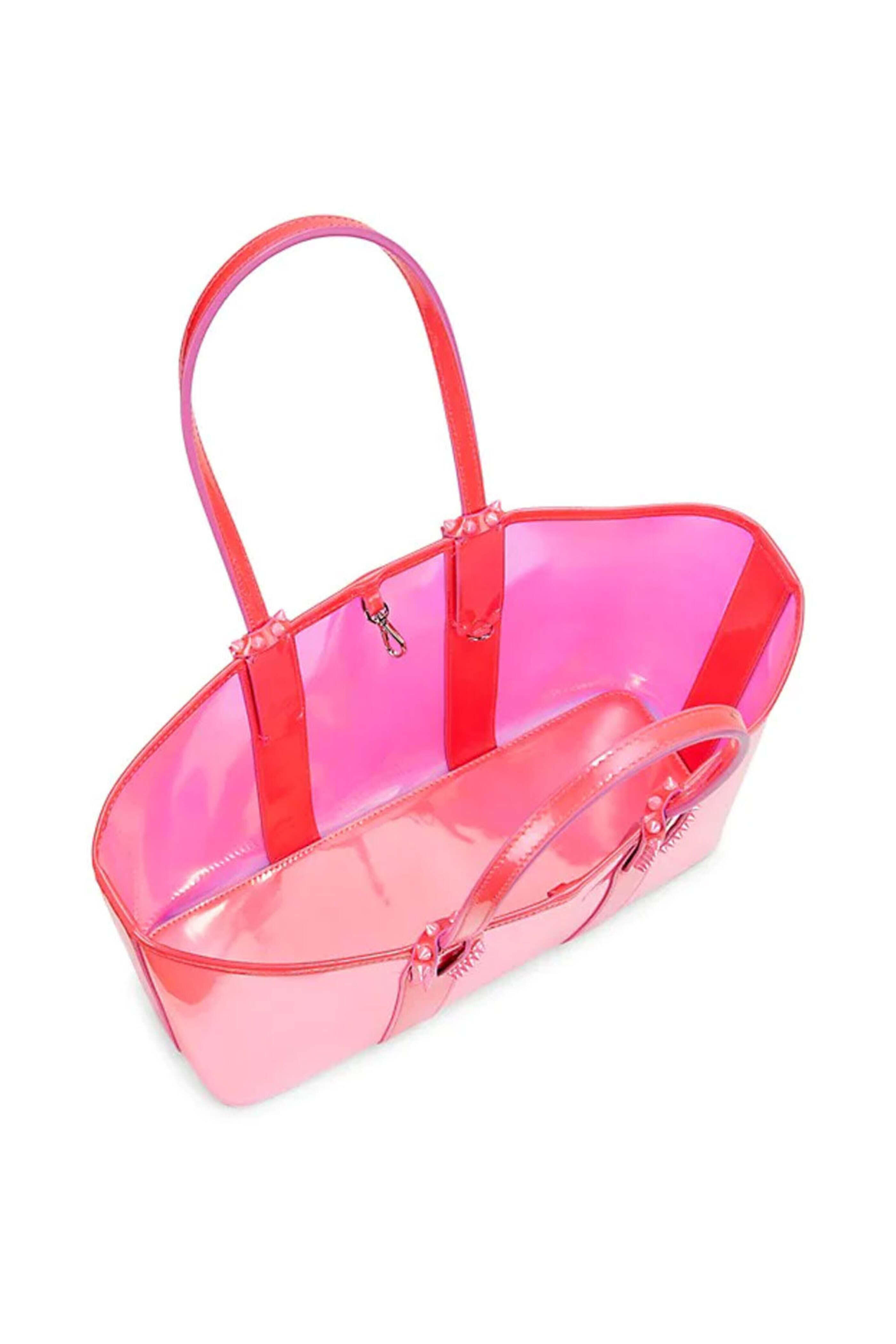 Christian Louboutin Cabata Small Tote Bag in Rose Pink. Open top with bridge clip closure. Double shoulder straps. Removable zip pouch. Spike detail on handles. Pink PVC and patent leather outer and lining. Rubber sneaker sole. 13.5 W X 9.5 H X 5 D. 8 strap drop. Made in Italy.